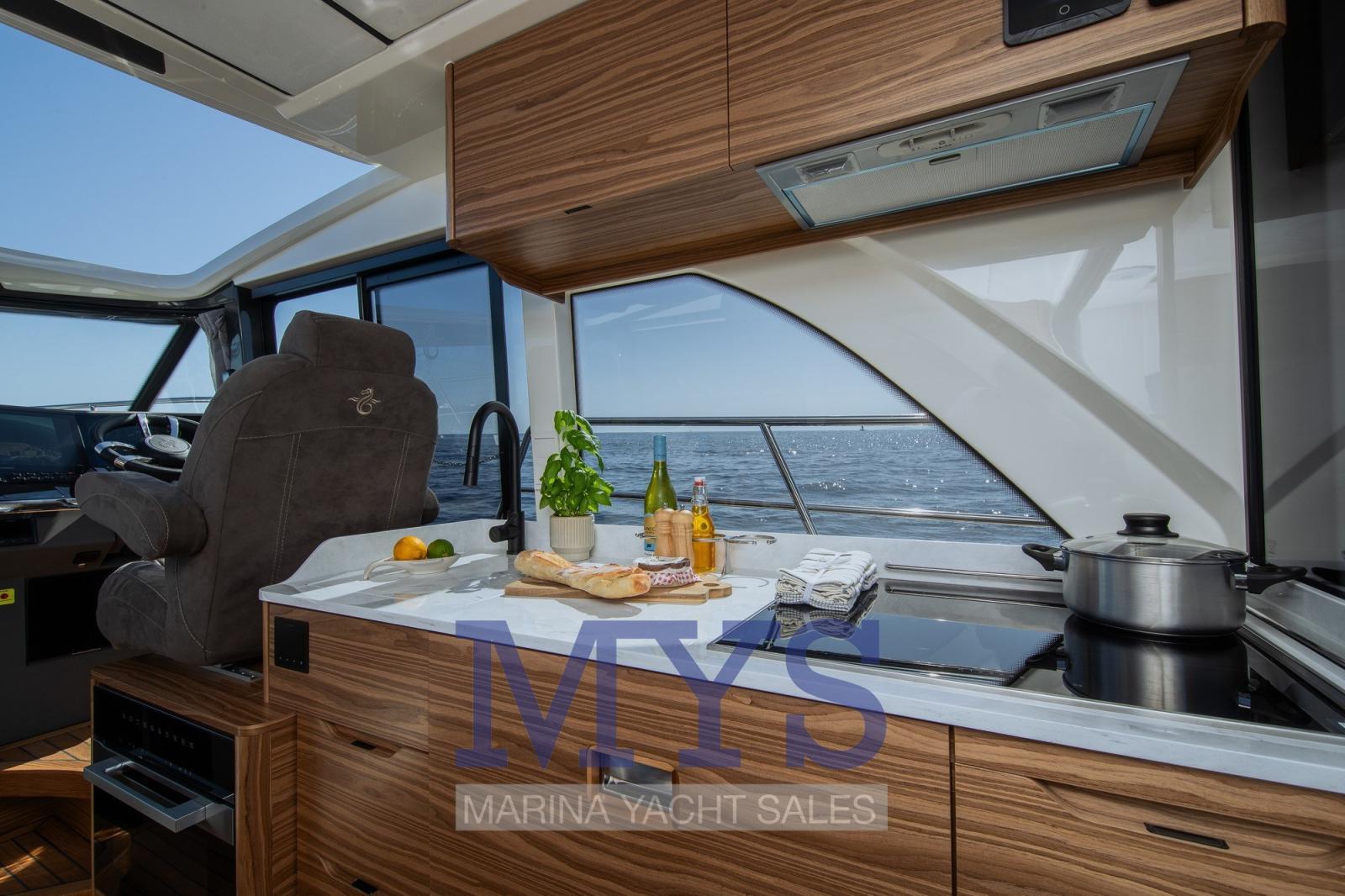 Cuisine sur le pont principal sur le côté droit avec évier, réfrigérateur et four