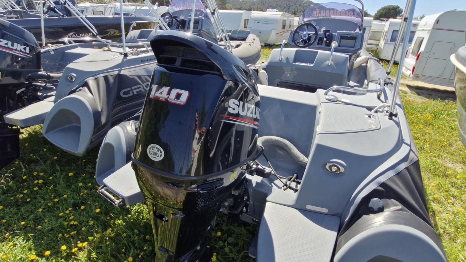 Grand Boat G580 Golden Line, Suzuki 140cv révisé et entretenu. Bain de soleil avant et arrière, Bimini, table, échelle de bain, armement côtier inclus....REPRISE, FINANCEMENT ET PLACE DE PORT POSSIBLES. Contact : Frédéric : 06.13.19.41.59