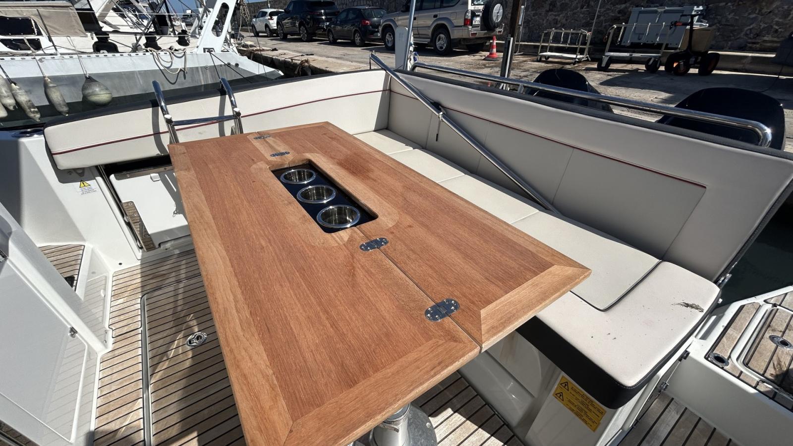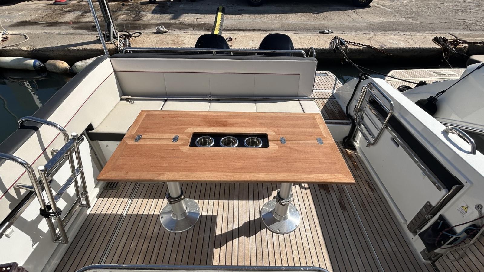 Équipé d’un T-Top élégant, d’un cockpit en teck, d’un vaste bain de soleil modulable, propulseur d’étrave, plateforme de bain latérale inclinable