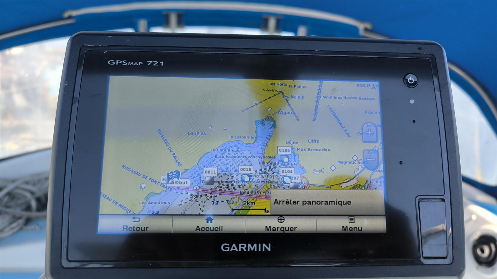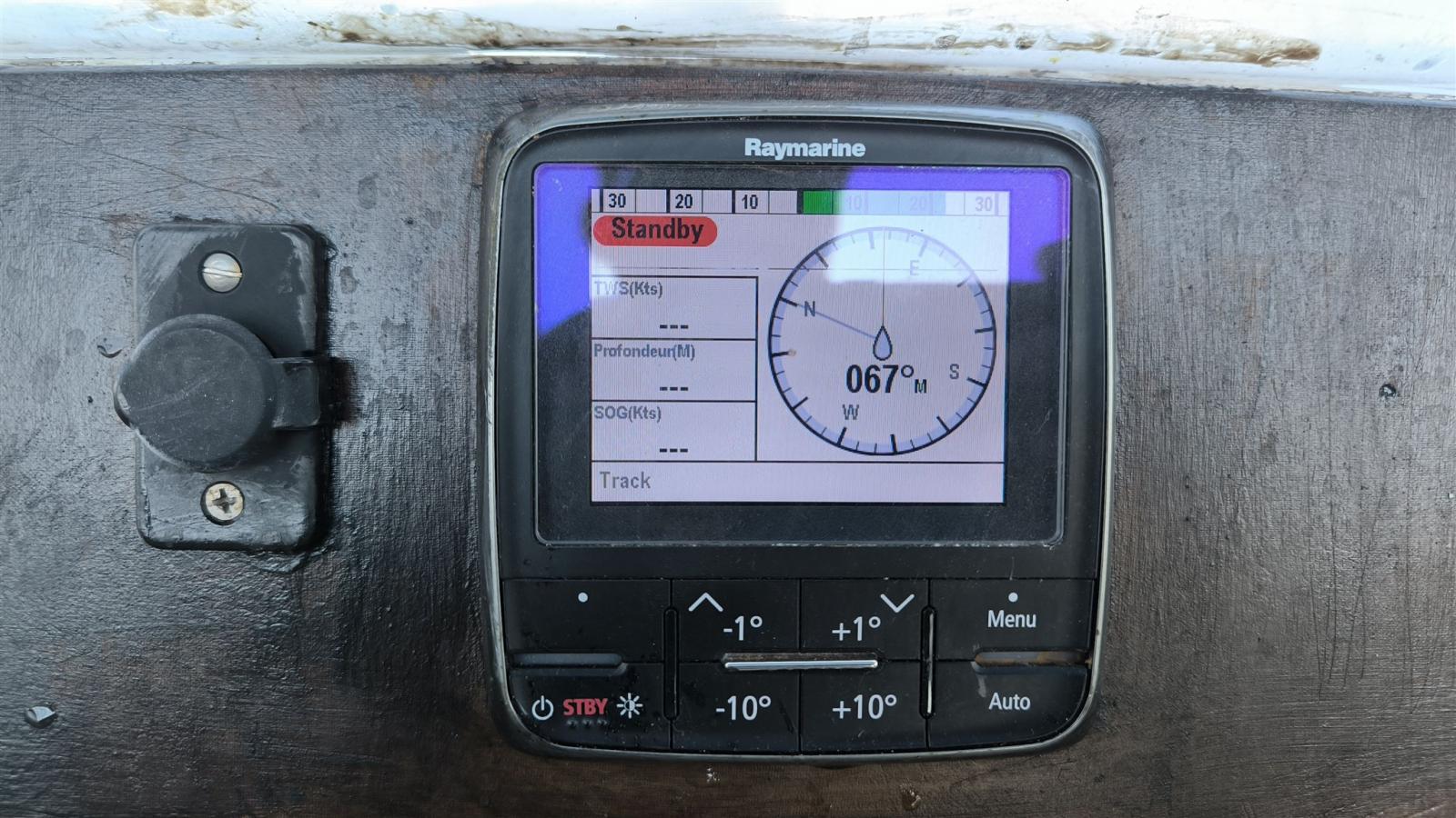 DSC VHF (NAVICOM RT550), GPS (FURUNO GP), Pilote automatique (hydraulique, + calculateur remplacé ACU400 et pupitre P70), Lecteur de cartes (GARMIN GPS MAP 721), Sondeur.