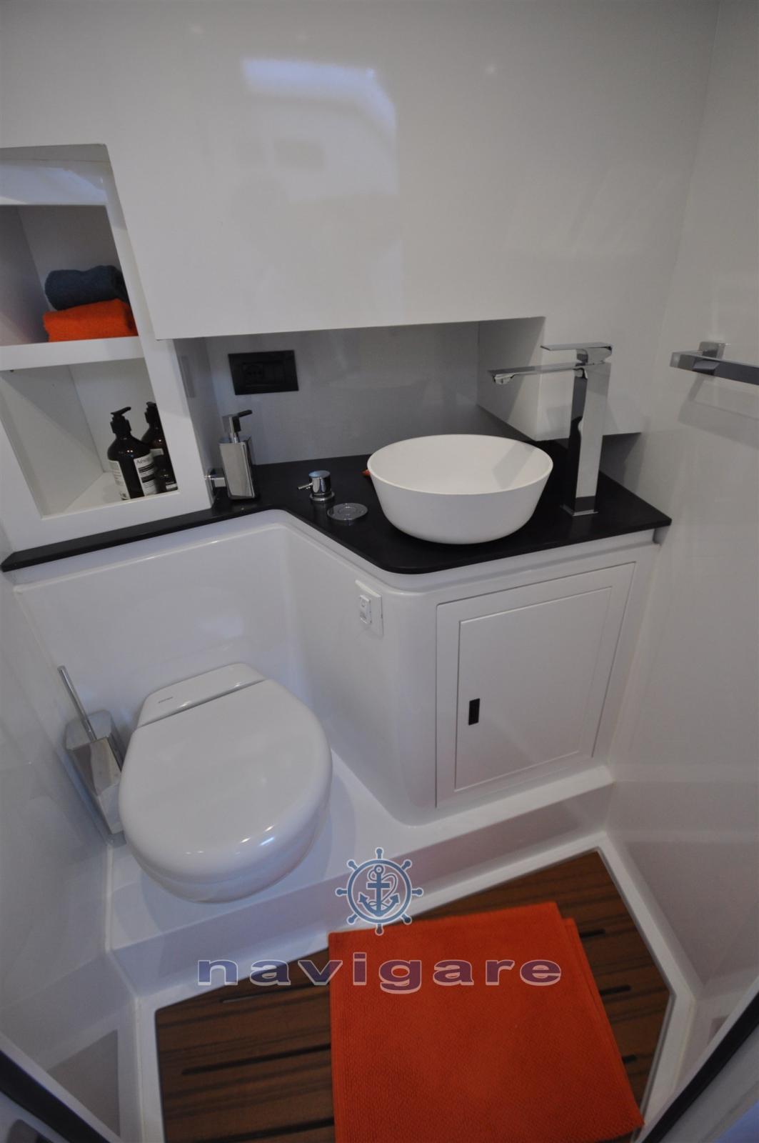 WC/SALLE DE BAINS • Lavabo avec robinet d’eau chaude et froide • Douche avec eau chaude/froide* • Miroir • WC électrique • Unité sous évier • Prise pour rasoir/sèche-cheveux 230V.• Éclairage d’ambiance• Pompe de vidange automatique. • Hublot de pont