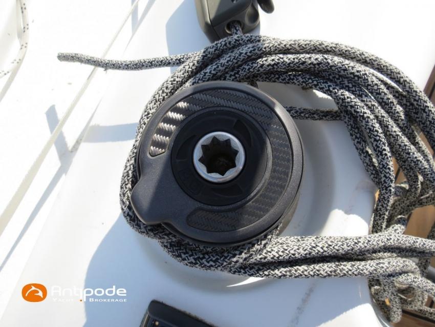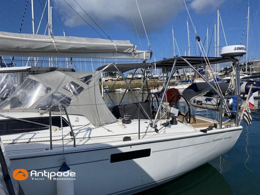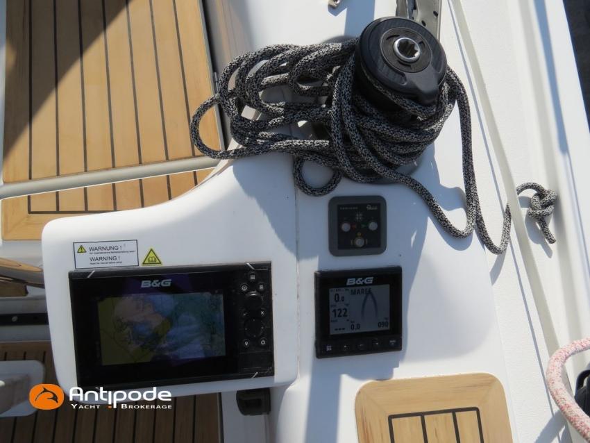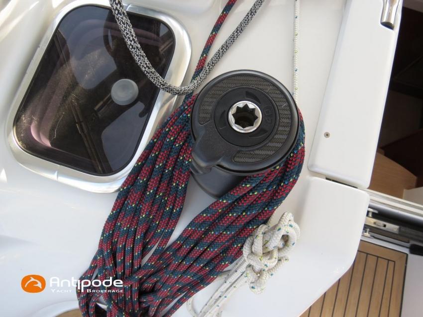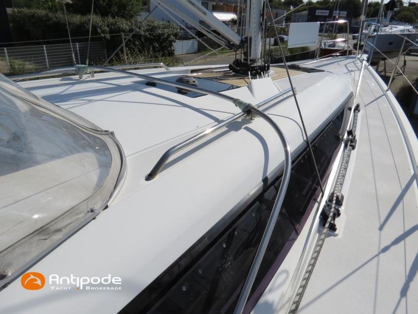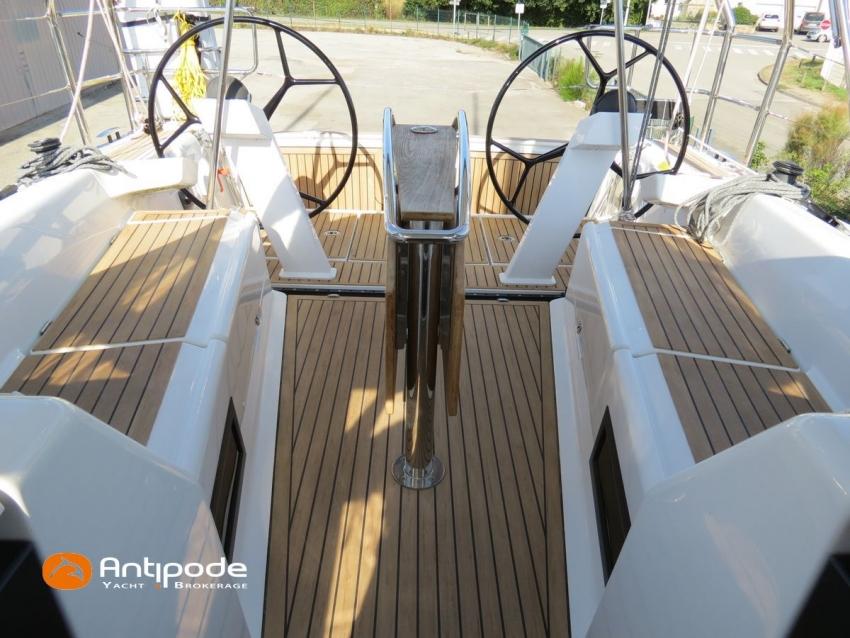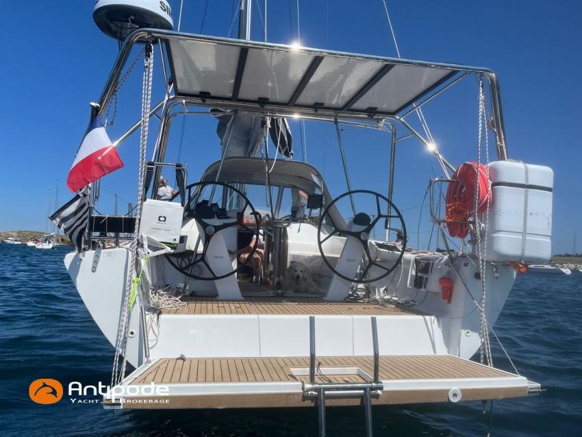 DEHLER 38 SQ, 2021, VOLVO D2-40, 40 cv (346 h), Propulseur d'étrave, Version d'aménagement intérieur 1 cabine avant, 2 cabines arrière, 2 winchs d'écoutes de génois dans le cockpit - Lewmar 46ST, 2 winchs d'écoute de grand voile (german sheet) - Lewmar 40ST, 2 winchs sur roof pour réglages et manoeuvres dont 1 électrique - Lewmar 40ST, Delphinière composite, Support radeau de survie dans les balcons, Dessus de roof Flexyteek, Fond de cockpit Flexyteek, Assises de cockpit Flexyteek, Jupe arrière basculante recouverte de Flexyteek, Taquets d'amarrage rétractables, Protections d'étrave et de delphinière en inox, Table de cockpit avec abattants bois, Double barres à roue composite, Capote de roof, Bimini top cockpit, Guindeau électrique - Quick 800W, Portique arrière avec bossoirs, Ouvertures latérales dans les filières, Passerelle arrière , Support moteur hors-bord, Tauds de fermeture arrière complète du cockpit, Mât aluminium rétreint posé sur la quille - Selden, Gréement dormant Rod, Grand-voile à corne full batten - Quantum, Lazy-bag de grand voile, Lazy-jacks de grand voile, Enrouleur de génois avec tambour sur le pont - Furlex 204S, Génois sur enrouleur - Quantum, Trinquette sur emmagasineur Facnor FX+1500 et drisse mouflée (voile neuve), Double pataras réglables, Pilote automatique in board - B&G, Centrale de navigation - B&G, 3 Répétiteurs cockpit, 2 x GPS / lecteur de carte dans le cockpit (un sur chaque poste de barre), Cartographie électronique, Radar - Simrad, Transpondeur AIS (émetteur récepteur), VHF ASN + combiné sans fil - B&G V60, Système audio Fusion RA70N + boitier de commande dans le cockpit + HP, Unité réfrigérante 12 V ouverture par le dessus + porte frontale, Conservateur froid négatif (freezer) à tiroir sous assise du carré, Batteries service Lithium, Convertisseur 12 V / 220 V, Contrôleur / gestionnaire de batteries, Chauffage air pulsé 5 sorties EBERSPACHER, Réservoir rigide eaux noires, Panneaux solaires - Solara 4 x 125W, Douchette de cockpit eau chaude / eau froide, Eau de mer sous pression dans la cuisine, Feux de navigations à Leds, Eclairages intérieurs directs et indirects à Leds, Radeau de survie (révisé décembre 2025), Mouillage principal ancre DELTA 16kg, 50m de chaine (2025) + cablot, Amarres et défenses, Annexe 2.50m, Moteur hors-bord Honda 2.3cv 4 tps (2024), Visible Bretagne. Pour plus d'informations ou pour fixer un rendez-vous de visite, contact : Jean-Baptiste Lemaire 06 10 25 00 03 - jb@antipode-yachts.com