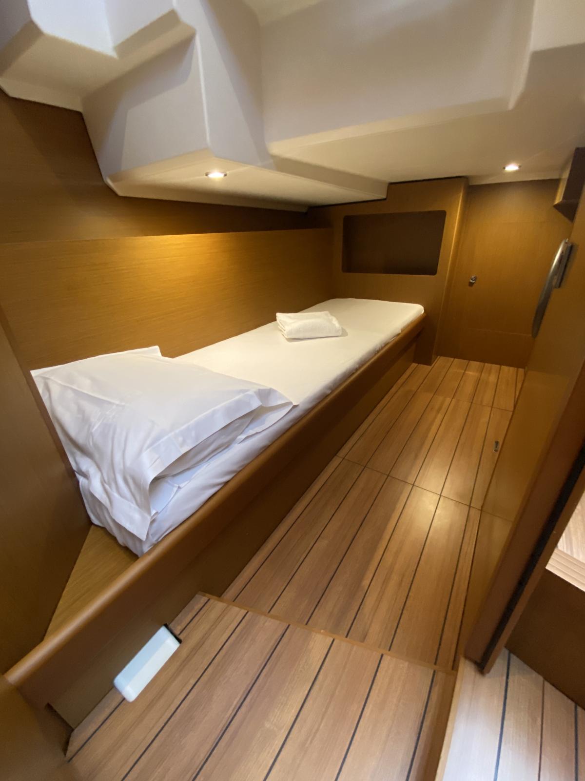 Le bateau est motorisé en Volvo Penta D4 2X270, version 3 cabines et deux salles d'eau Alpi noyer.