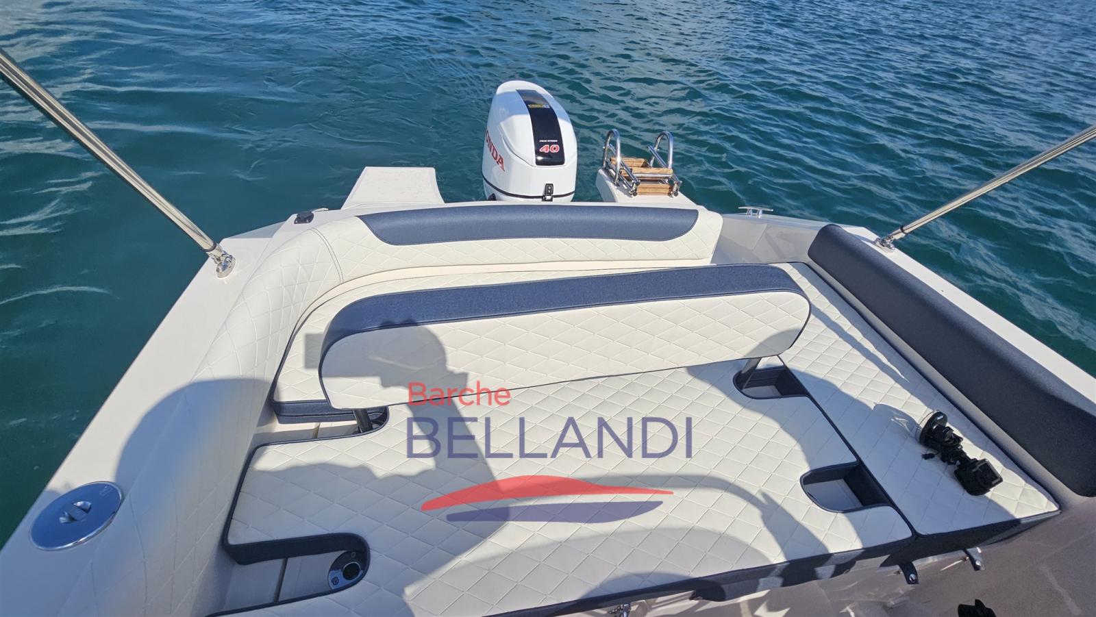 La disposition du pont a été conçue pour maximiser la qualité de vie à bord. Le grand pont de soleil à proue, complet avec des coussins, vous invite à vous détendre et à profiter du soleil dans un confort total. La console de direction centrale et protectrice est équipée d’un pare-brise enveloppant qui assure une excellente visibilité et un abri en navigation. Le siège arrière, également confortable, contribue à créer un espace convivial et accueillant.