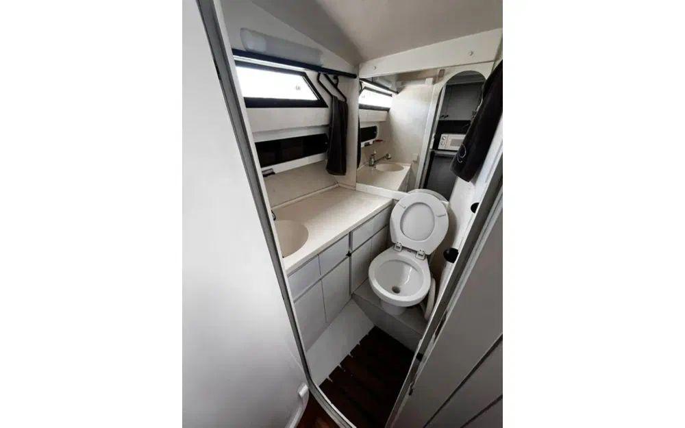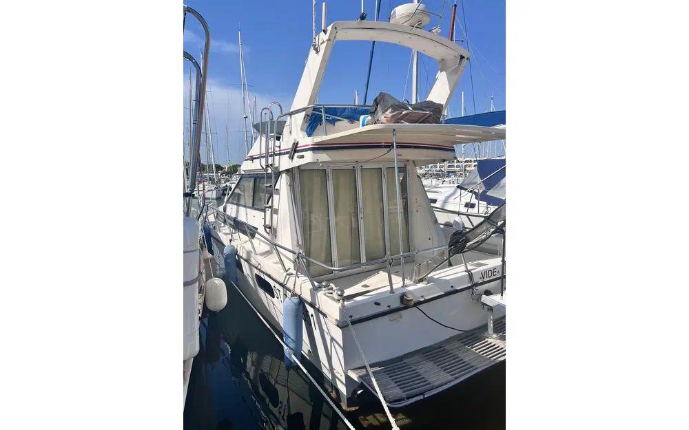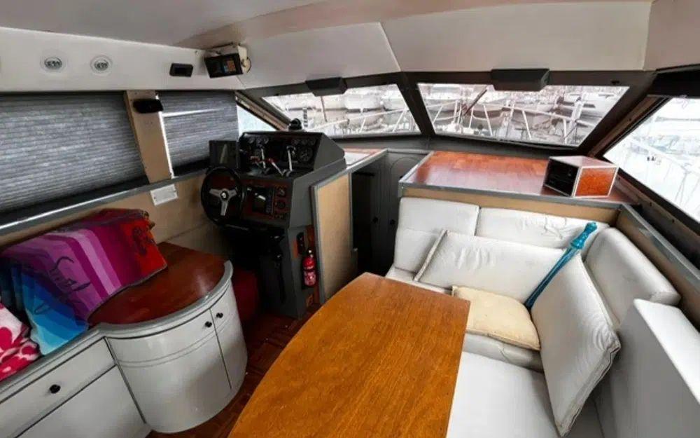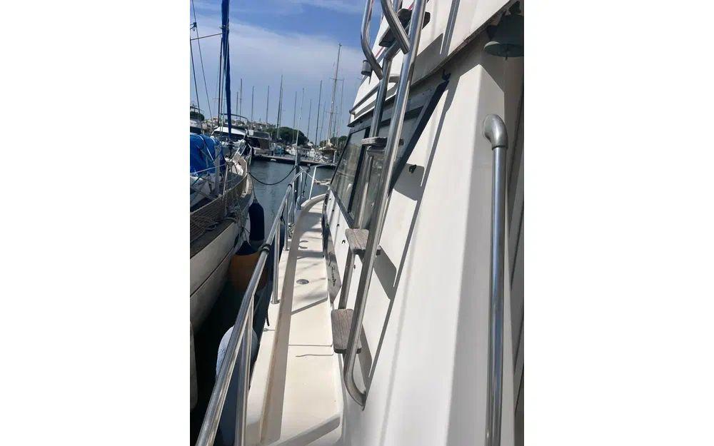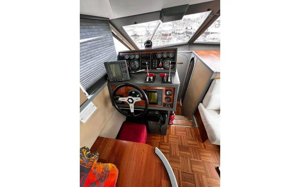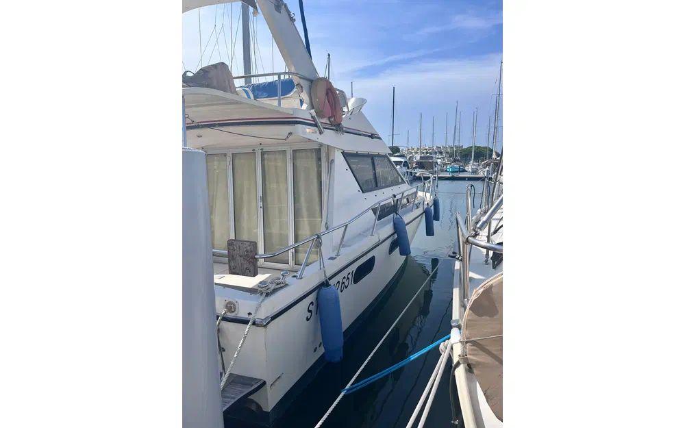 Ce bateau à moteur de 9,8 mètres de long et 3,7 mètres de large a assurément de l’allure sur les flots. Il propose 2 cabines spacieuses pour 5 couchages et une véritable salle de bain, histoire de ne pas tirer à la courte paille pour la douche. À bord, tout a été pensé pour faciliter la vie du capitaine... et celle de l’équipage : réfrigérateur, kitchenette, gazinière, table à carte, WC marin et un placard de rangement qui n’a rien à envier à un studio parisien.