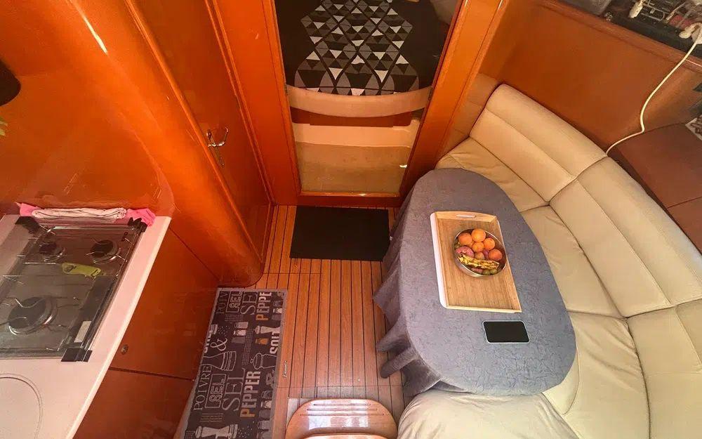 À bord, l’aménagement est particulièrement bien pensé pour un bateau de cette taille. Le Prestige 34 propose deux cabines distinctes, une cabine propriétaire et une cabine invités, ainsi qu’un carré transformable permettant d’atteindre jusqu’à six couchages. La cuisine est équipée de plaques à gaz, d’un micro-ondes et d’un réfrigérateur, offrant tout le nécessaire pour les séjours à bord. Le bateau dispose également d’une télévision, d’un système radio et d’une climatisation d’appoint portable. Les boiseries sont bien conservées et la sellerie intérieure et extérieure est en très bon état, contribuant à une ambiance chaleureuse et confortable.