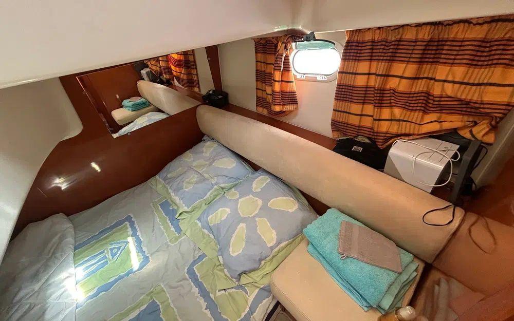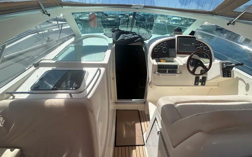 Le cockpit est spacieux et convivial, avec pont et plage arrière en teck, un réfrigérateur de cockpit, un bain de soleil avant, ainsi qu’une échelle de bain escamotable pour faciliter l’accès à l’eau. Le bateau est également équipé d’un propulseur d’étrave Quick, très appréciable pour les manœuvres au port, ainsi que d’un guindeau électrique avec commande au poste de pilotage. Côté électronique, l’unité dispose d’un GPS traceur, radar, sondeur et VHF fixe, permettant de naviguer en toute sérénité.