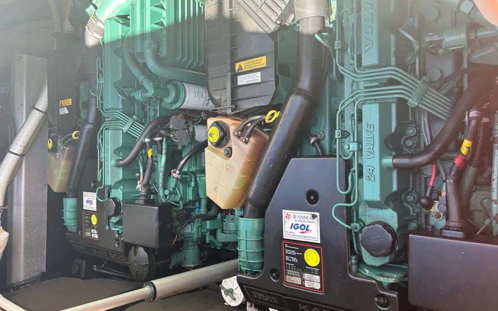 Propulsé par deux moteurs Volvo Penta KAD300 diesel de 300 CV chacun, le bateau offre des performances solides et une navigation sécurisante. Sa propulsion en Z-drive permet une excellente manœuvrabilité, tandis que sa vitesse maximale d’environ 35 nœuds assure des déplacements rapides et agréables. Le bateau dispose d’une capacité carburant de 700 litres et d’un réservoir d’eau de 250 litres, ce qui permet d’envisager des navigations confortables sur plusieurs jours. Classé en catégorie de navigation B, il est parfaitement adapté aux croisières côtières dans de bonnes conditions de sécurité.