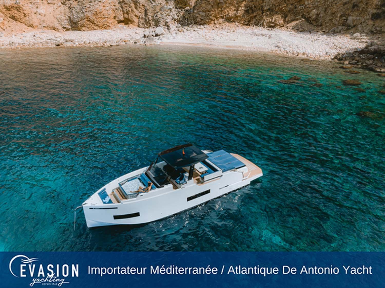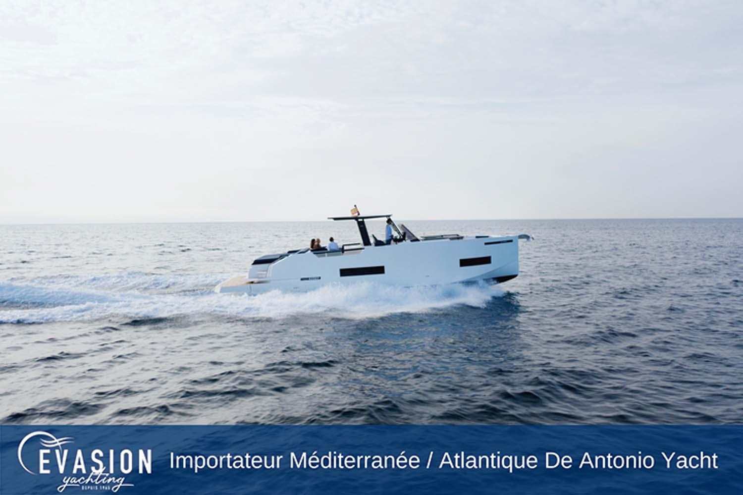 EVASION YACHTING, importateur pour une grande partie de la Méditerranée et l'Atlantique pour DE ANTONIO YACHTS, vous invite à venir découvrir le DE ANTONIO D50 Open NEUF, triple ou quadruple motorisation essence, sur commande.