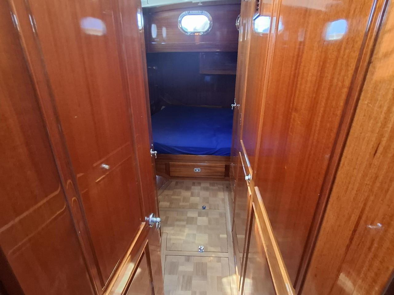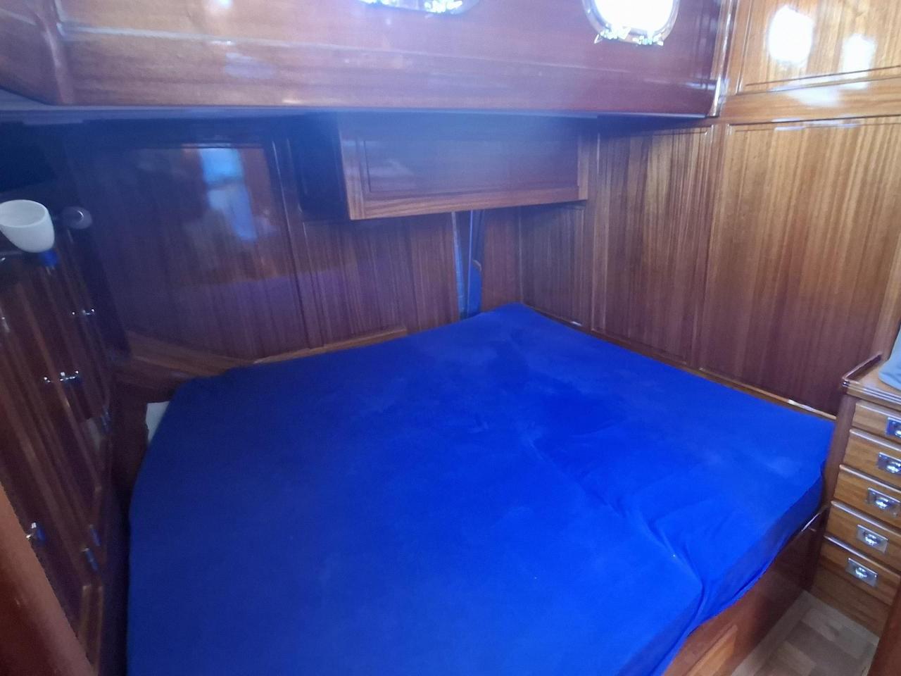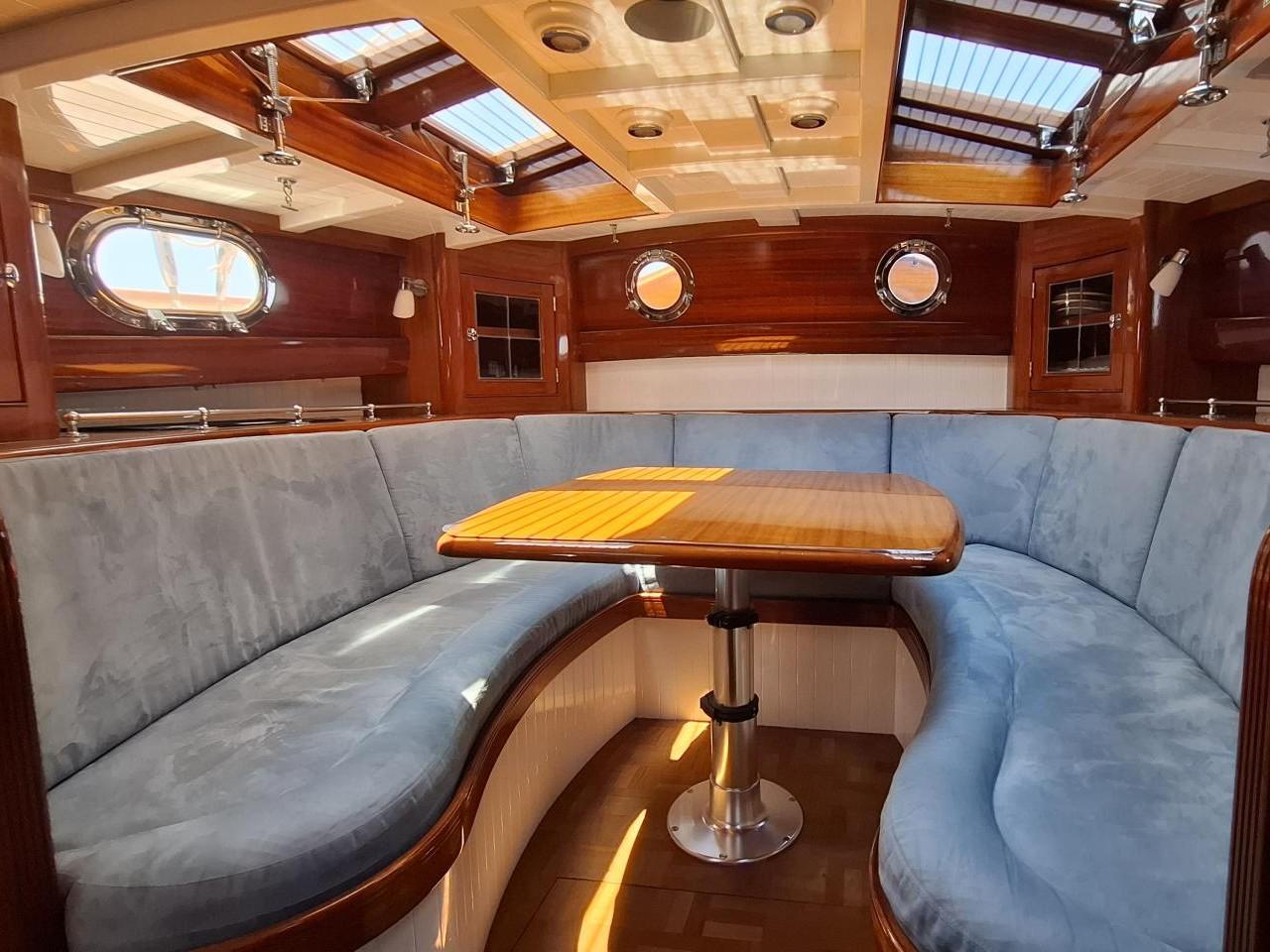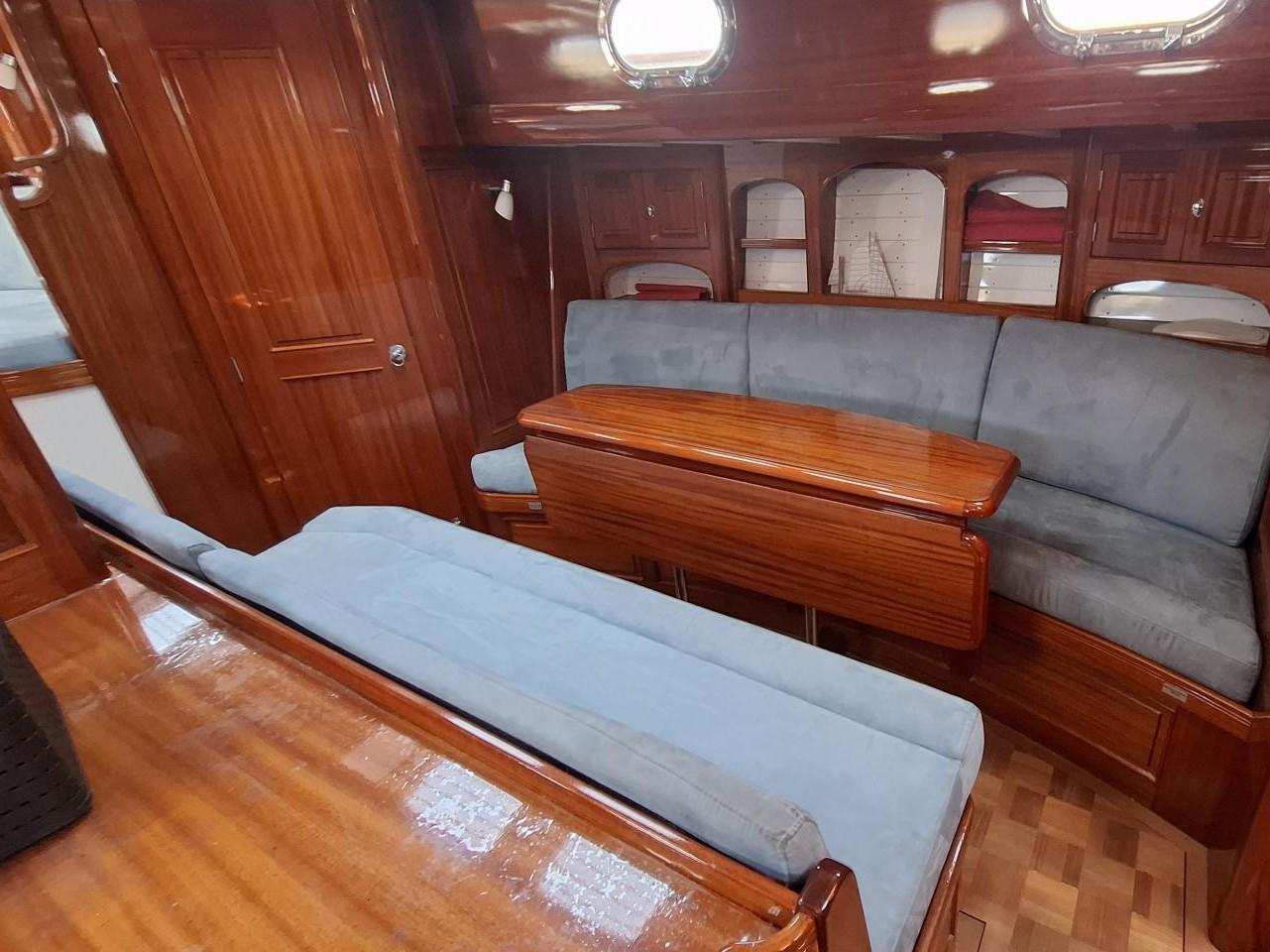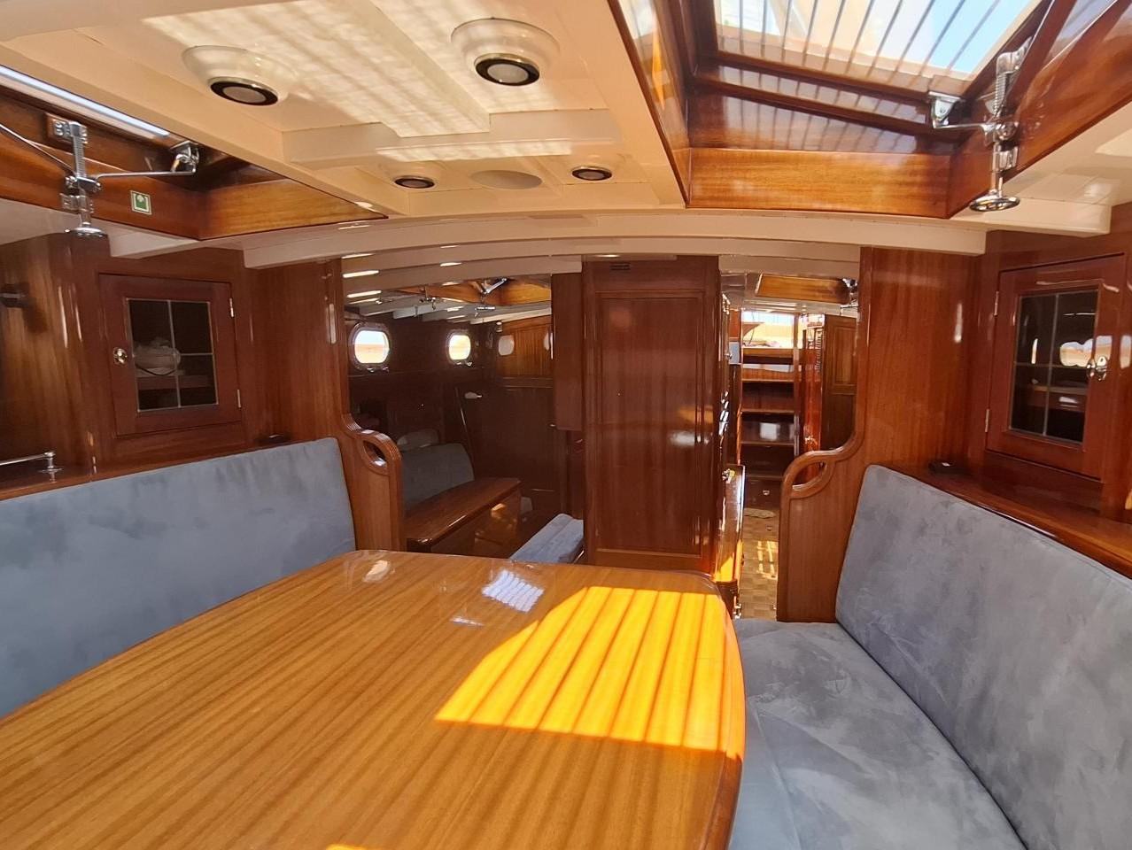 Finition acajou naturel, teck massif, plafond blanc, sellerie bleu-gris, ambiance classique et chaleureuse Une cabine double de propriétaire à l’arrière tribord lit 2,00m X 2,00m Deux salle d’eau avec douche, lavabo et WC électrique avec holding tank de 120L Une cabine double à l’arrière bâbord pour les invités Table à cartes surélevée à tribord Cuisine équipée à bâbord Un carré à tribord face à la cuisine avec table et banquette Coin salon surélevé à l'avant avec vue extérieure Deux cabines simples à l’avant Machine à laver le linge à l’avant bâbord Un pic avant accessible depuis le pont pour l’équipage avec deux couchettes simples Une salle d’eau avec douche, lavabo et WC Réservoir d’eau 2 X 330L Eau chaude et froide sous pression Dessalinisateur