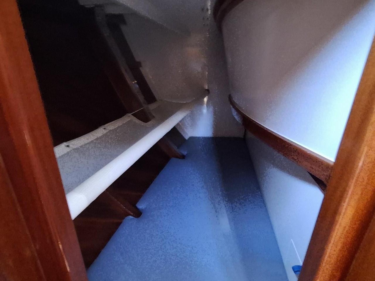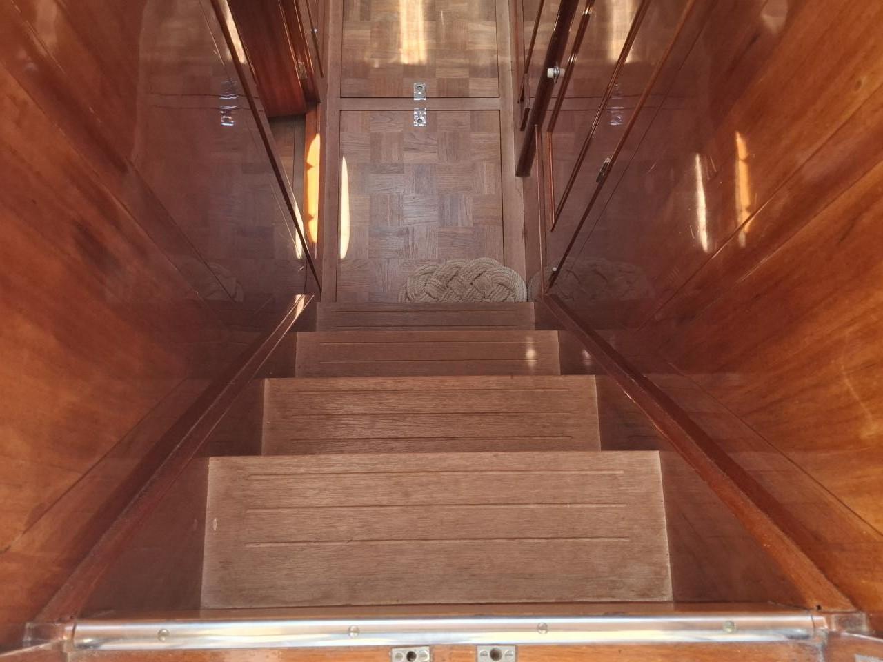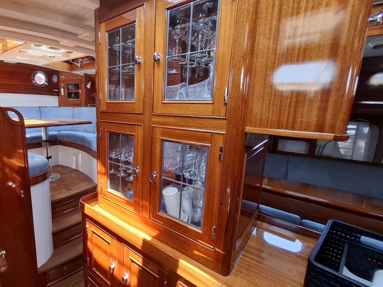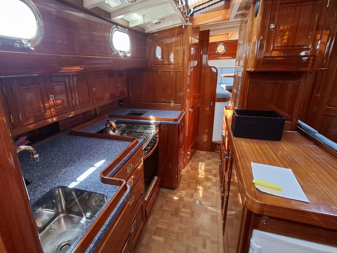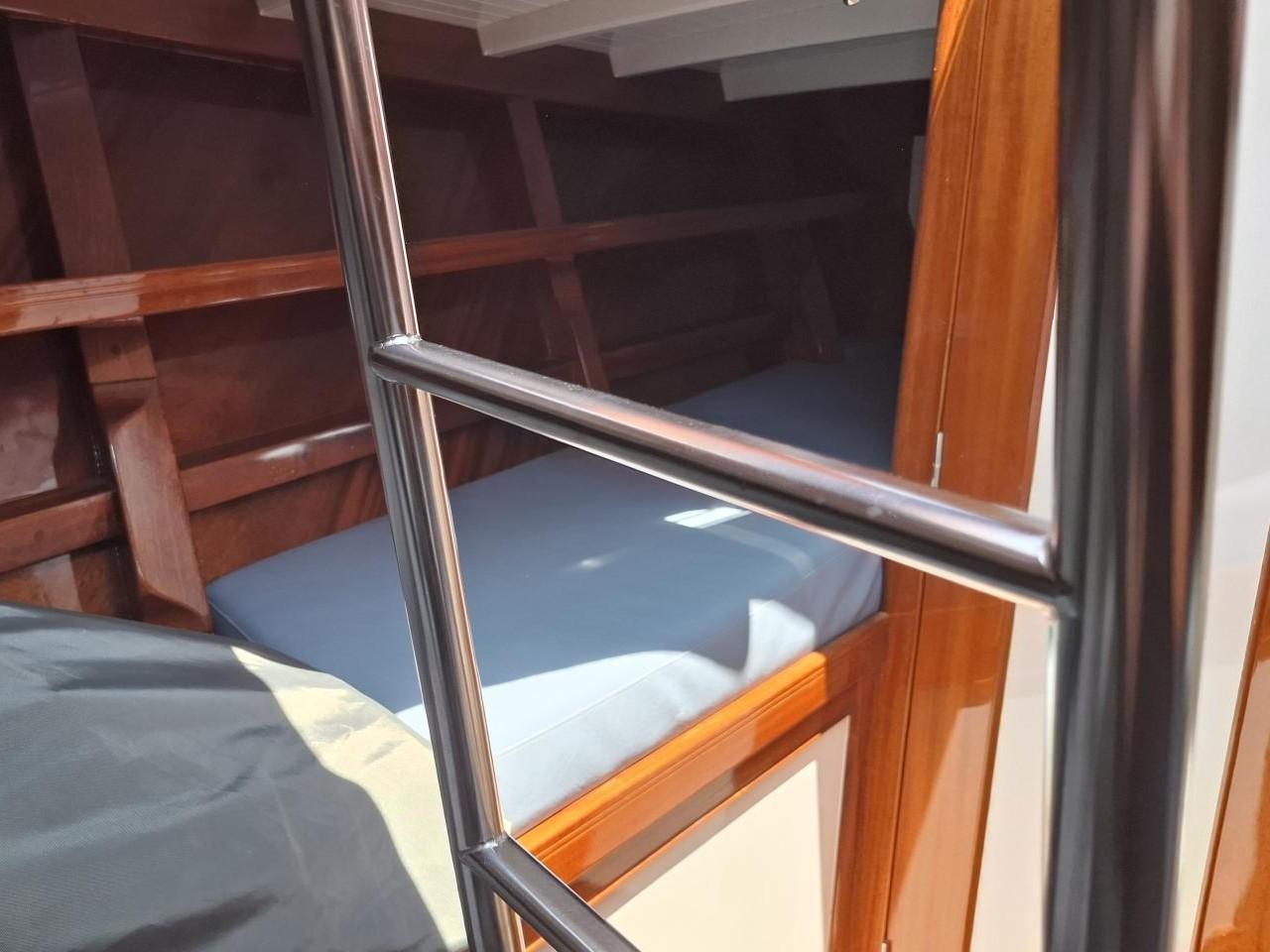 Finition acajou naturel, teck massif, plafond blanc, sellerie bleu-gris, ambiance classique et chaleureuse Une cabine double de propriétaire à l’arrière tribord lit 2,00m X 2,00m Deux salle d’eau avec douche, lavabo et WC électrique avec holding tank de 120L Une cabine double à l’arrière bâbord pour les invités Table à cartes surélevée à tribord Cuisine équipée à bâbord Un carré à tribord face à la cuisine avec table et banquette Coin salon surélevé à l'avant avec vue extérieure Deux cabines simples à l’avant Machine à laver le linge à l’avant bâbord Un pic avant accessible depuis le pont pour l’équipage avec deux couchettes simples Une salle d’eau avec douche, lavabo et WC Réservoir d’eau 2 X 330L Eau chaude et froide sous pression Dessalinisateur