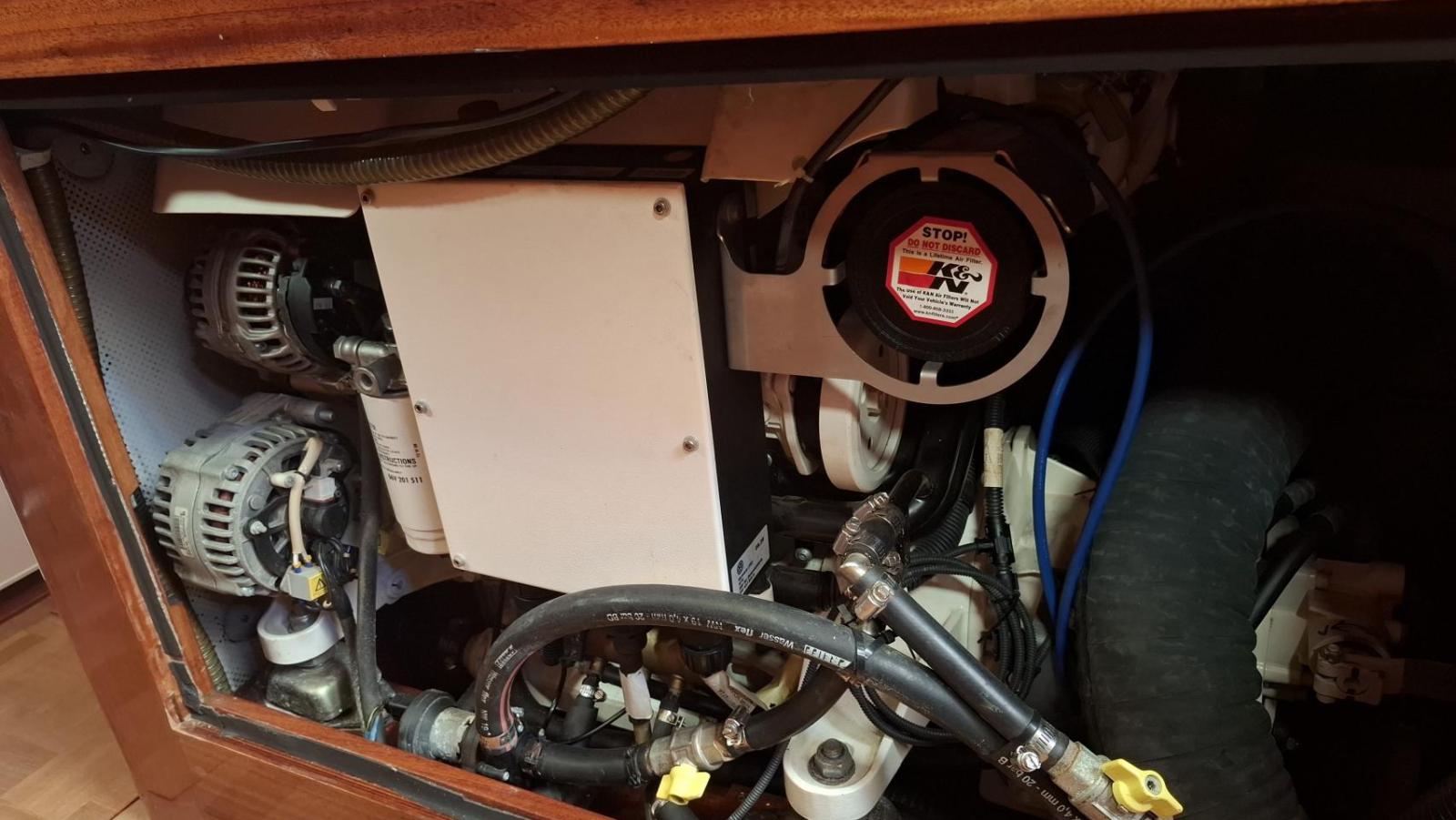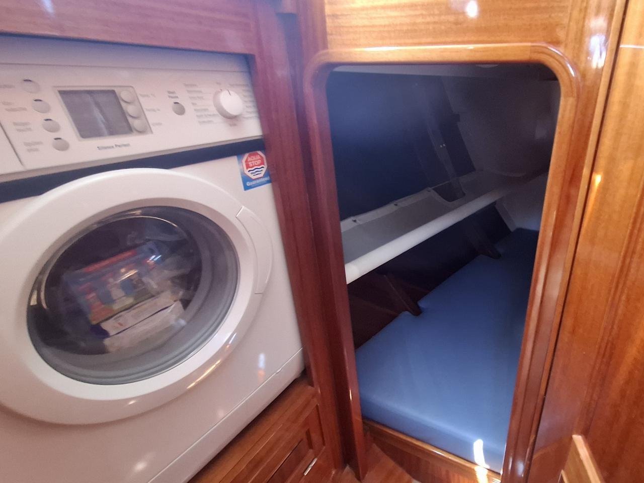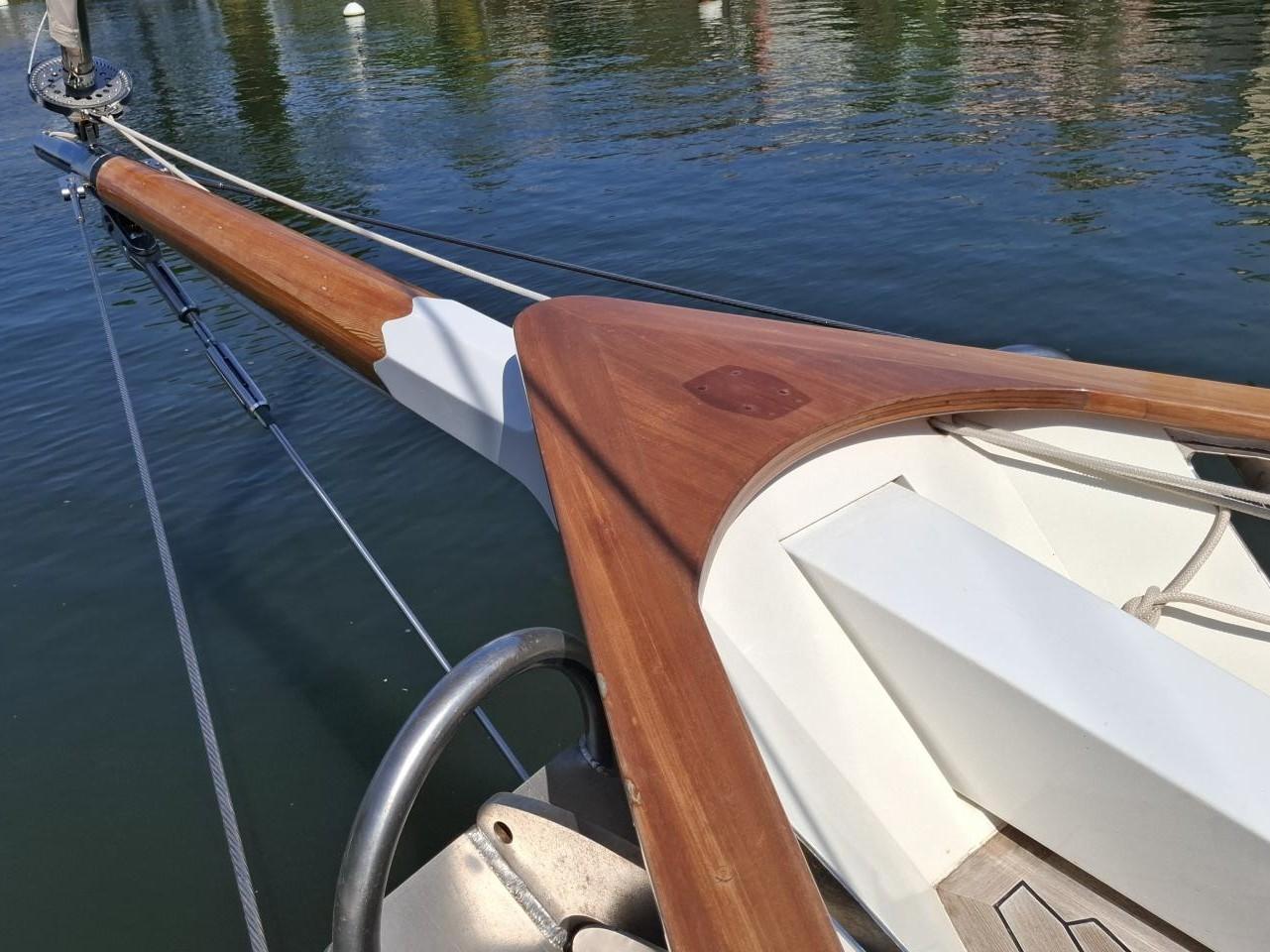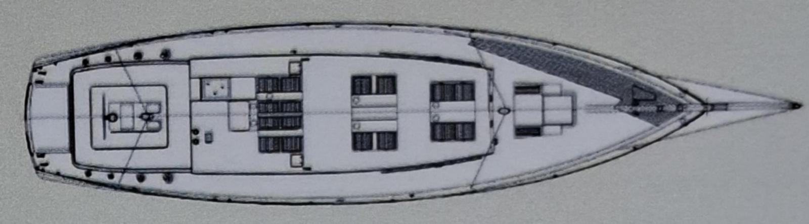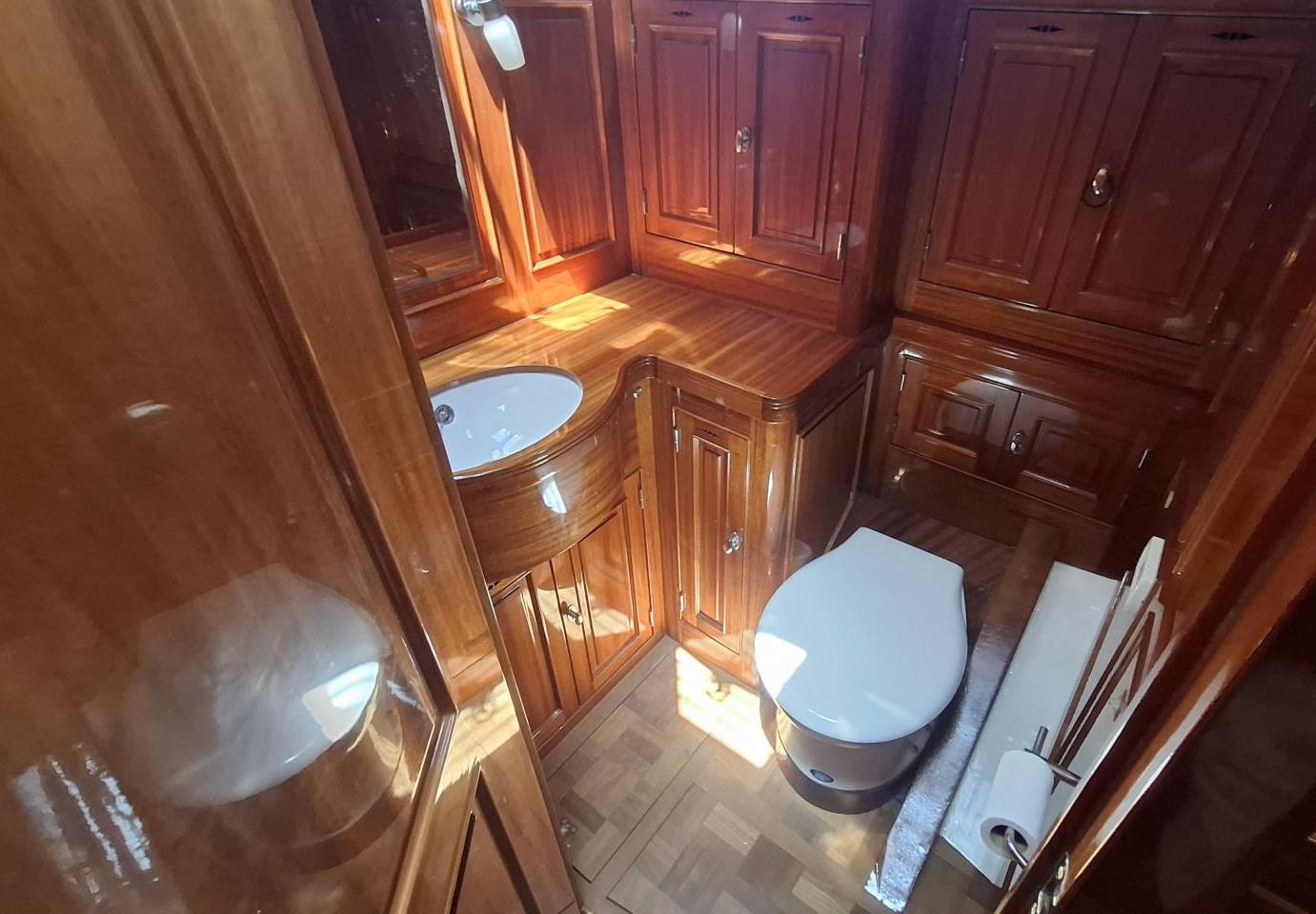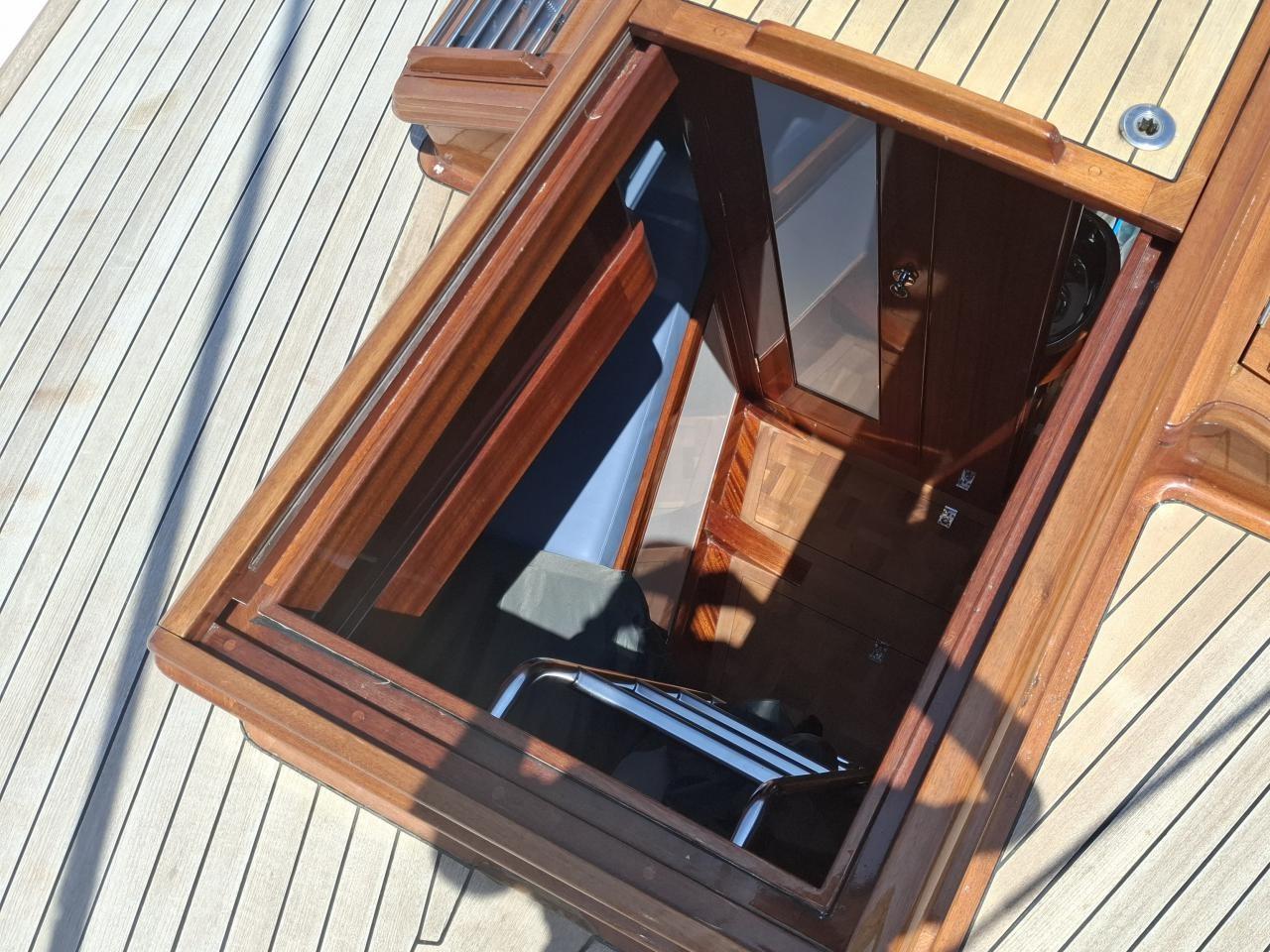 Finition acajou naturel, teck massif, plafond blanc, sellerie bleu-gris, ambiance classique et chaleureuse Une cabine double de propriétaire à l’arrière tribord lit 2,00m X 2,00m Deux salle d’eau avec douche, lavabo et WC électrique avec holding tank de 120L Une cabine double à l’arrière bâbord pour les invités Table à cartes surélevée à tribord Cuisine équipée à bâbord Un carré à tribord face à la cuisine avec table et banquette Coin salon surélevé à l'avant avec vue extérieure Deux cabines simples à l’avant Machine à laver le linge à l’avant bâbord Un pic avant accessible depuis le pont pour l’équipage avec deux couchettes simples Une salle d’eau avec douche, lavabo et WC Réservoir d’eau 2 X 330L Eau chaude et froide sous pression Dessalinisateur
