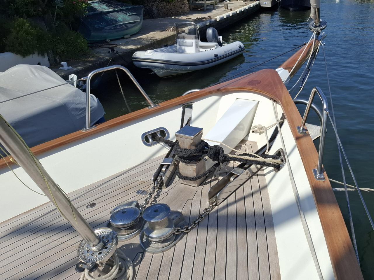 Deux guindeaux électriques Lofrans Mouillage principale ancre charrue en inox 30 kg avec 100 m de chaîne en inox Mouillage secondaire ancre charrue en inox 30 kg relié Propulseur d’étrave rétractable Max Power 24V Pont cockpit et passavant en Teck massif Quille relevable électrohydraulique, en acier haute résistance Grande table de cockpit centrale avec réfrigérateur 40 L, évier et rangements Coussins de cockpit avec dossiers Capote de roof Barre à roue avec console pour l’électronique Pour annexe gonflée 2,70 m pare-battages, passerelle Echelle de bain arrière Douche de pont