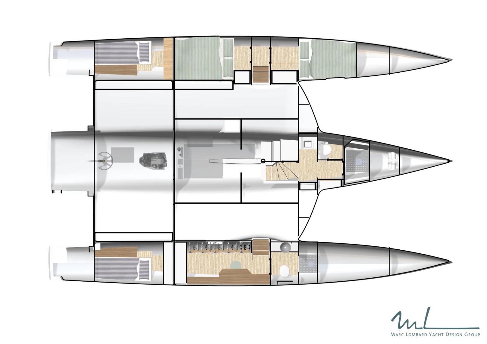 A bord, le NEEL 48 impressionne par son cockloon, espace unique combinant cockpit et carré intérieur, entièrement décloisonné pour une vie à bord fluide et lumineuse. Le niveau de confort rivalise avec des unités bien plus grandes: grande suite propriétaire sur le pont principal, cabines invités dans les flotteurs, cuisine panoramique, volumes de rangements intelligents - tout est pensé pour vivre en mer sans renoncer à rien.