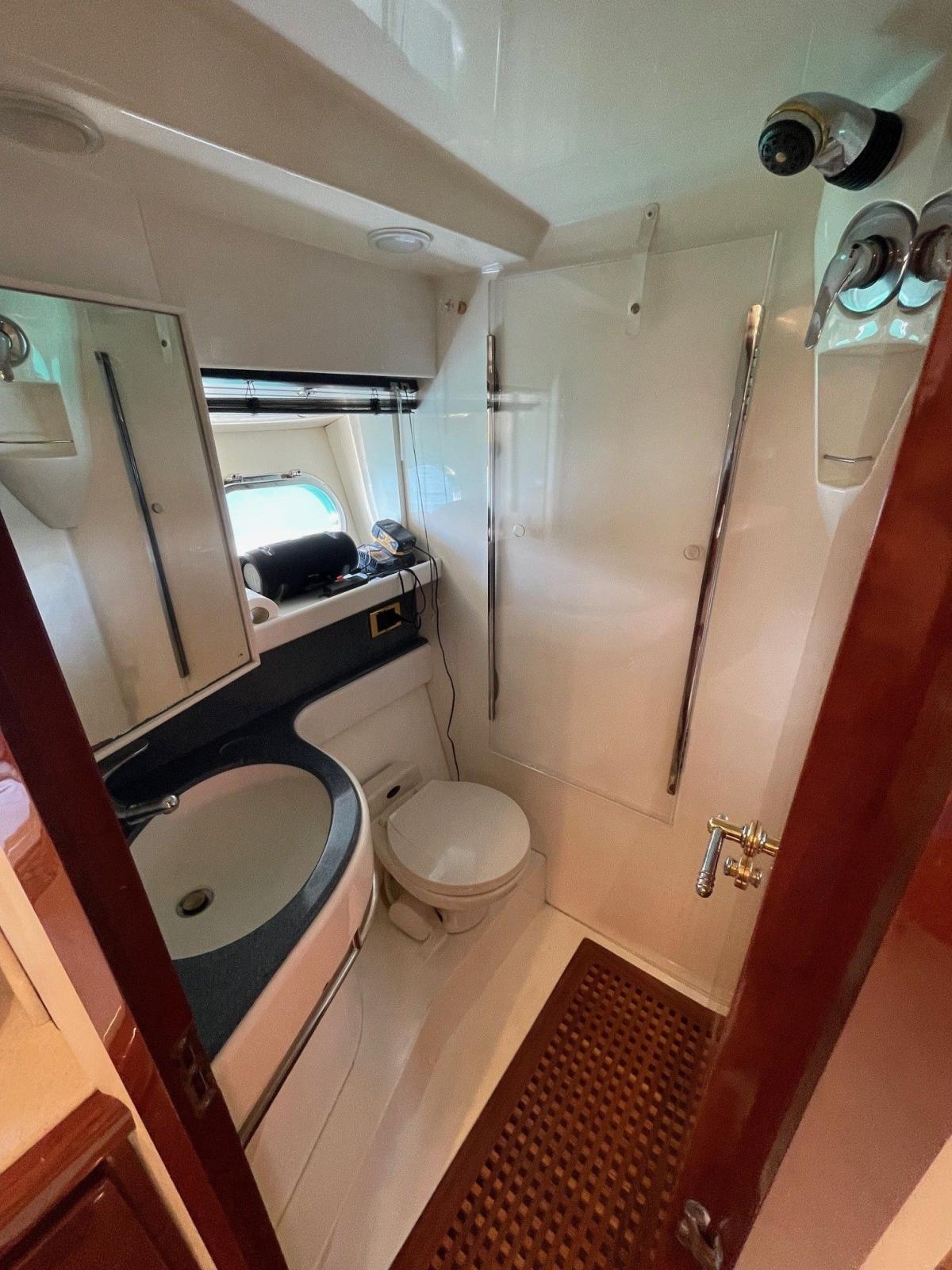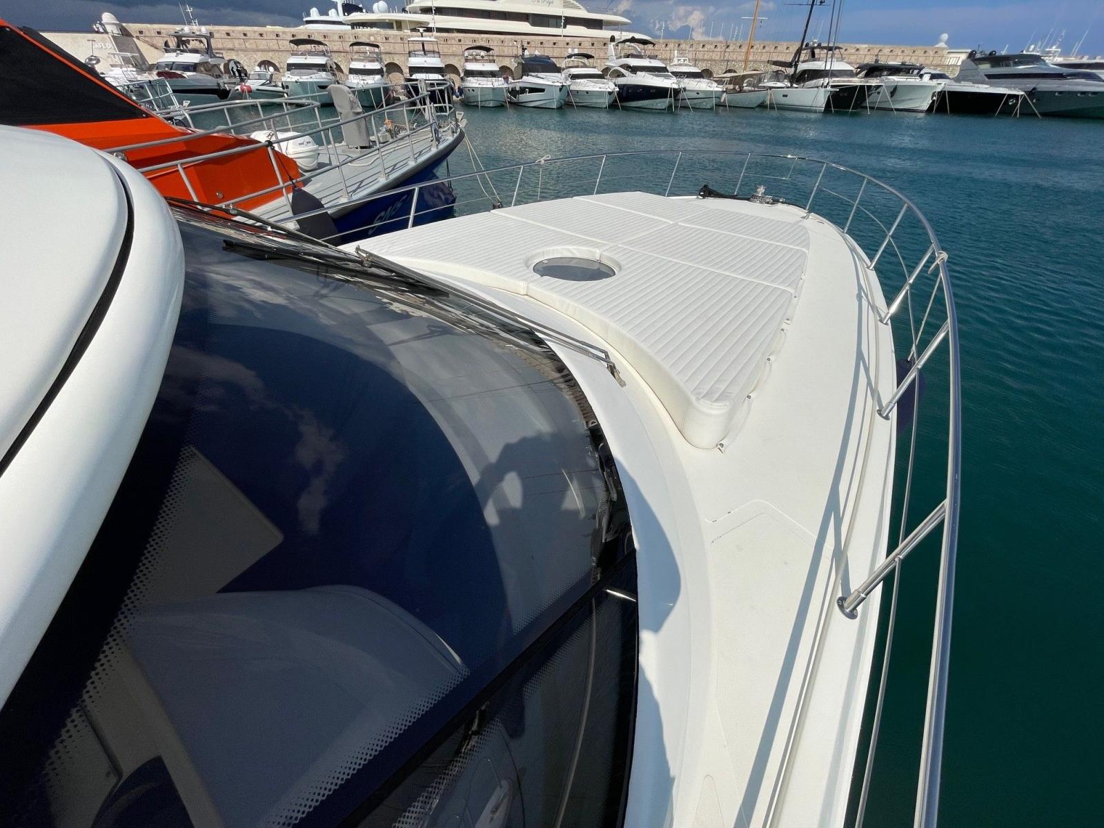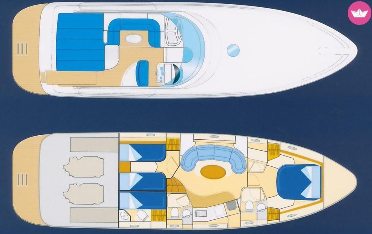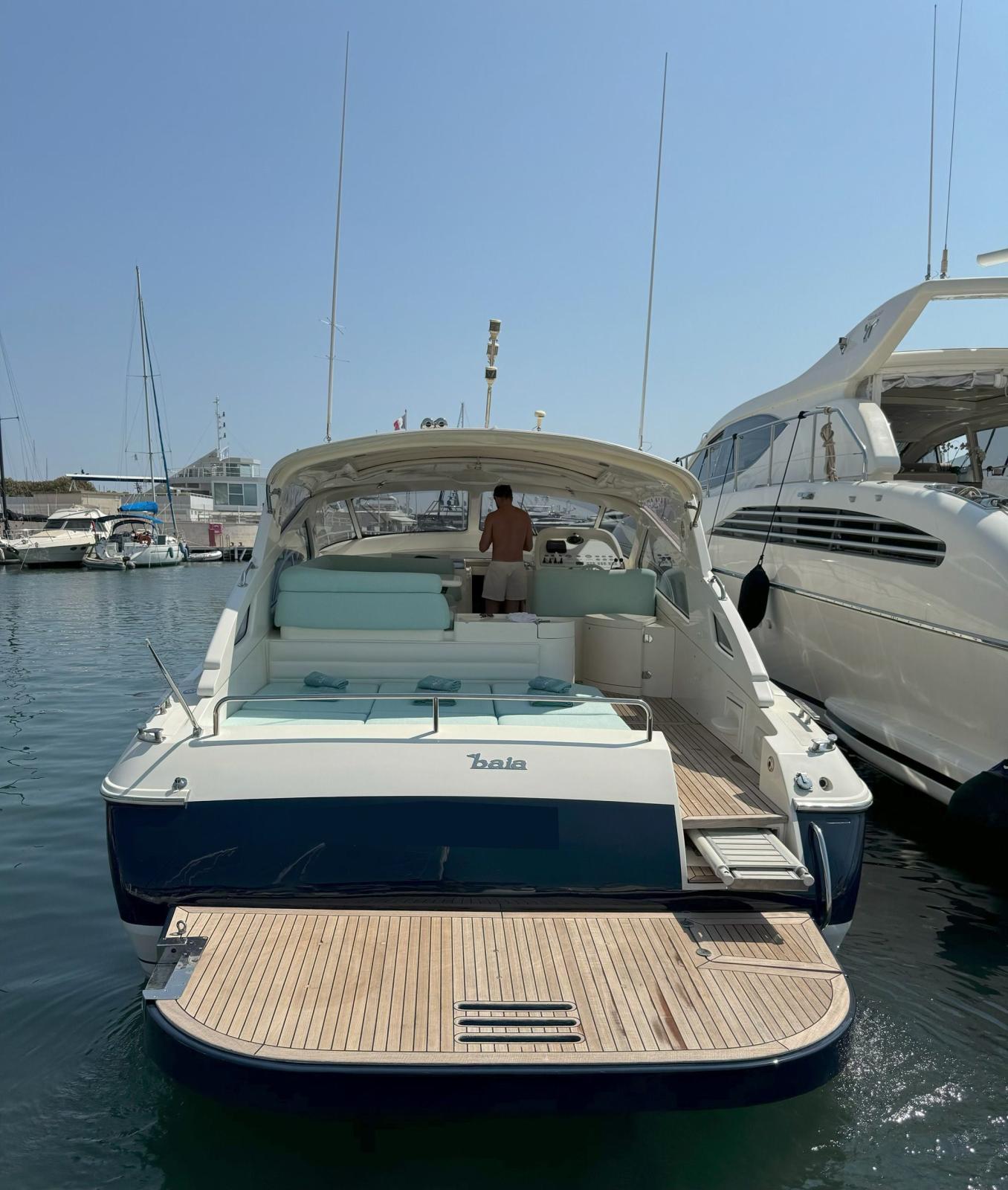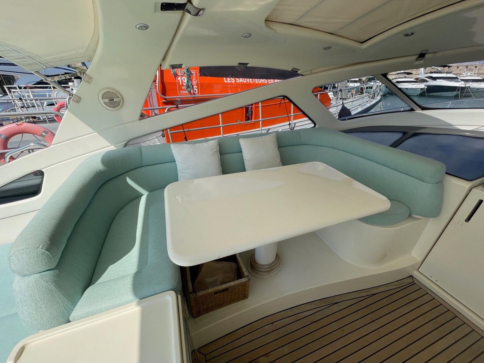 Le cockpit spacieux invite à la détente : bain de soleil, coin repas extérieur et poste de pilotage central protégé par un pare-brise profilé. À l’intérieur, les matériaux nobles et l’agencement intelligent créent une ambiance chaleureuse et contemporaine, idéale pour les croisières en Méditerranée.