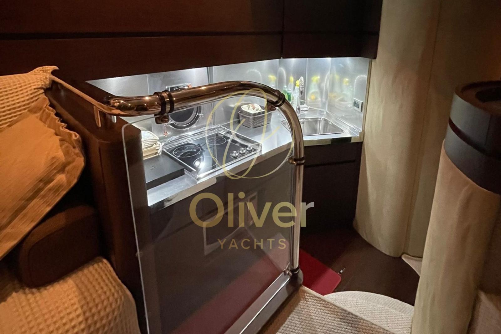La cuisine linéaire, équipée d’une plaque vitrocéramique, d’un micro-ondes et de grands rangements, permet de vivre la convivialité même à bord, sans rien renoncer. Élégant et pratique, il est conçu pour ceux qui aiment cuisiner et recevoir des invités.