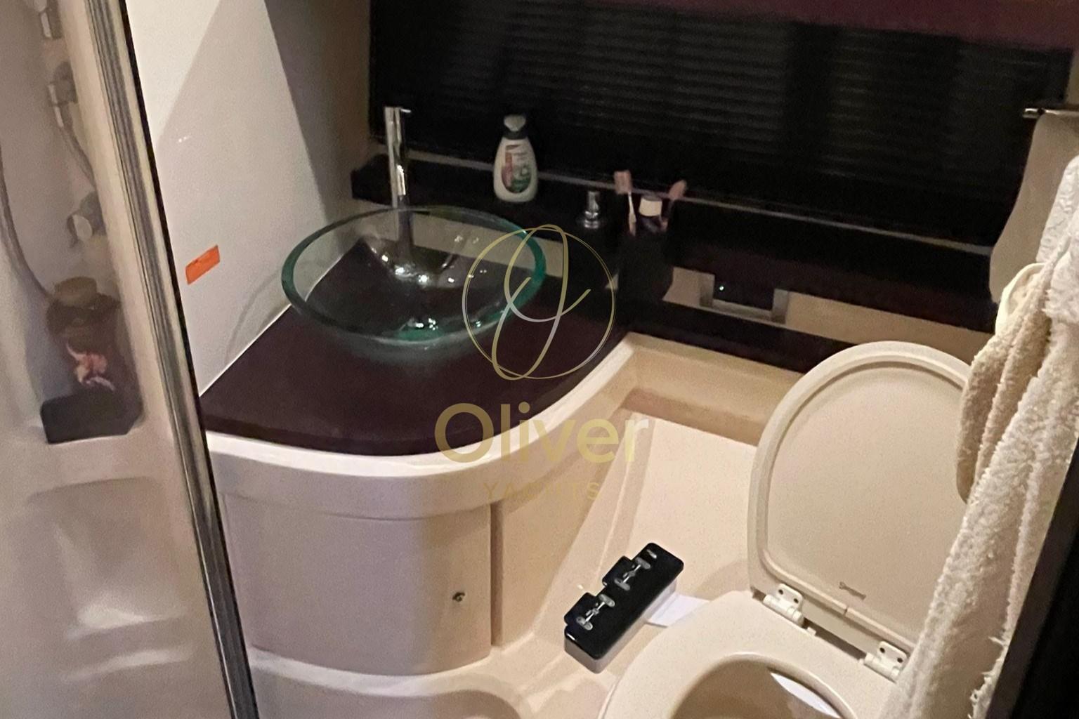 L’espace nuit offre deux cabines confortables : la cabine propriétaire à l’avant, avec un lit double central et de grandes fenêtres qui donnent de la luminosité, et la cabine invités à l’arrière, avec des lits jumeaux et un accès direct à la salle de bain. Les deux salles de bains, modernes et bien finies, sont équipées d’un lavabo design et de douches spacieuses, assurant un confort maximal même pendant les longs séjours.