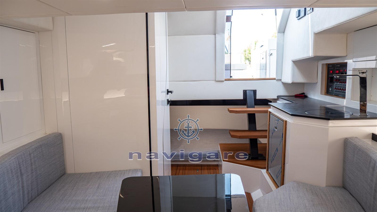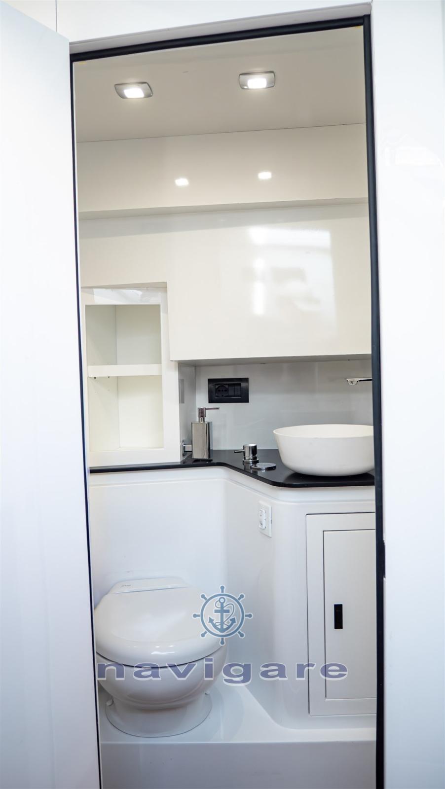 COMPARTIMENT TECHNIQUE • Isolation thermo-acoustique • Capot à commande électrique • Système d’extinction d’incendie dans la salle des machines • Pompes de cale automatiques • Capacité du réservoir de carburant : 640 litres • Vannes de carburant avec verrous de sécurité à la barre. • Capacité du réservoir d’eau : 200 litres • Pompe de chasse d’eau douce* • Pompe d’eau douce* • Réservoir d’eau sale de 80 litres avec pompe • Point de vidange du réservoir de vidange sur le côté de la plate-forme. • 2 batteries de moteur AGM • 2 batteries de service AGM • Génératrice de 4 kW avec batterie* • Batterie AGM supplémentaire* • Système de climatisation : 12 000 BTU*