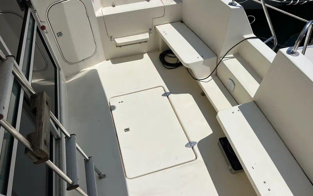 L'ensemble de la coque et des superstructure ne fait pas apparaître de remarque particulière. Le gelcoat présente quelques légères traces de faïençage de surface sur les parties les plus fines autrement après un polissage/ lustrage le bateau retrouvera un bel aspect brillant.