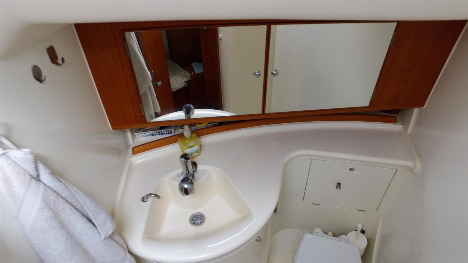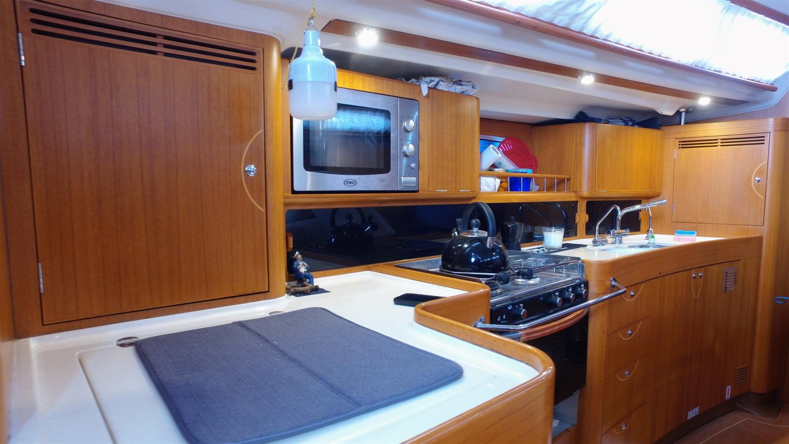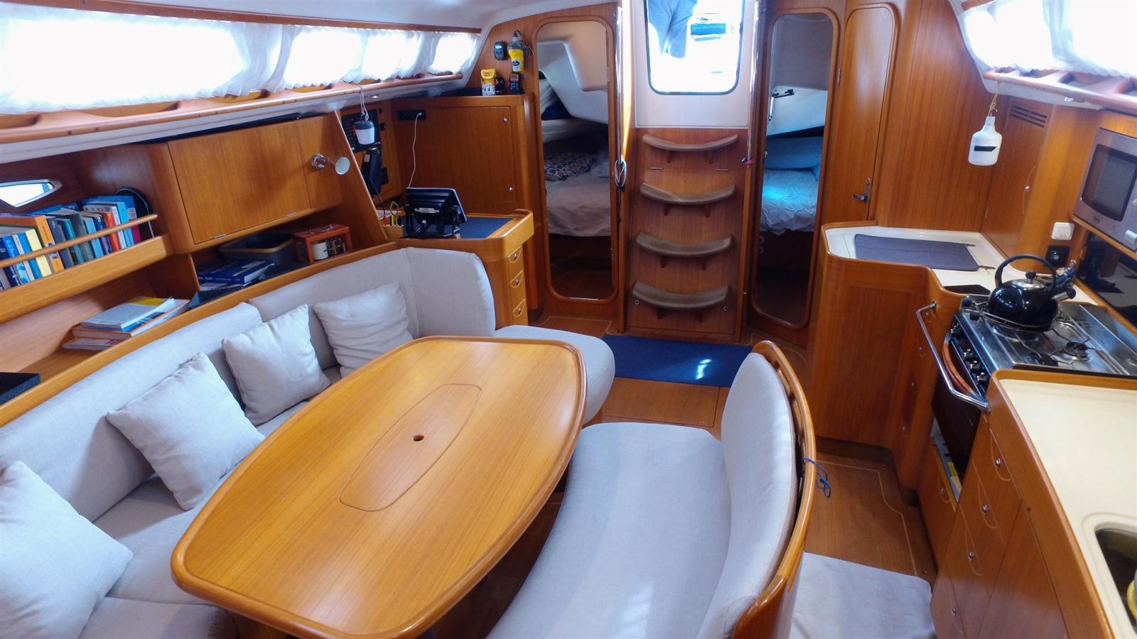 Eau Chaude, Ballon d'eau chaude (de 2019), Dessalinisateur (Spectra 60l 12vlt), Cuve à eaux noires (80L 2018), Jauge de Réservoir d’Eau, Convertisseur (MASTERVOLT 2200w), Plancher intérieur en bois (teck), 4 Prises interieures 12v, 2 Prises interieures 220v, Chauffage (Eberspacher D5), Toilettes électriques, Toilettes manuelles.