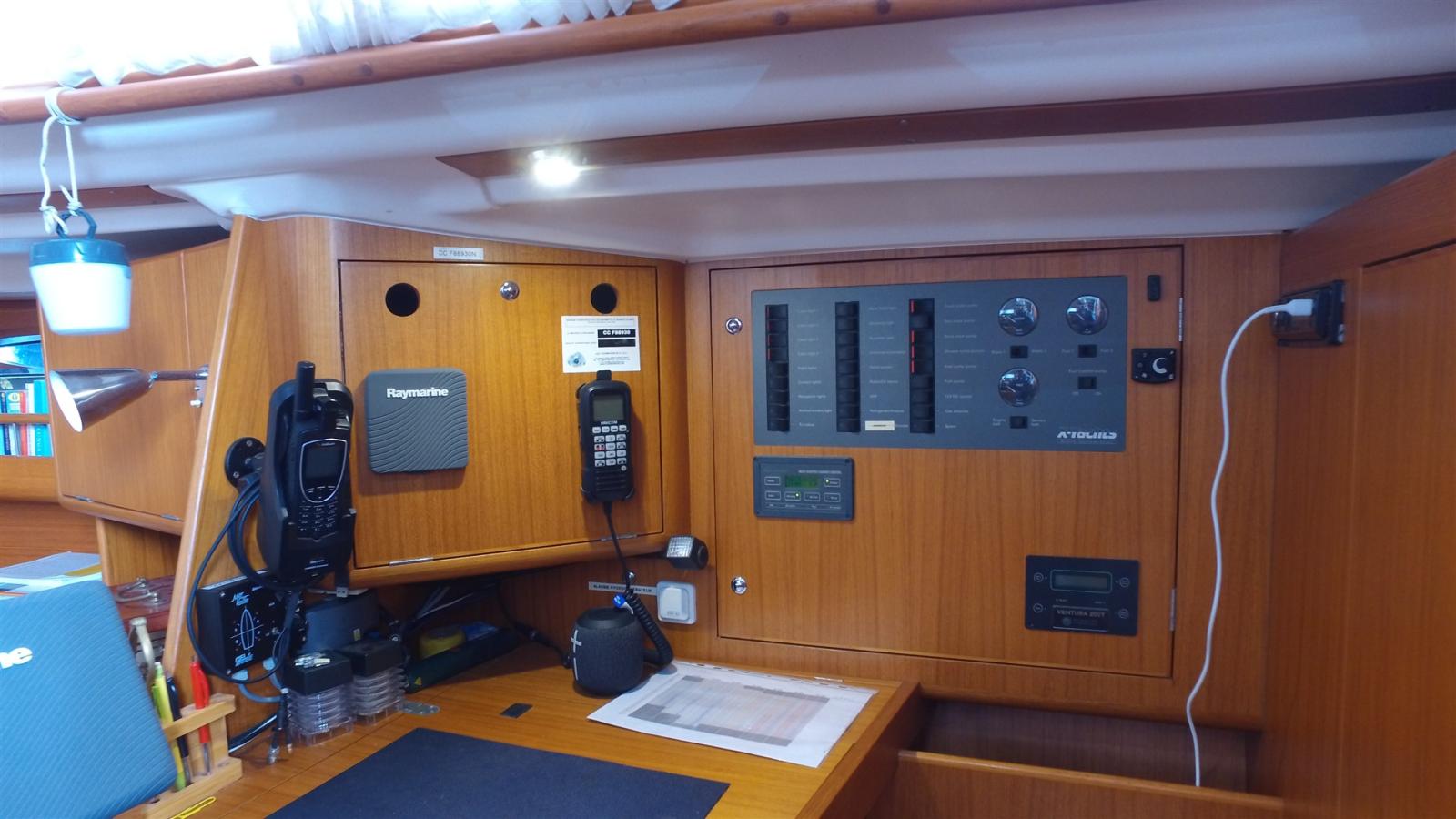 AIS (AIS 650 Raymarine), Indicateur d'angle de barre, Antenne radar, Loch (Raymarine I70), DSC VHF (NAVICOM), Balise de détresse (EPIRB), Feux de navigation (Led), Pilote automatique (Raymarine Gyro et télécommande S100), 2 Plotter GPS (Raymarine A97 (2017) et A127(2012)), Radar (Raymarine), Sondeur (Raymarine I70 et 2 répéteurs I50), 3 Anémomètre/Girouette (Raymarine I70), Téléphone satellite (IRIDIUM Go Exterm).