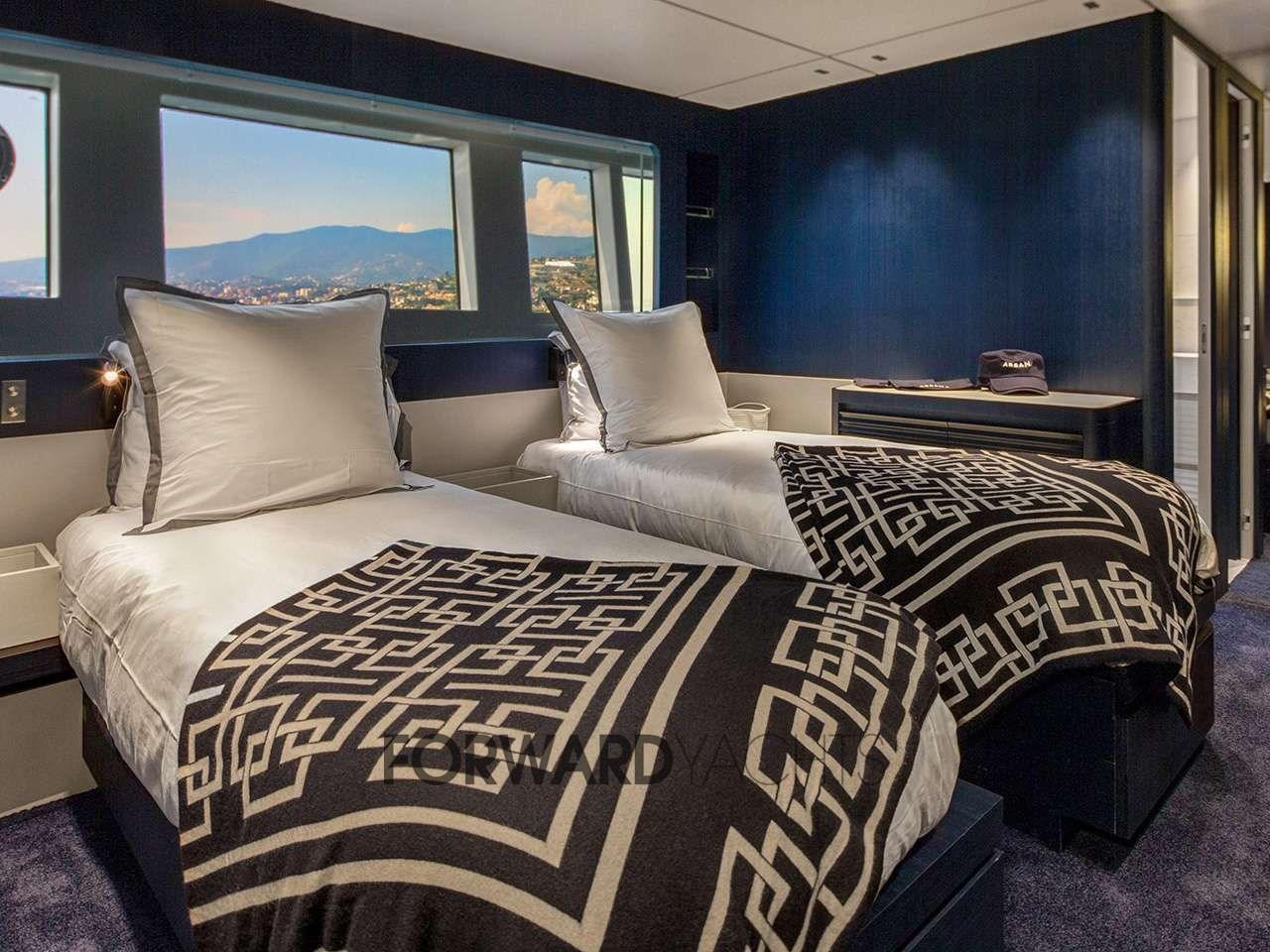 Le bateau allie élégance et technologie de pointe. Il peut accueillir jusqu’à 10 invités dans 5 cabines spacieuses : une suite propriétaire sur le pont principal et, en dessous, deux cabines doubles VIP et deux cabines simples avec lits plats convertibles ; Le tout avec salle de bain attenante. À la proue, la zone d’équipage peut accueillir jusqu’à 5 personnes.