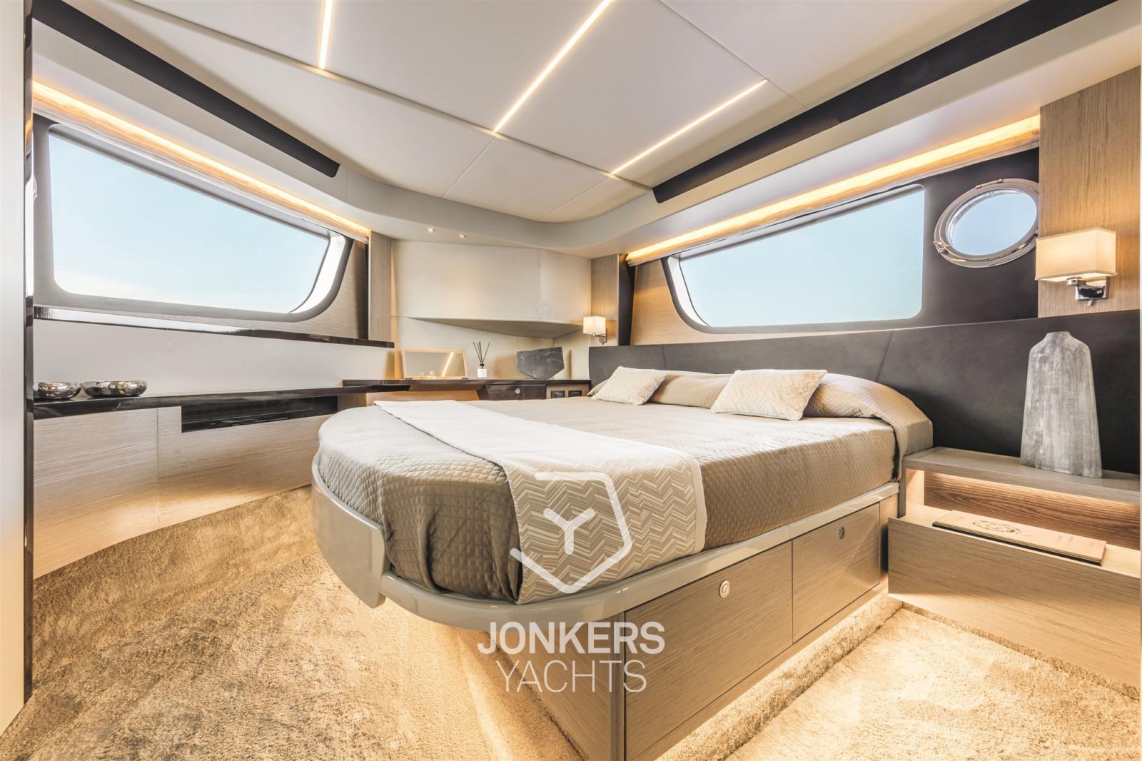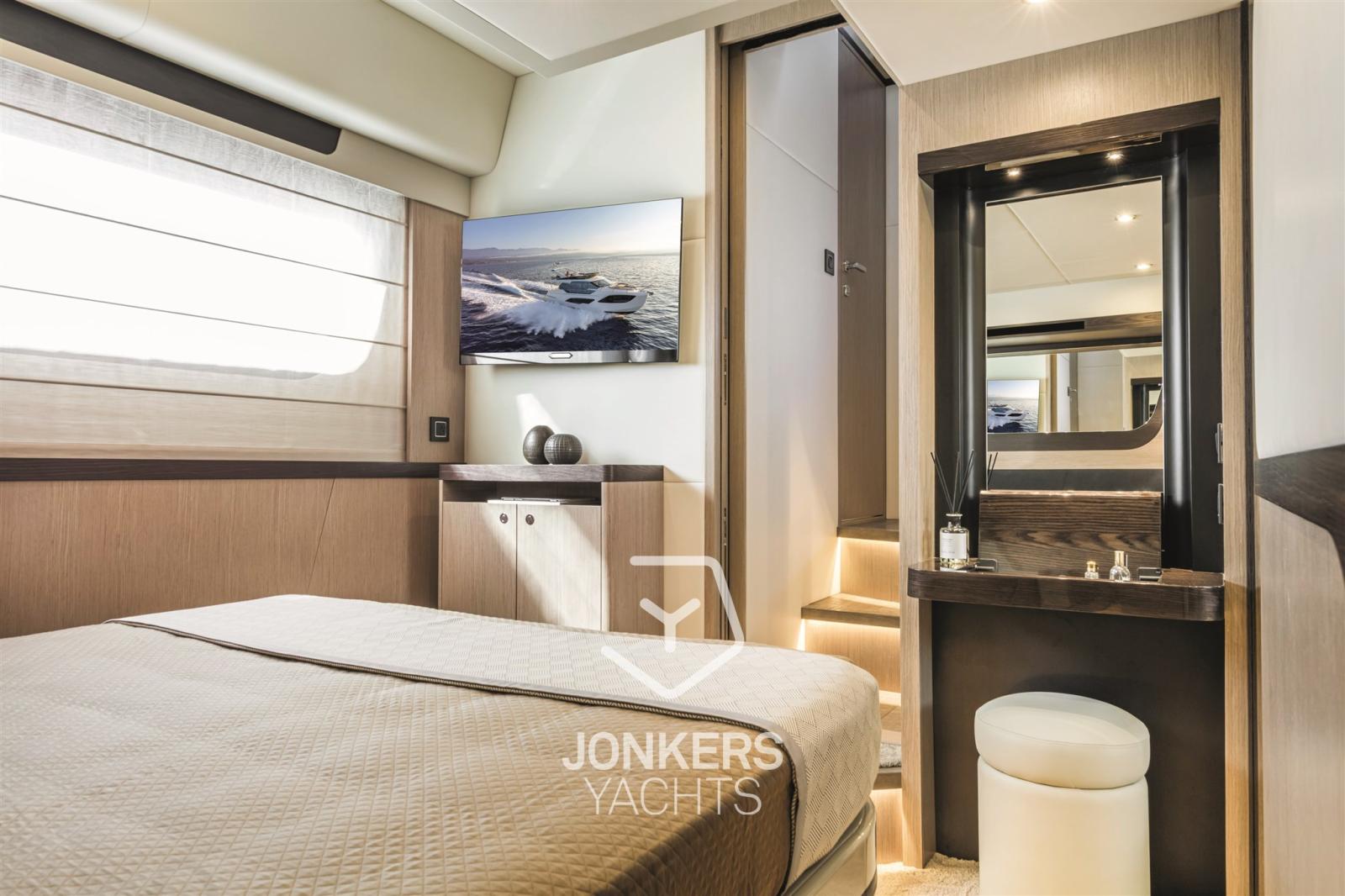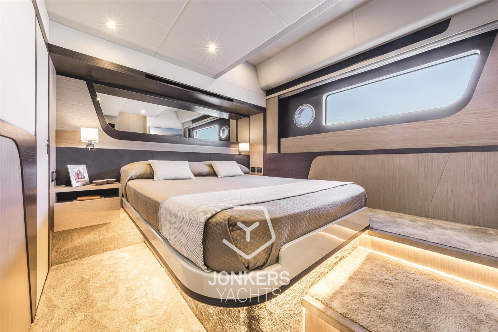 La cabine principale est à l’avant, surélevée du niveau flottant sans marches, et avec un placard spacieux. Un bureau de courtoisie et une salle de bain attenante avec un hublot dans la douche sont également présents.