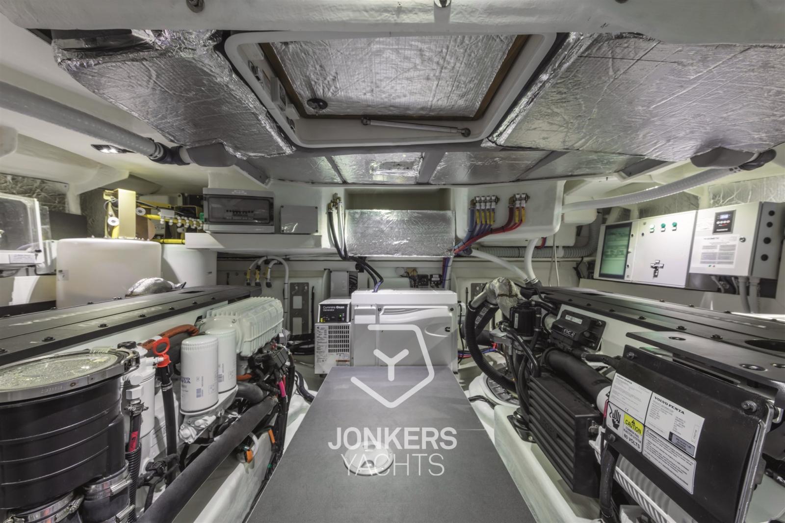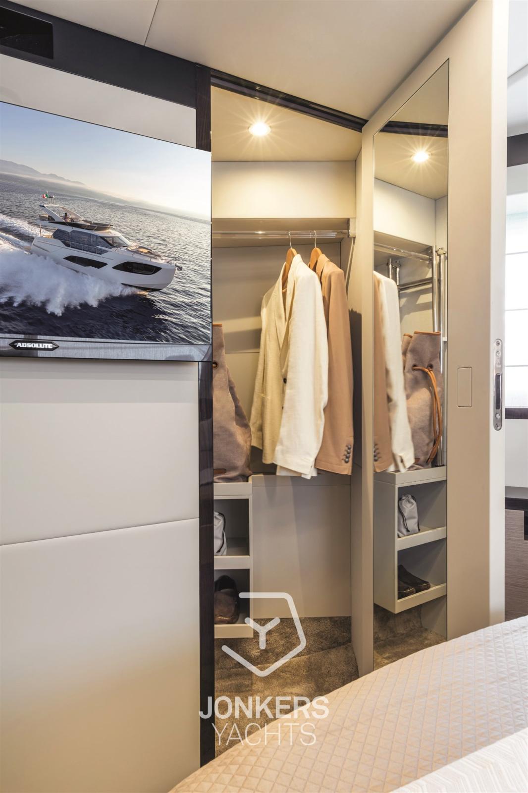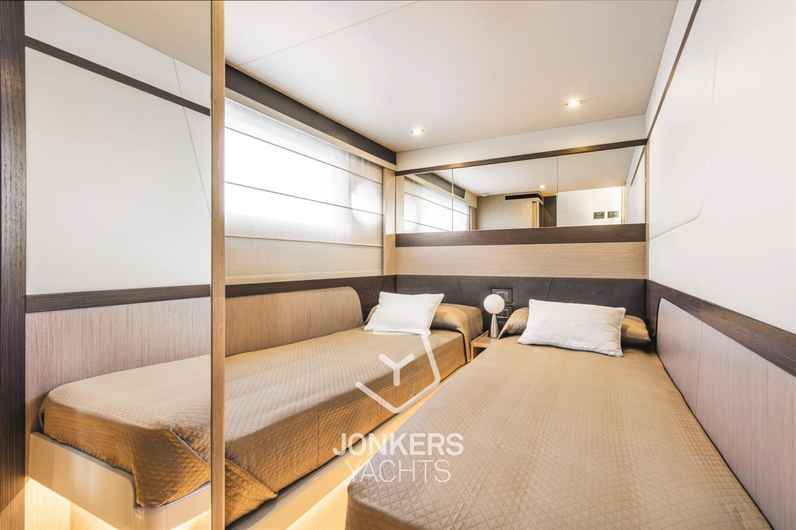 La cabine principale est à l’avant, surélevée du niveau flottant sans marches, et avec un placard spacieux. Un bureau de courtoisie et une salle de bain attenante avec un hublot dans la douche sont également présents.