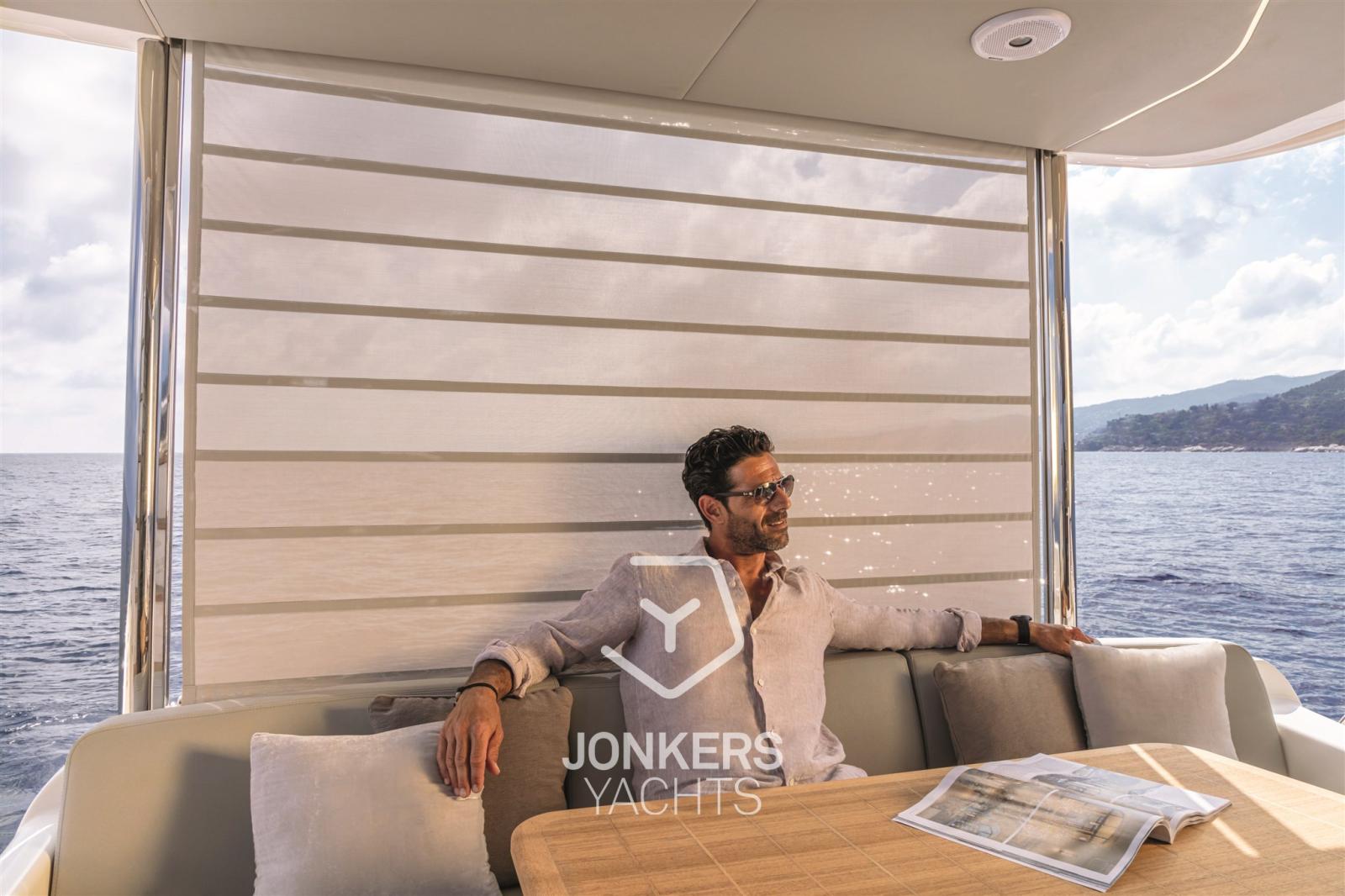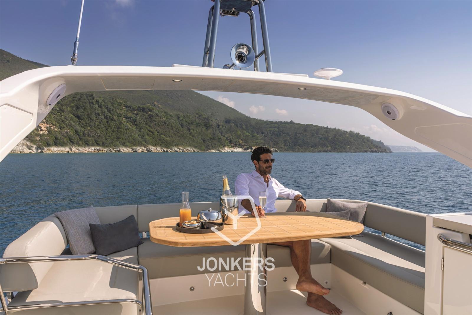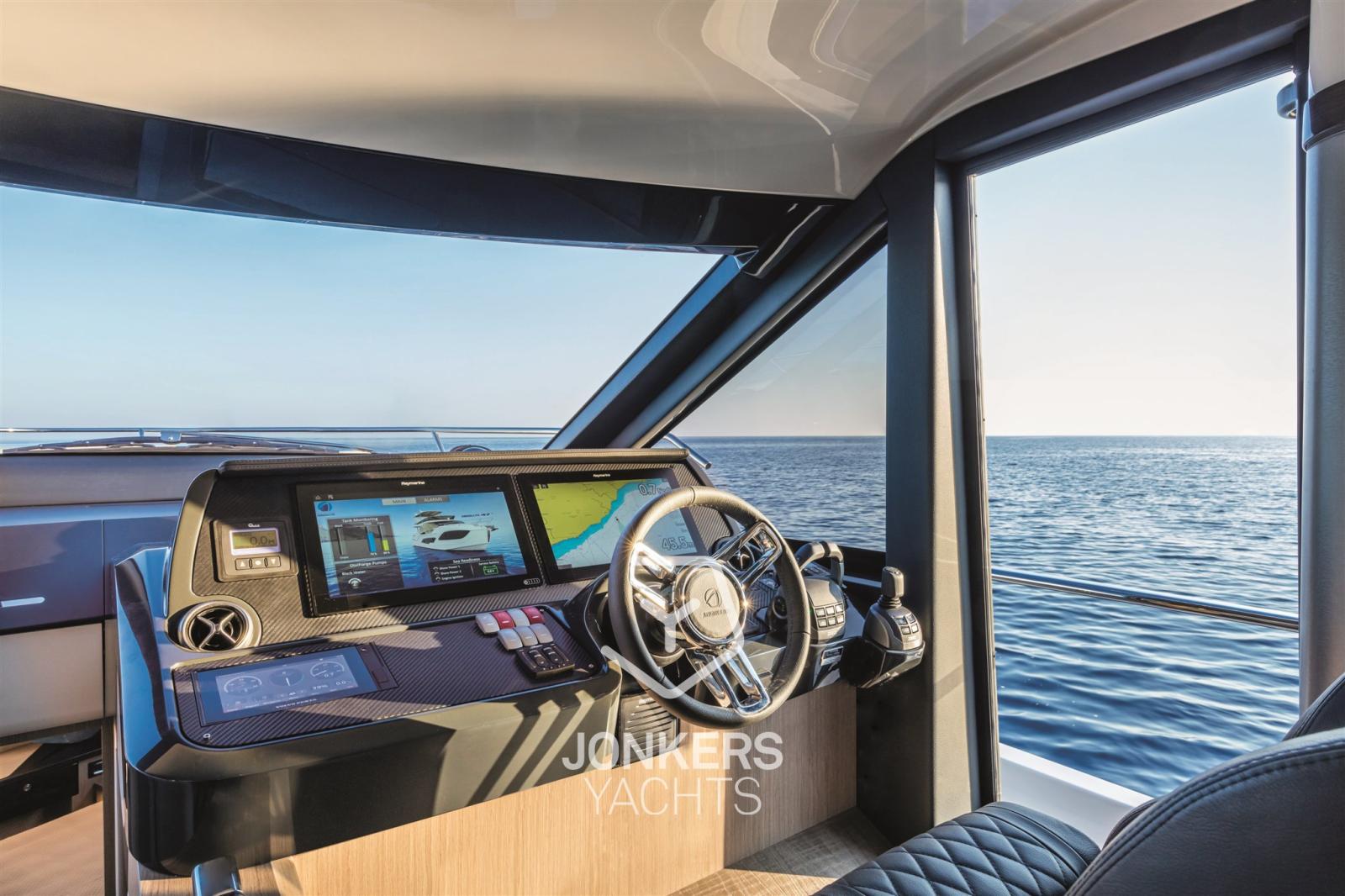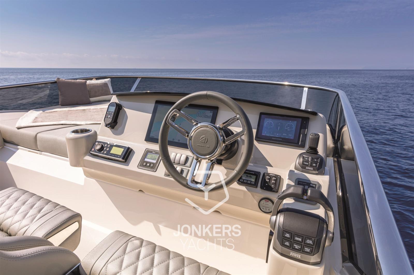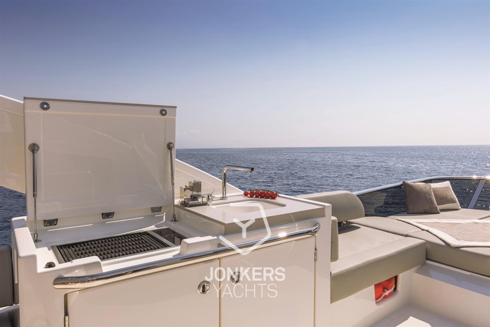Le flybridge est grand, bien organisé et équipé d’une station de barbecue. Il y a un grand espace de détente et un grand bain de soleil le long du poste de pilotage, vous permettant de naviguer entouré d’amis tout en étant immergé dans la vue panoramique.