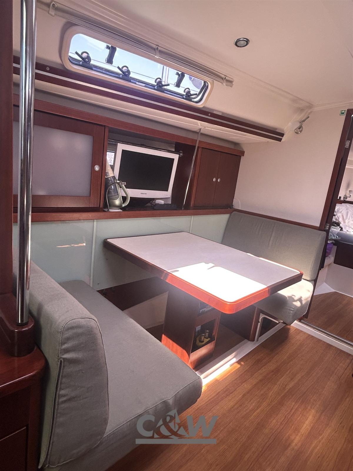 Dinette modifiée : table à manger aménagée avec des sièges agrandis à bâbord et un grand canapé à tribord