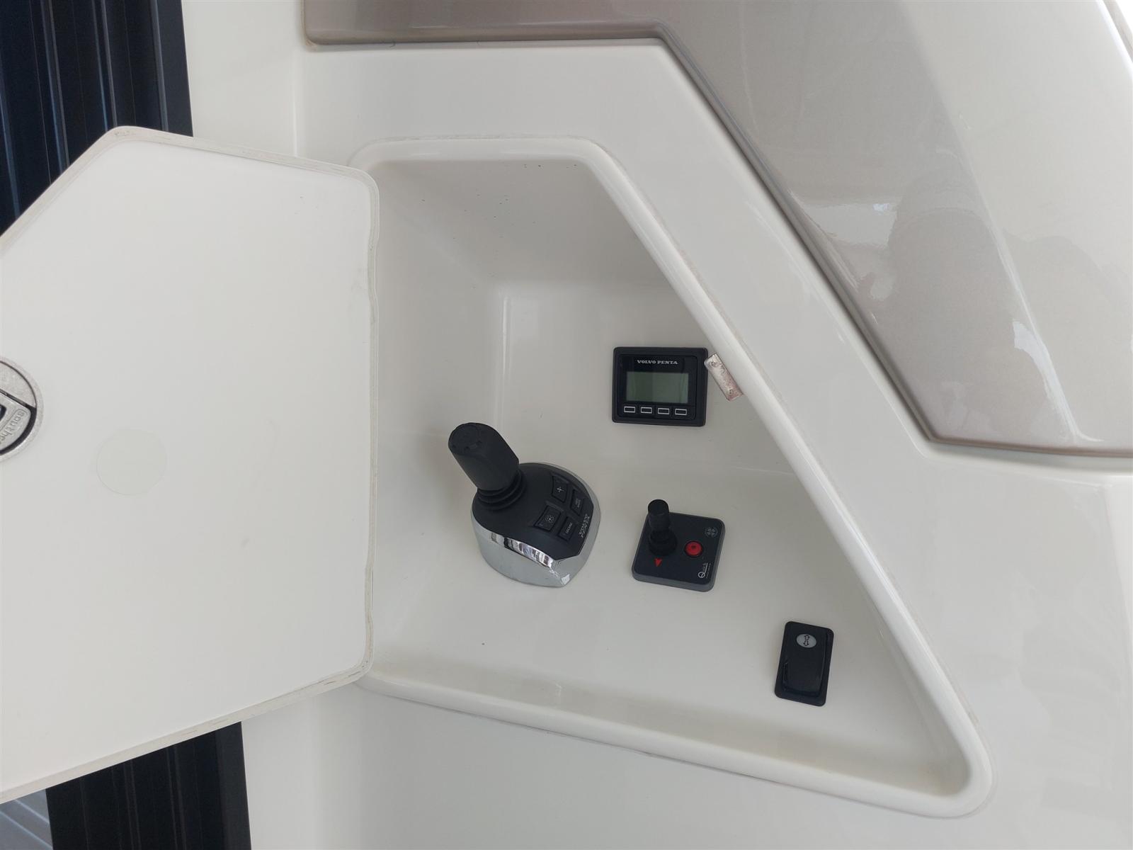 AIS, Indicateur d'angle de barre, 2 Commande électrique (Volvo Penta), 2 Ordinateur fixe de bord (Volvo Penta), Compteur de chaîne, Sondeur pêche (Raymarine), Pilote automatique (Raymarine), 2 Panneau de commande, Radar (Raymarine), Radio VHF (Raymarine), Siège copilote.
