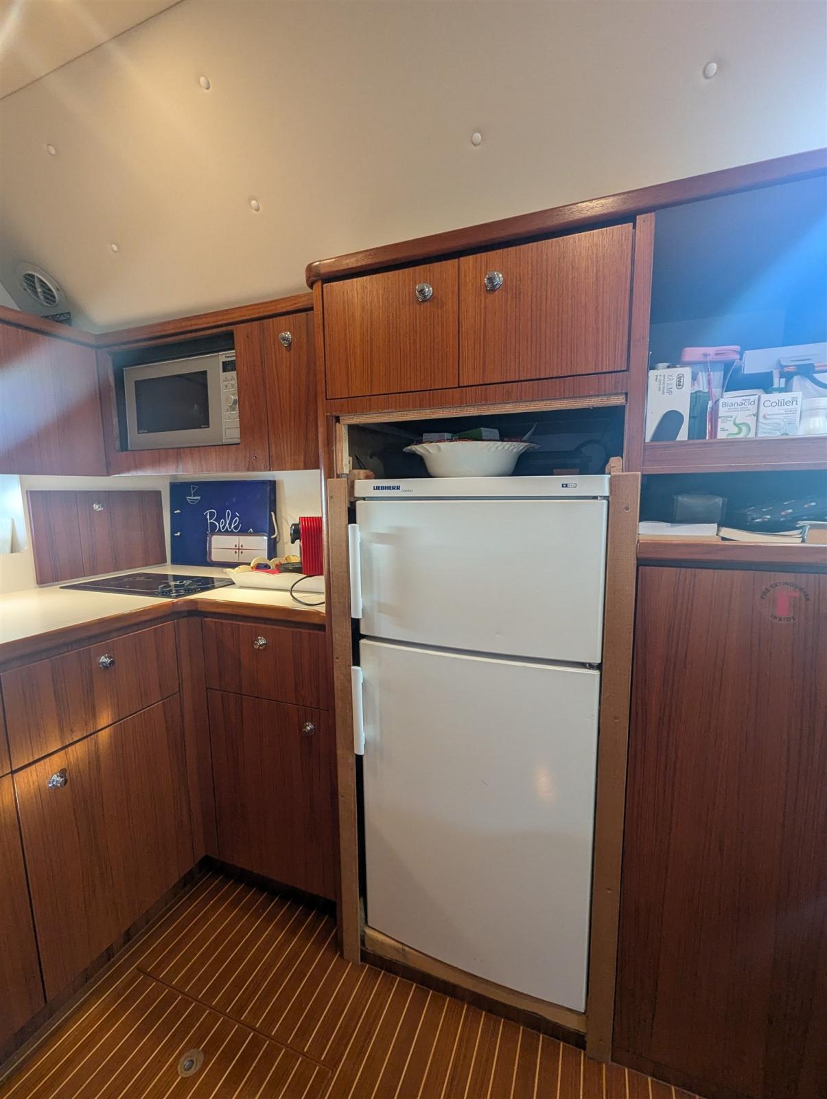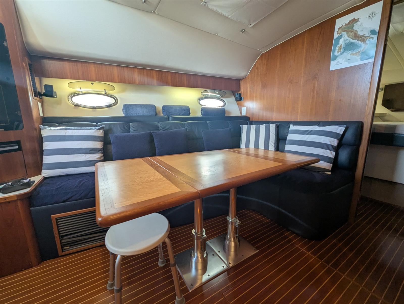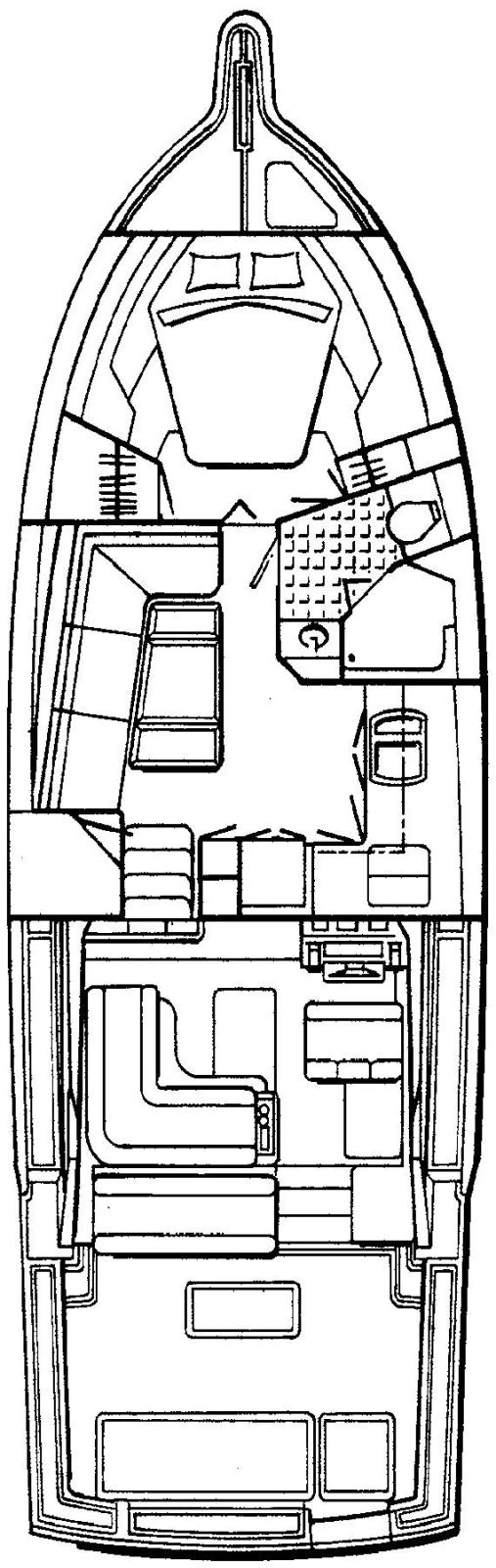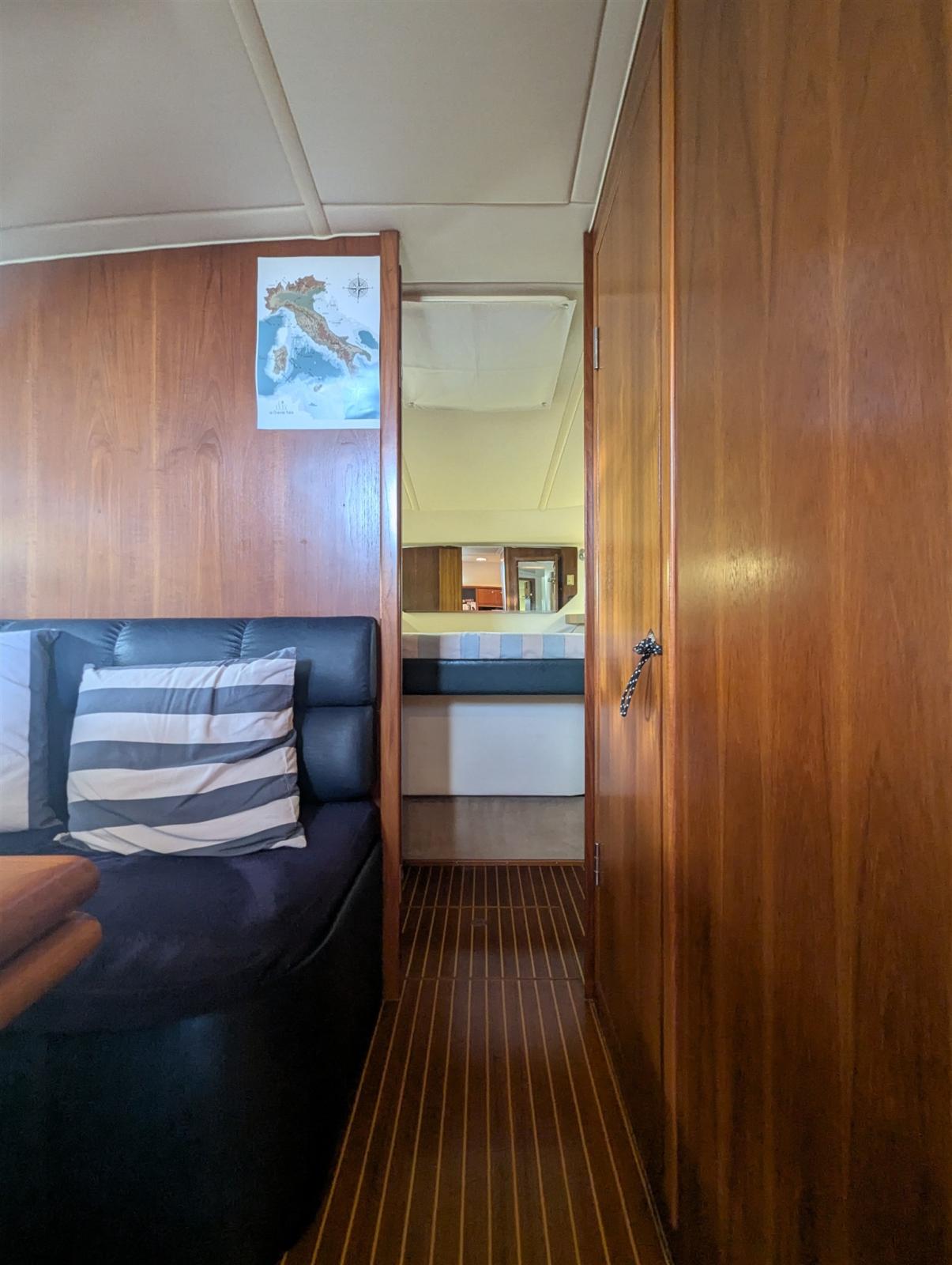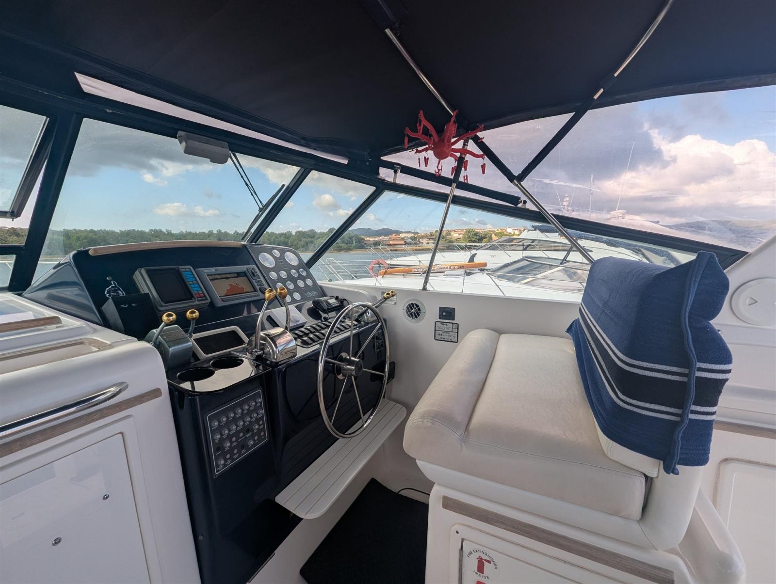 Alarme gaz, 2 Alarme moteur, Alarme de pompe de cale, Alternateur, Eau sous pression, Câble d’alimentation à quai, Filière, Douche de cockpit, Phares fixes arrière, Flaps hydrauliques, Extincteur(s) fixe(s), Lavabo dans le cockpit, Éclairage de courtoisie, Défenses, Passerelle (Manuale), Plateforme arrière, Pompe de cale automatique, Pompe à Eau de Mer, Porte latérale, Prise de quai, Connexion eau sous pression à quai, Onduleur, Rollbar, Guindeau électrique, Echelle de bain, Table pliante de salon, Corne.