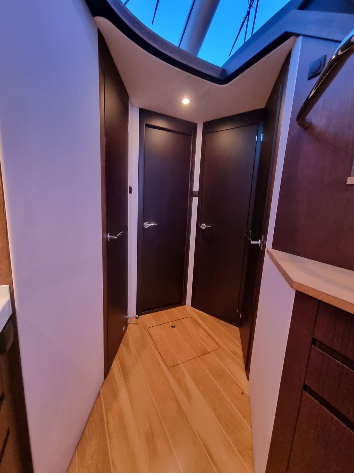 Ancre (with chain), Batteries (starter, service, generator, bow thruster), Douche de cockpit (cold/hot water), Hard top, Passerelle, Plateforme arrière (in teak), Cockpit en teck, Prise de quai, Echelle de bain.