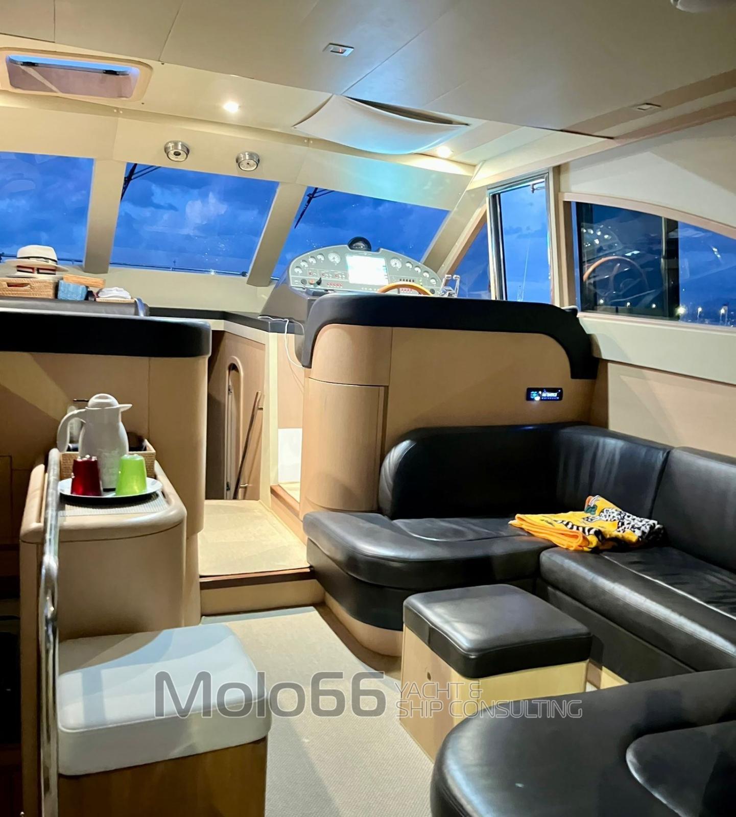 Alarme moteur, Alarme de pompe de cale, Alternateur, Eau sous pression, Passavant en teck, Couleur spéciale, Filères, Douche de cockpit, Flaps hydrauliques, Hard top, Extincteur(s) fixe(s), Éclairage de courtoisie, Passerelle, Plateforme arrière, Cockpit en teck, Prise de quai, Guindeau électrique, Echelle de bain, table de cockpit, Corne, Winch électrique arrière, Winch électrique avant.
