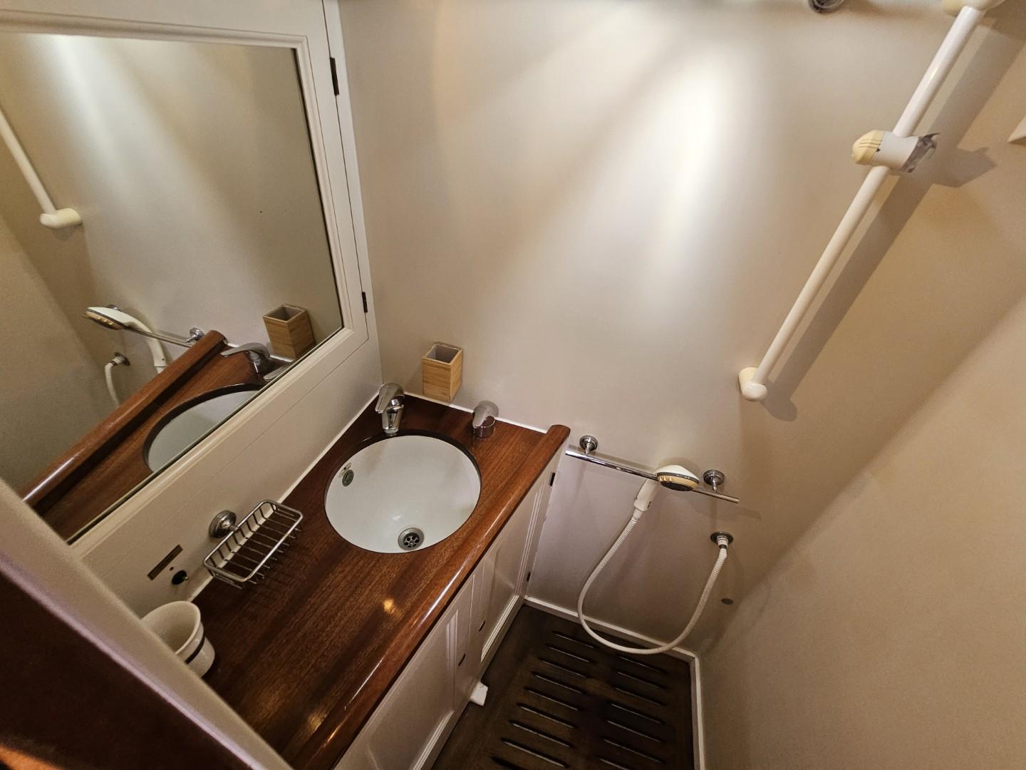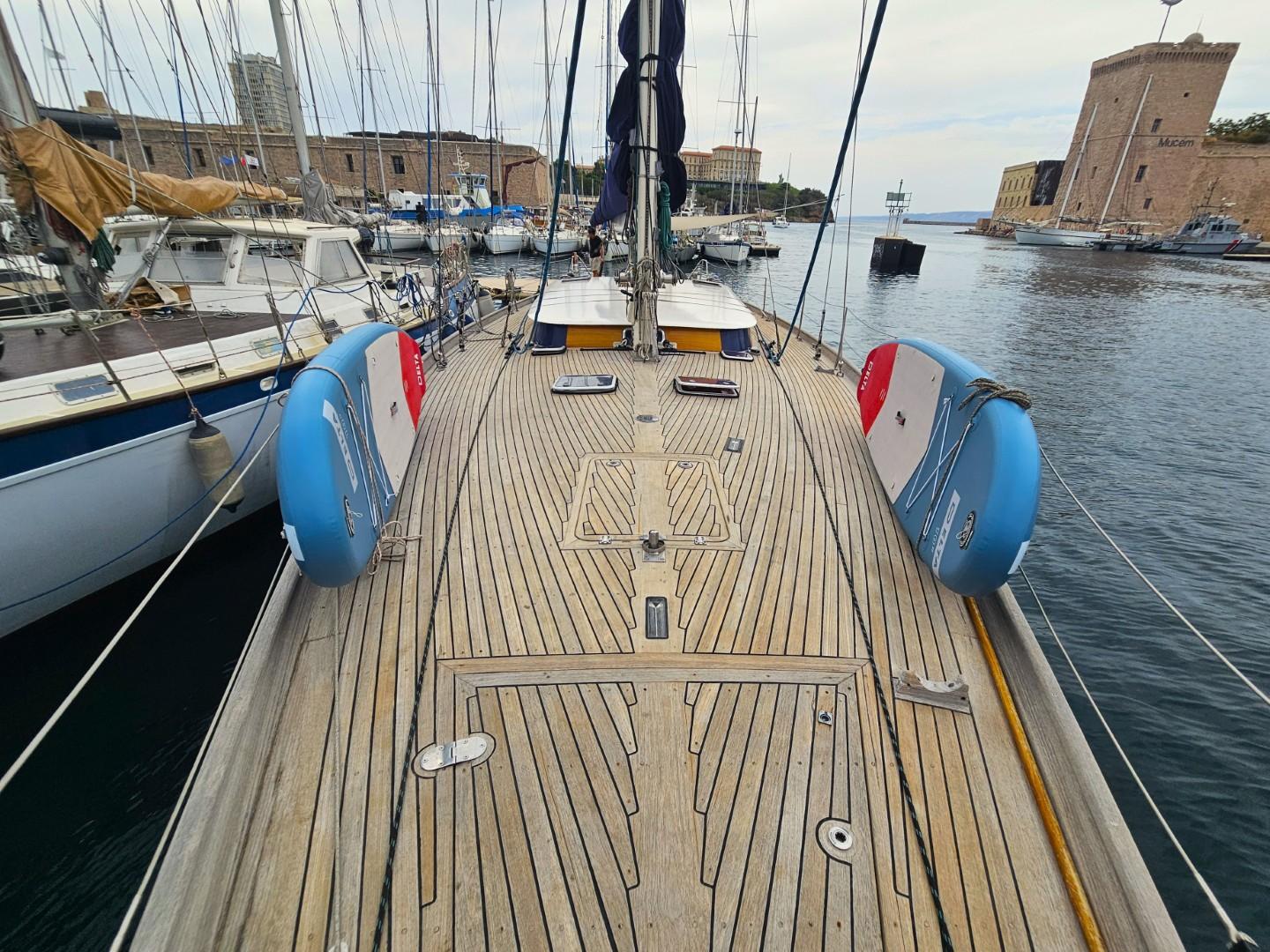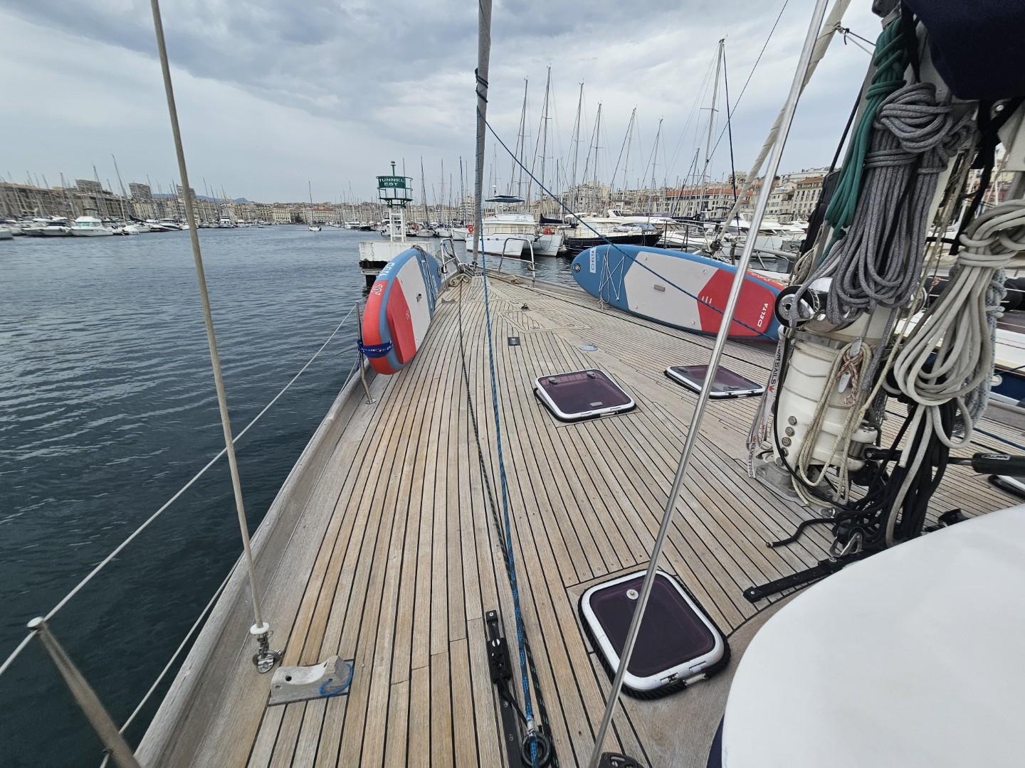 Pont en teck, Douche de pont, Coussins de bain de soleil, echelle de bain, Guindeau electrique et ancre