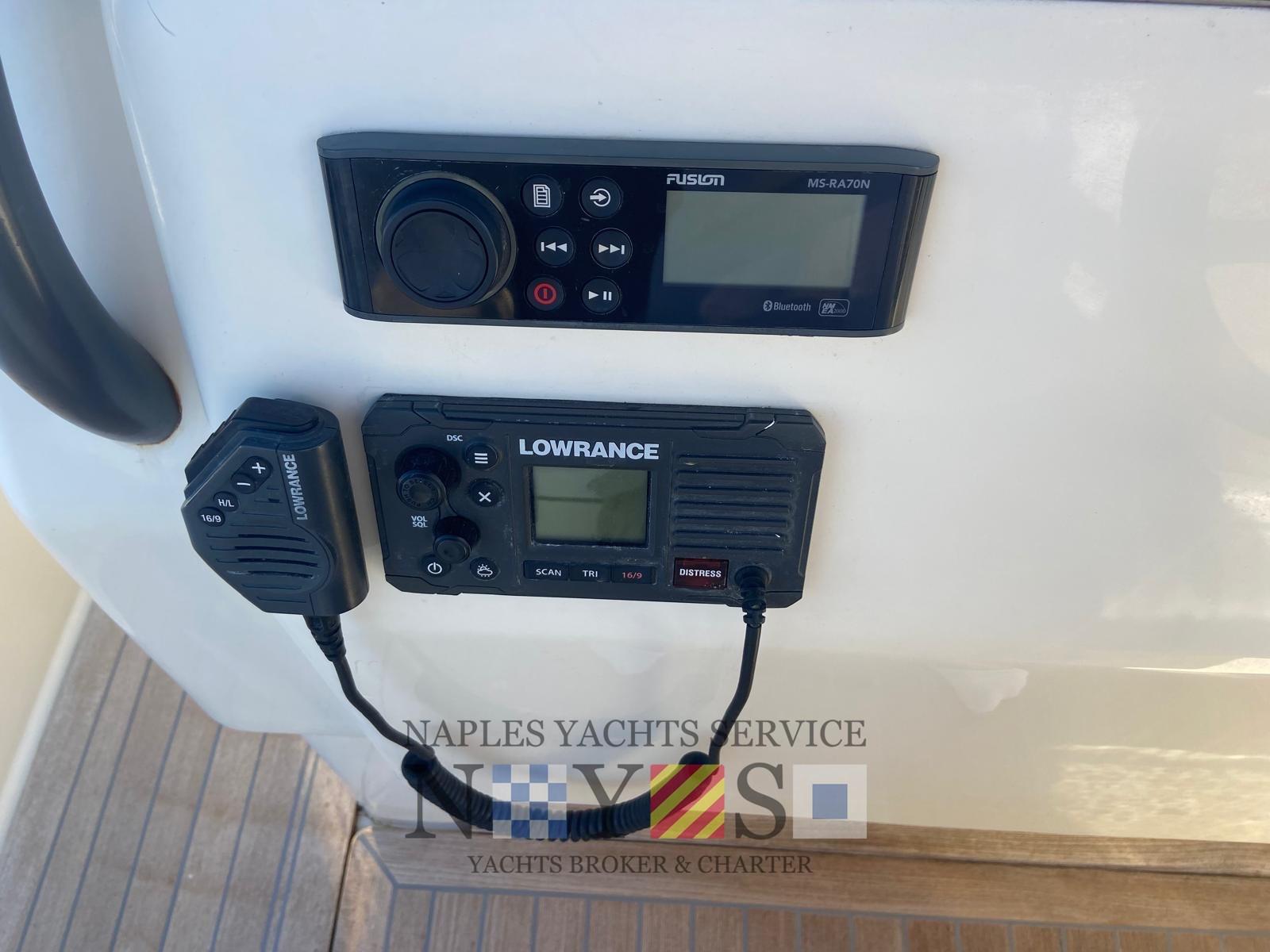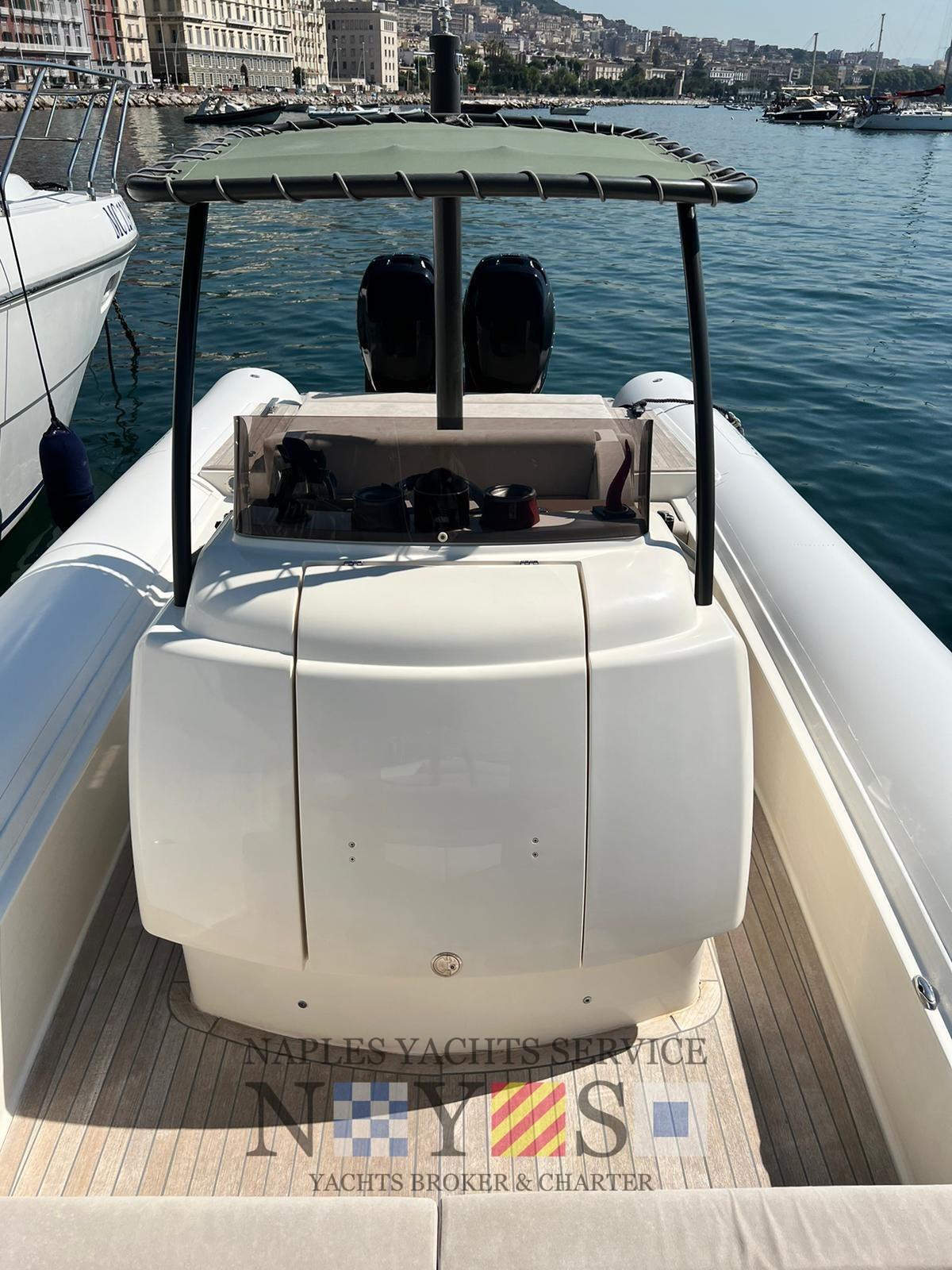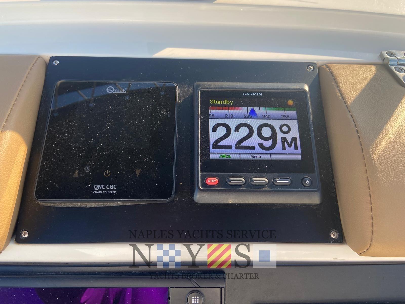 Alarme moteur, Eau sous pression, Batteries (2024), 4 Taquets pliants, Douche de cockpit, Éclairage de courtoisie, Pompe de cale automatique, Cockpit en teck (Fuga grigia), Prise de quai, Guindeau électrique, Echelle de bain (Acciaio artigianale 2024), Table (Ribaltabile a poppa), Corne.