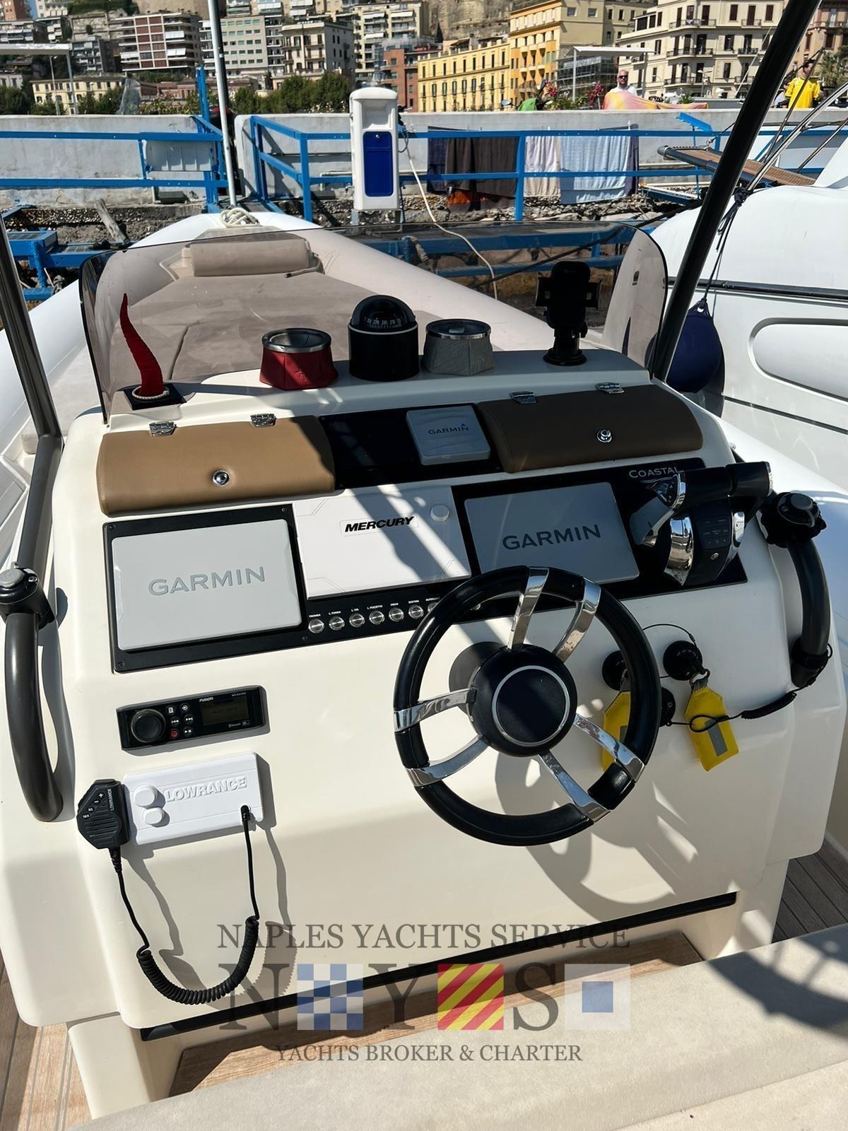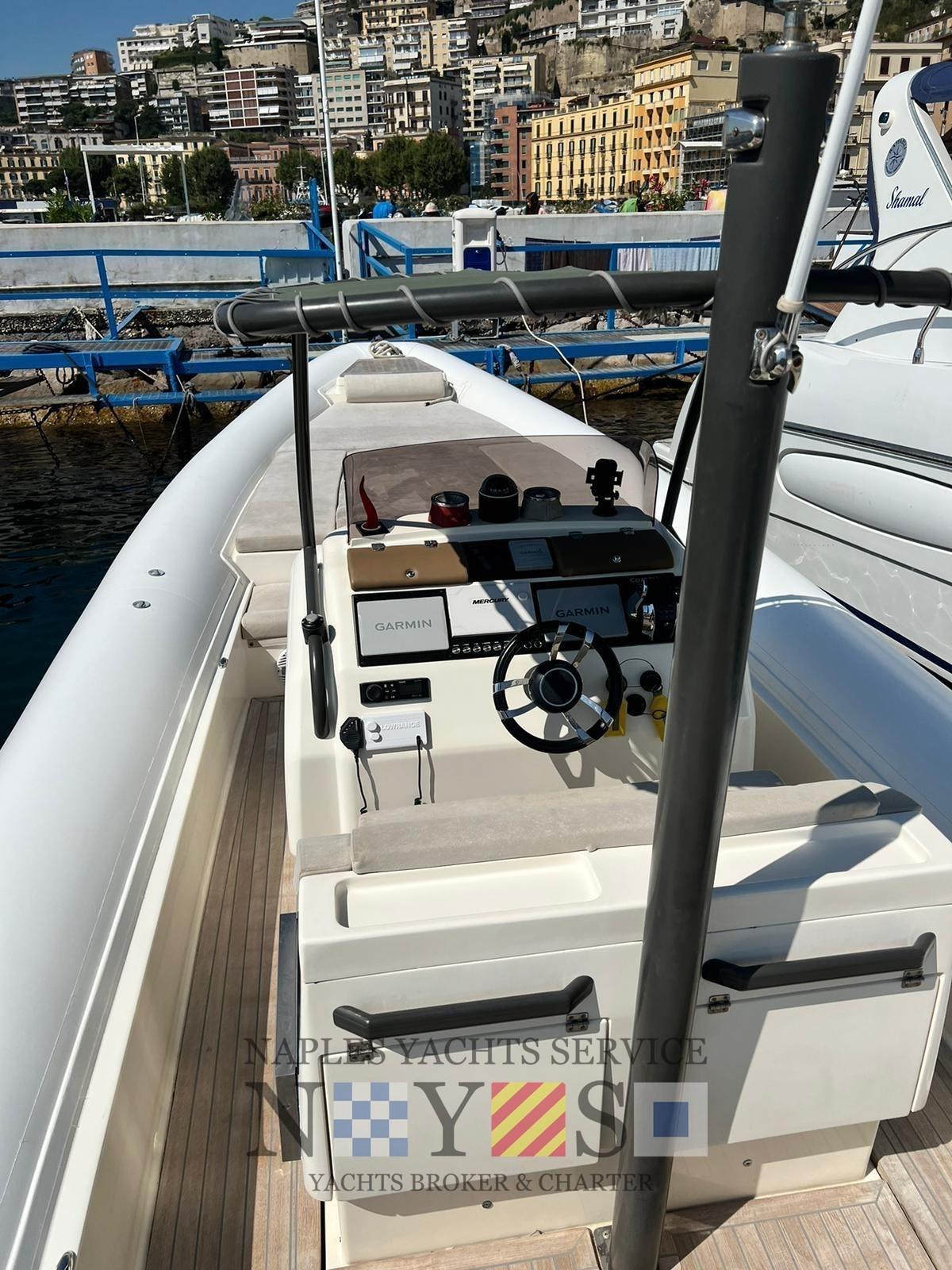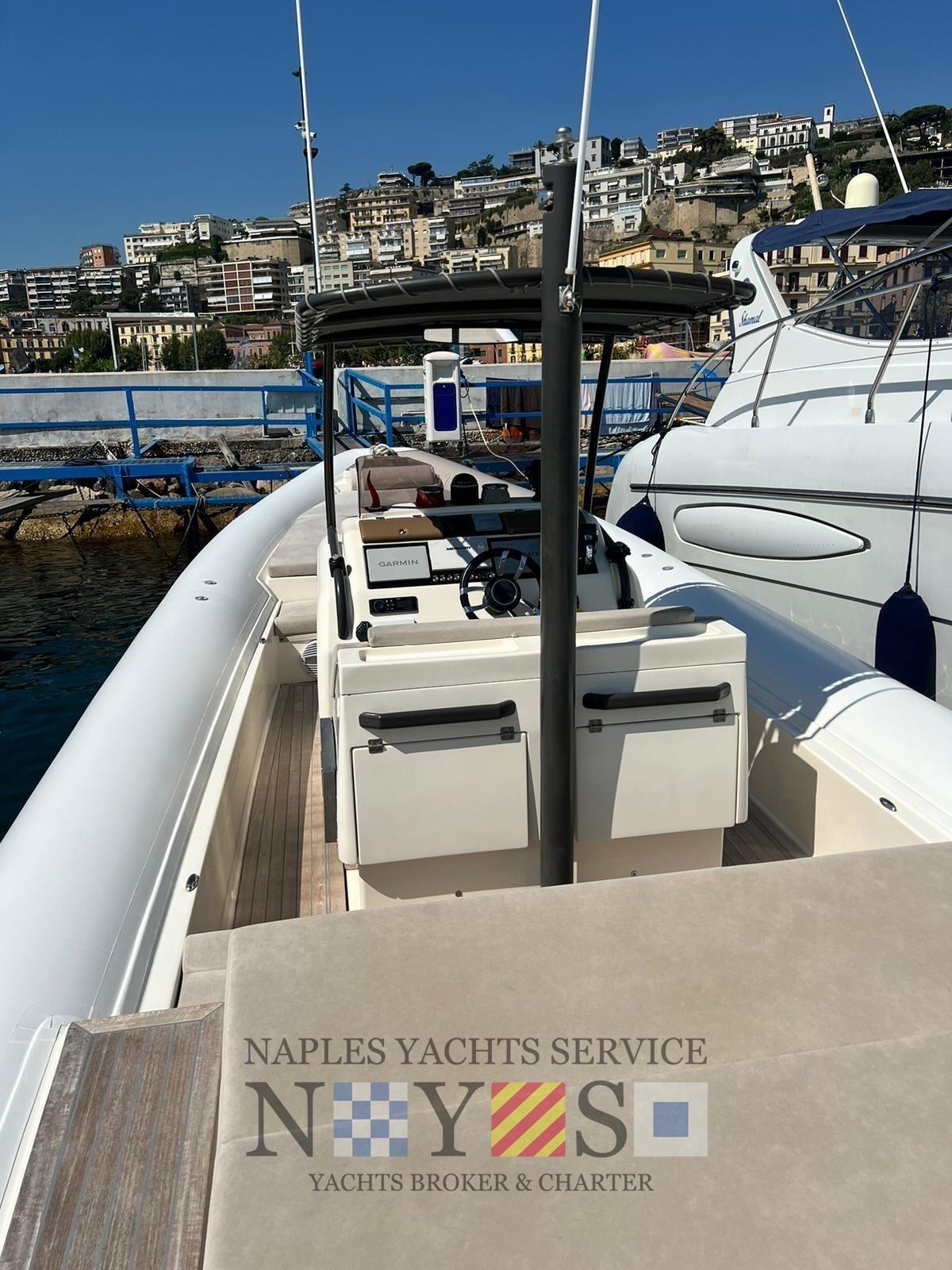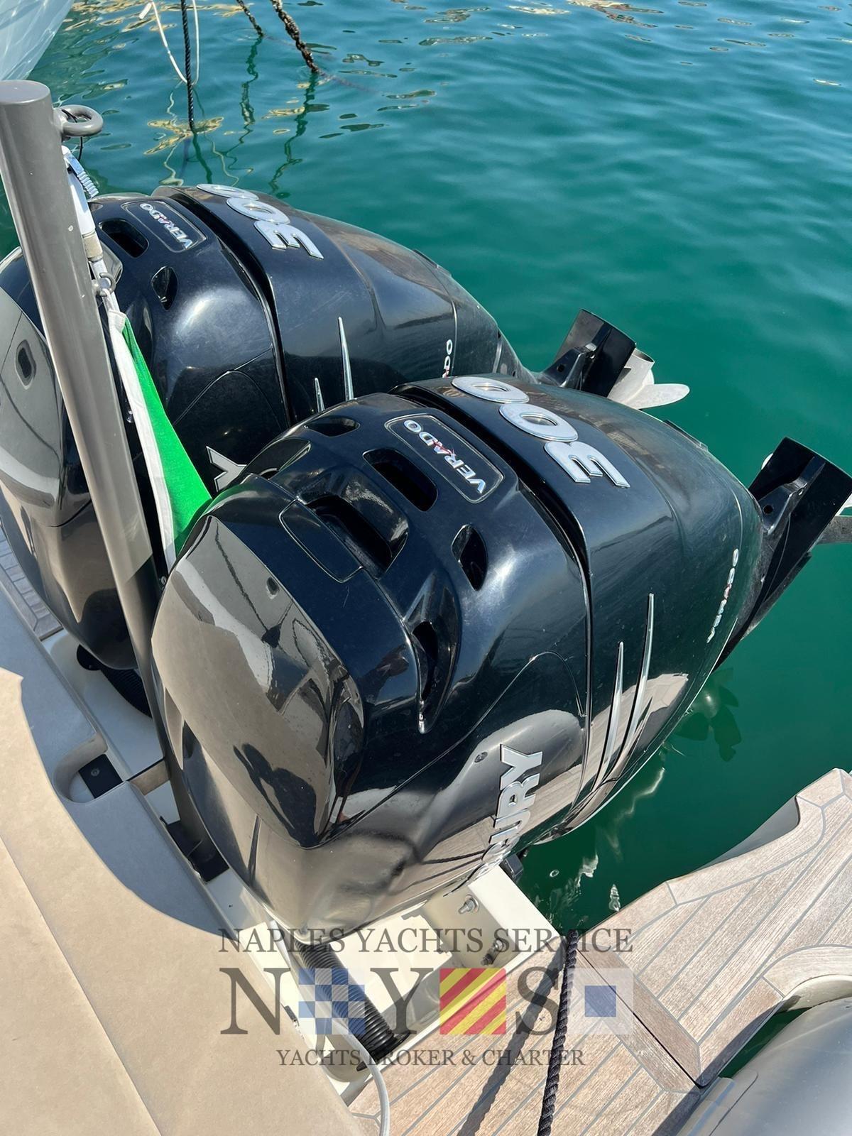Alarme moteur, Eau sous pression, Batteries (2024), 4 Taquets pliants, Douche de cockpit, Éclairage de courtoisie, Pompe de cale automatique, Cockpit en teck (Fuga grigia), Prise de quai, Guindeau électrique, Echelle de bain (Acciaio artigianale 2024), Table (Ribaltabile a poppa), Corne.