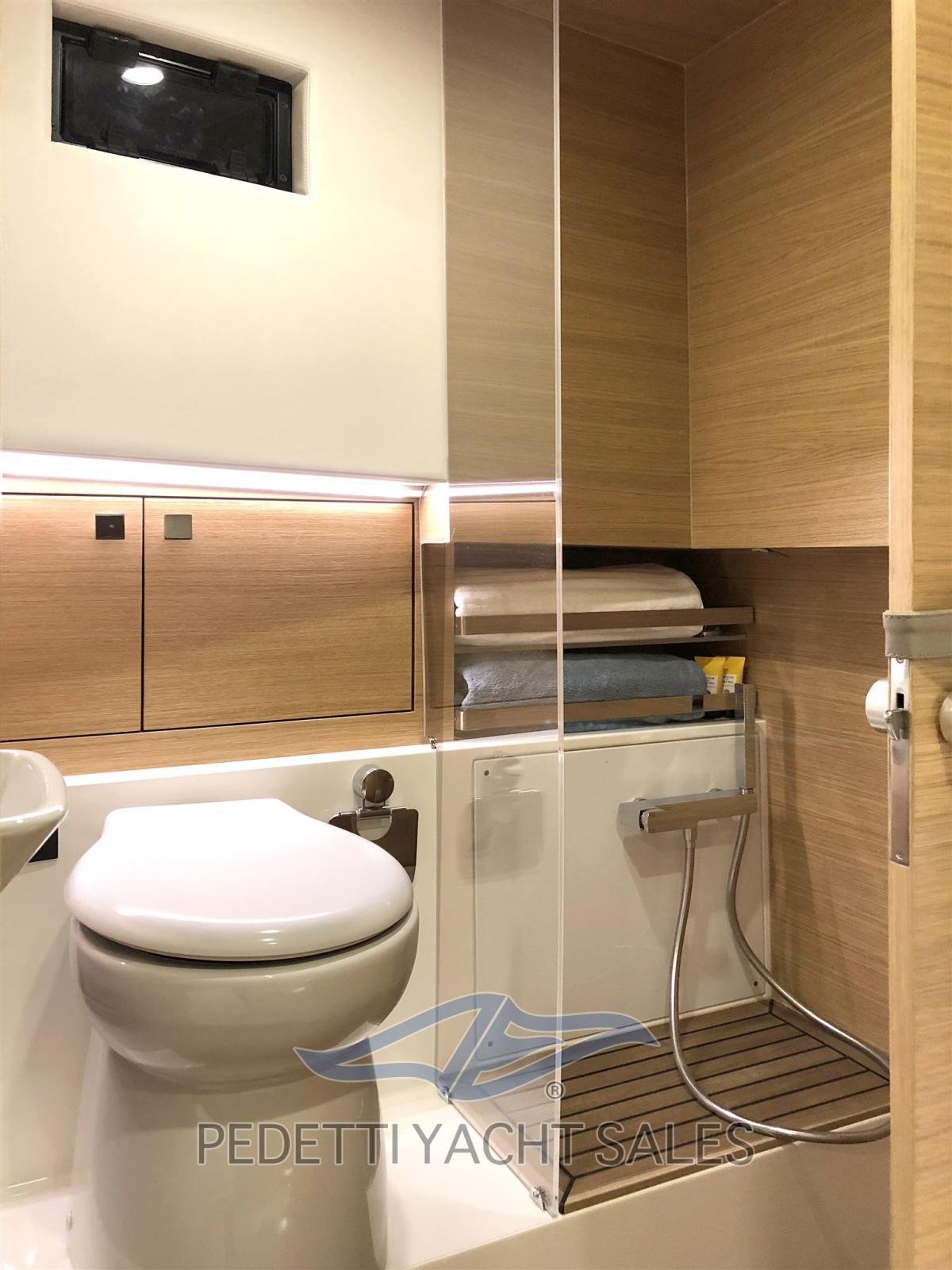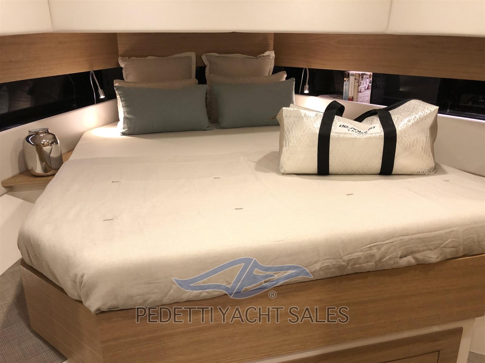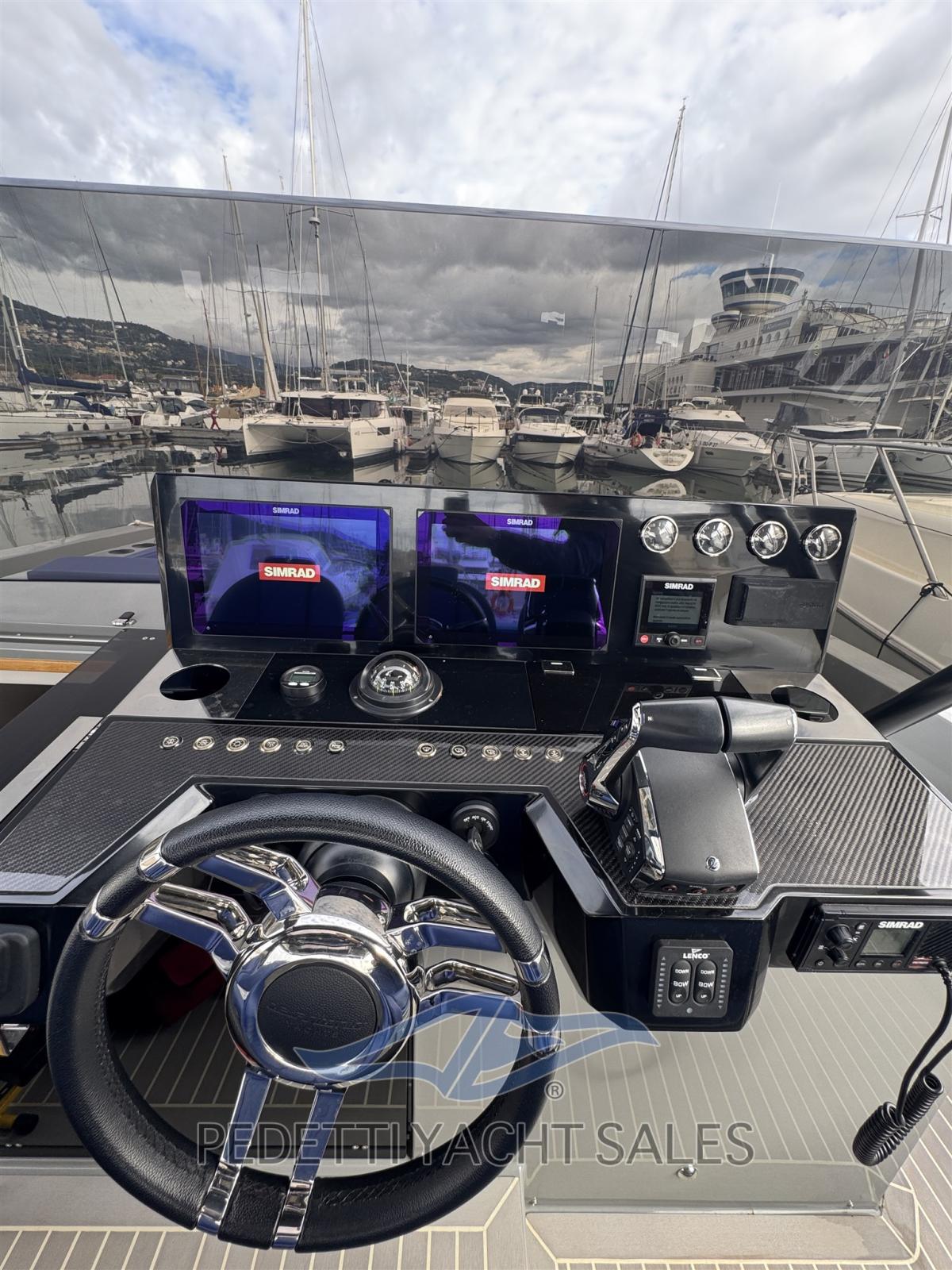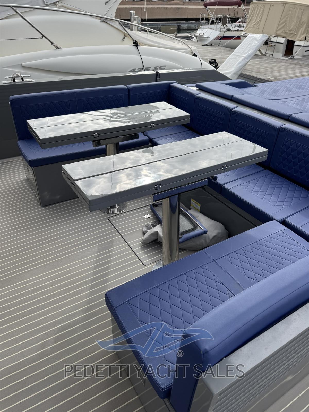 Alarme moteur, Alarme de pompe de cale, Ouverture du compartiment moteur électrique, Flaps hydrauliques, Garage à annexe, Hard top, Indicateurs de flaps, Éclairage de courtoisie, Pompe de cale automatique, Cockpit en teck, Prise de quai, Guindeau électrique, Echelle de bain.