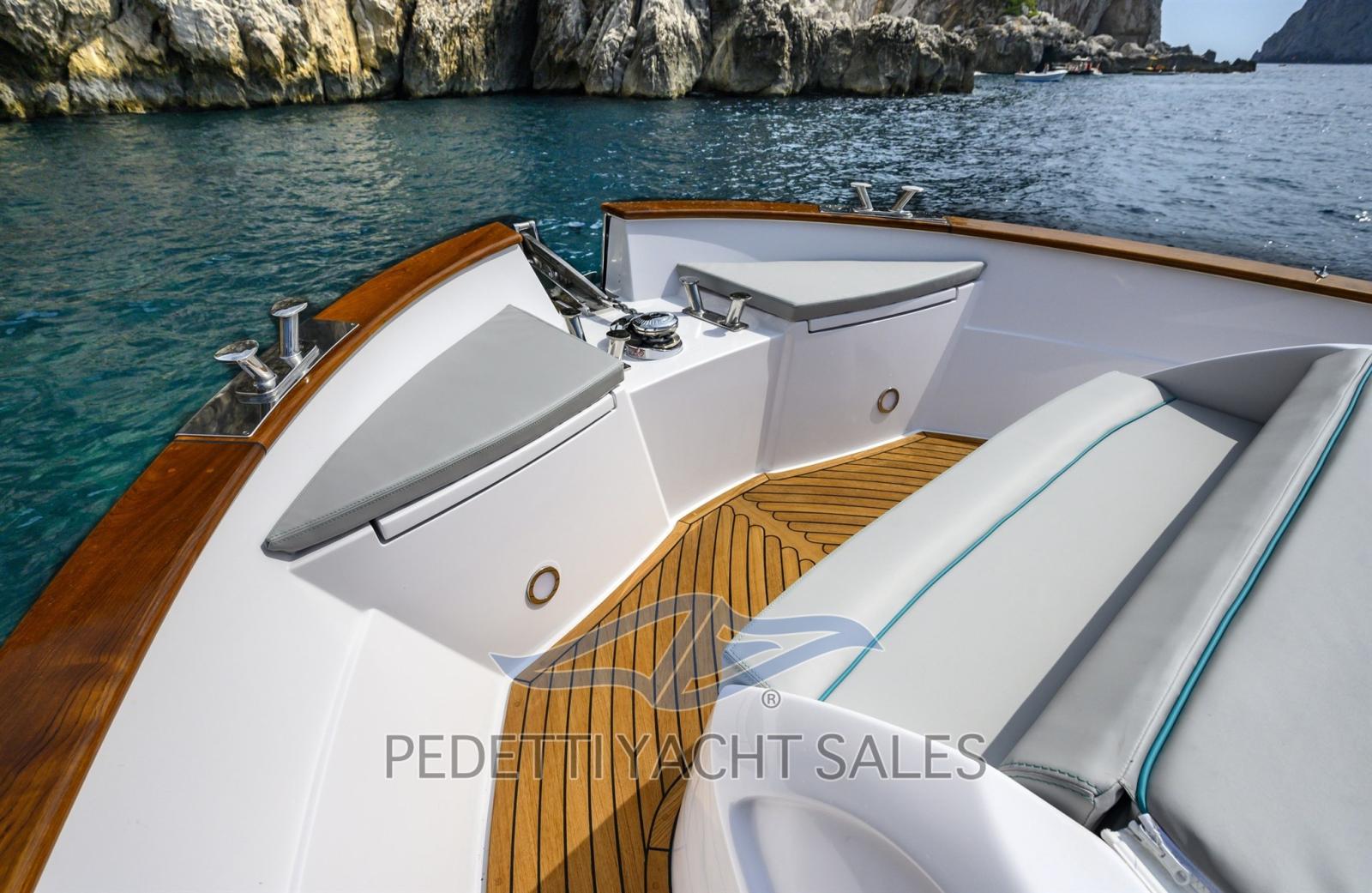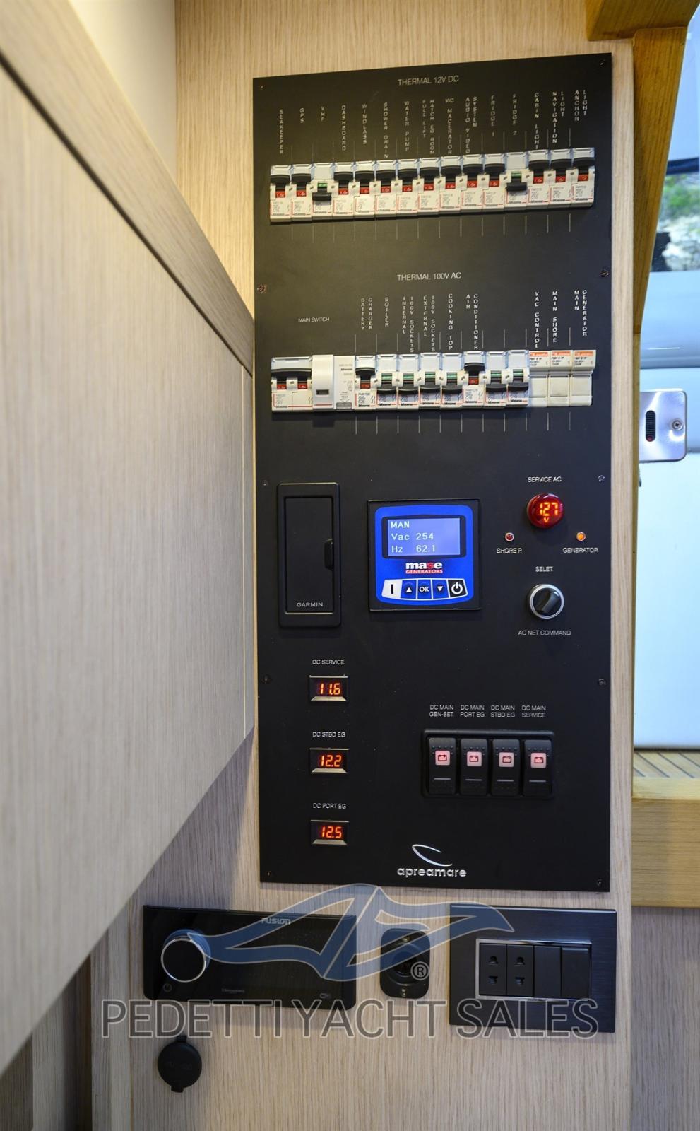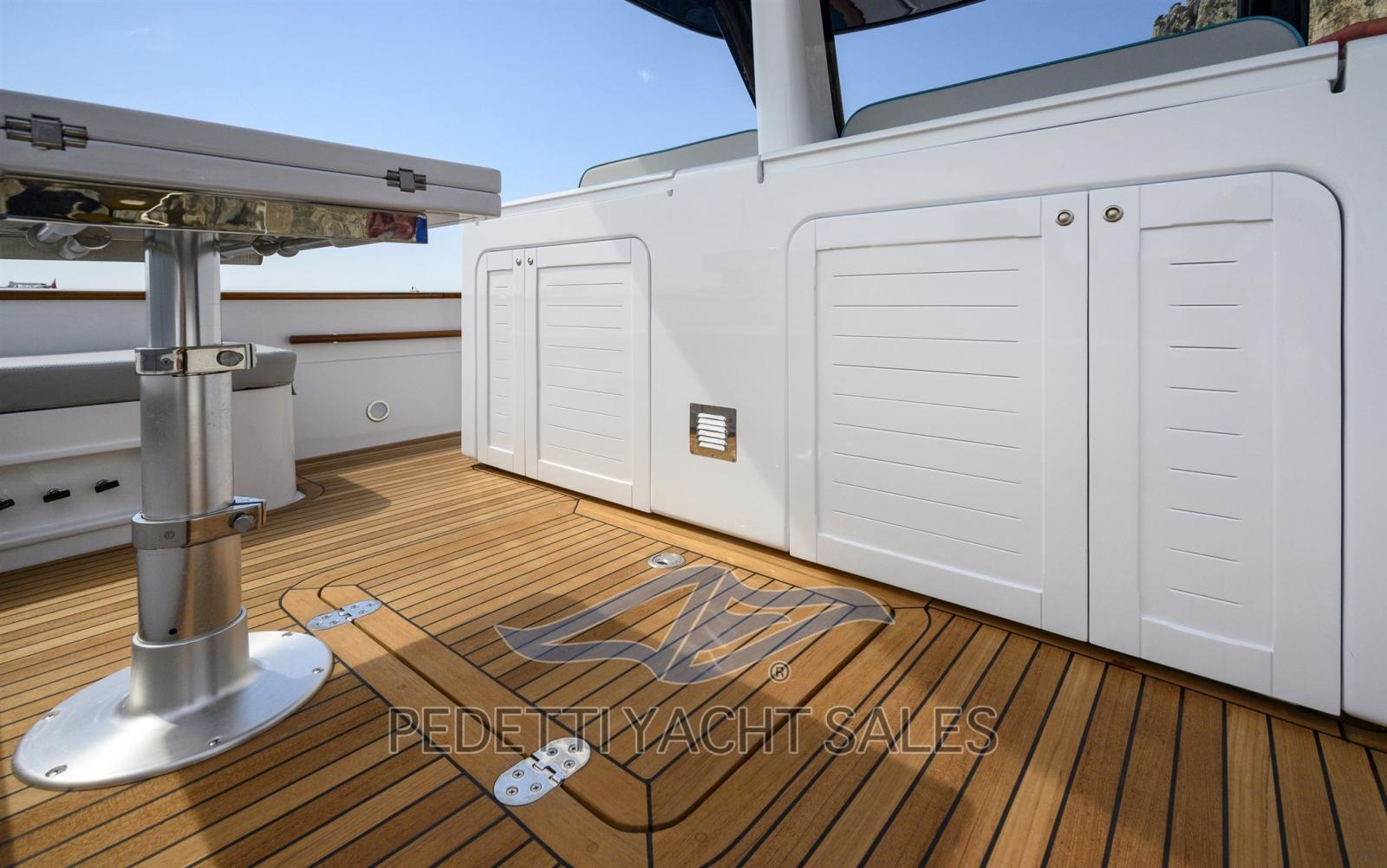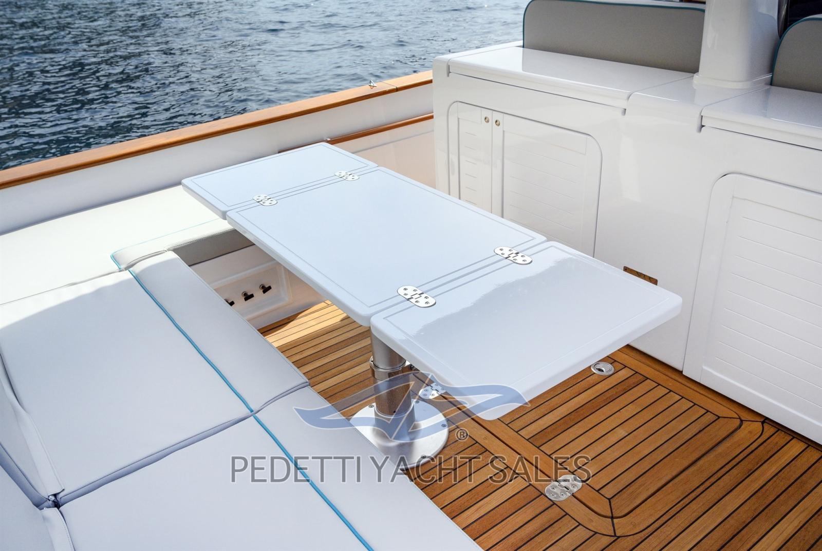 Alarme gaz, Alarme moteur, Alarme de pompe de cale, Eau sous pression, 4 Batteries (2x225 Ah 2x180 Ah), Passavant en teck, Câble d’alimentation à quai, Douche de cockpit (A poppa calda e fredda), Flaps électriques, Extincteur(s) fixe(s) (A polvere in sala macchine), Indicateurs de flaps, Lavabo dans le cockpit, Éclairage de courtoisie, 8 Défenses, Plateforme arrière, 2 Pompe de cale automatique, Pompe de cale manuelle, Pont en teck, Cockpit en teck, Prise de quai, Guindeau électrique (1000 W), Echelle de bain, table de cockpit, Corne, T-Top.