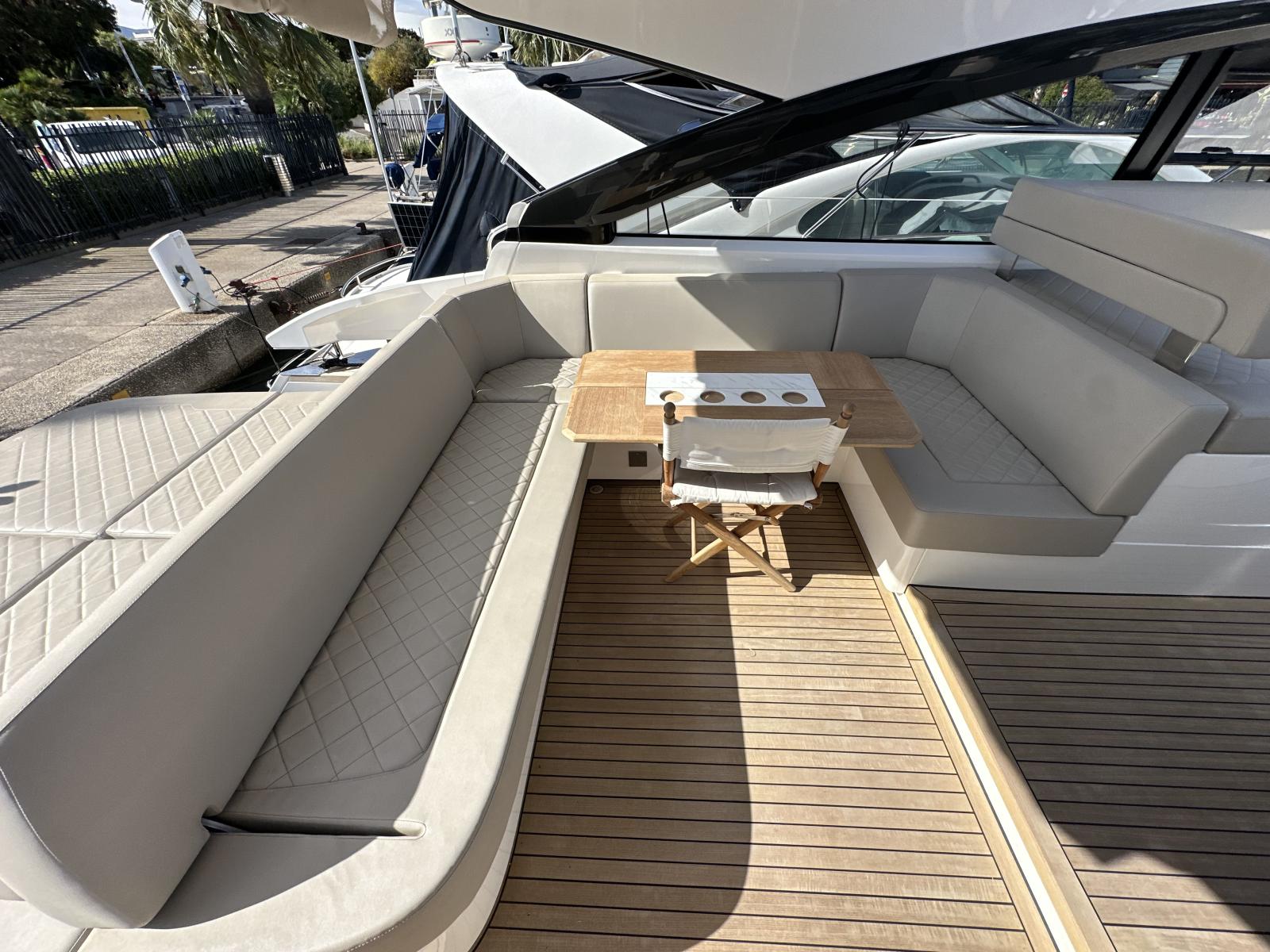 Cockpit spacieux avec grand bain de soleil arrière, table en teck et bar extérieur équipé (réfrigérateur, évier, plaque).