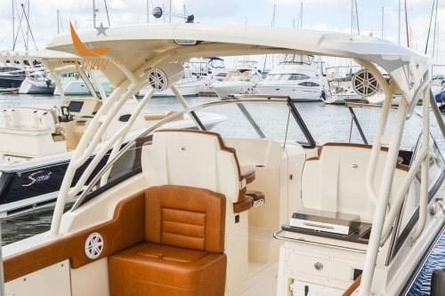 • Sièges d’étrave entièrement rembourrés avec rembourrage amovible • Fauteuils capitaine de luxe à dossier en fibre de verre avec accoudoirs et coussin rabattable • Siège de salon électrique • Siège arrière rabattable • Siège rabattable à bâbord • Compartiment à cannes latéral droit • Compartiment de rangement à l’avant • Casier à skis • Compartiment de rangement de console • Taquets à ressort rétractables • (1) Phender Pro set au milieu du navire de chaque côté • Main courante d’étrave fendue en acier inoxydable • (7) Porte-gobelets en acier inoxydable • (4) porte-cannes de poupe en acier inoxydable • Plinthe en acier inoxydable • Tiroir à ordures • Porte de passage • Seakeeper • Plates-formes de bain avec échelle • Direction hydraulique • Lavage à l’eau douce (10 gal) • Puits d’appât aéré/recirculant • Film rétractable • Lumières 100 % LED • Garmin 943XS avec transducteur GT12M • Stéréo Bluetooth JL Fusion avec (4) haut-parleurs de 7 po • Planche à découper et évier en Corian® avec réfrigérateur YETI de 35 po qt et tiroir à outils • Port combo USB/USB-C et port USB supplémentaire dans la boîte à gants de pilotage • Batteries de démarrage et domestiques • Chargeur de batterie • Lavage de l’ancre d’eau douce • Treuil, ancre en acier inoxydable, corde et chaîne • Panneau avant du gouvernail noir