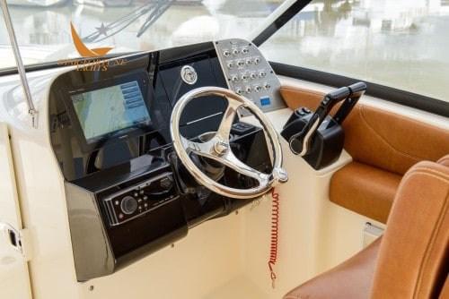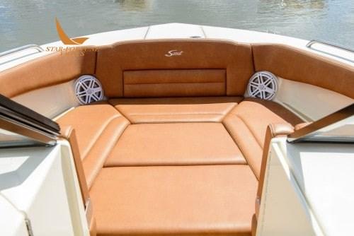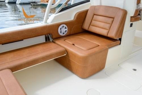 L’une des innovations uniques à bord du modèle est un siège électronique orienté vers la poupe qui se transforme facilement en chaise longue lorsqu’il est activé, complété par le siège arrière bâbord rabattable.
