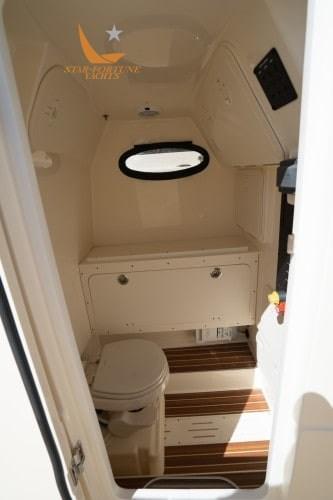 Il est doté de caractéristiques standard telles qu’une plate-forme de bain arrière entièrement praticable avec système Esthec, une porte à charnières sur le côté bâbord, des sièges avant avec dossiers amovibles et compartiment de rangement en dessous, et un toit rigide en T avec pare-brise intégré, pour n’en nommer que quelques-uns.
