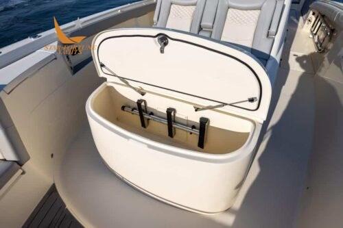 • Coffres de rangement et trappes éclairés par LED • (8) taquets affleurants de 10 po • (10) porte-tiges de mât avant affleurants en acier inoxydable • (4) ensembles Phender Pro = (4) récepteurs et (4) goupilles • Sièges d’étrave à 180 degrés avec dossiers et coffres de rangement • Console d’étrave avec doubles bains de soleil et salon profilé avec coussins, accoudoirs et rangement inférieur • Glacière/boîtes de rangement avant dans le mât avant • Grand compartiment de rangement au milieu du navire • Toit rigide breveté peint sur poudre avec fermeture en verre incurvé • Accès au toit ouvrant coulissant • 3 sièges de barre du capitaine • Siège de salon surélevé face à l’arrière avec machine à glaçons transparente, réfrigérateur à tiroirs ou tiroirs à outils • Rangement pour cannes sous le mât de misaine à l’avant (3) • Salle technique au milieu du navire • Plate-forme de plage à terre • Caisses à poisson avec décharge à membrane par-dessus bord (92 gallons chacune) • Porte d’accès au tableau arrière acrylique • Plate-forme de tableau arrière avec échelle sous-marine Armstrong • (5) Porte-cannes de tableau arrière affleurants • Grand siège arrière avec deux puits d’appâts ventilés à bâbord et à droite • Coque à deux niveaux efficace infusée d’époxy • Zipwakes • Pont auto-videur • (1) Feux de proue à LED et (2) feux de poupe • Système lithium-ion 48V (sélectionnez l’ensemble moteur) • Commutation numérique CZONE • (2) écrans Garmin MFD 8616 avec capacité WiFi • Unité principale Fusion avec capacité Bluetooth (10) Haut-parleurs JL Audio (7,7 M6) (2) Amplificateurs JL Audio (2) Caisson de basses JL Audio 10 » • Antenne AM/FM montée sur le toit rigide • Connexion USB • Lumières de distribution LED à l’avant et (2) à l’arrière dans le toit rigide • Chargeur Xantrex Truecharge 3 • Climatiseur 12 000 BTU • Plaque vitrocéramique à un brûleur • Micro-ondes • Téléviseur LED 32 » avec 2 haut-parleurs • Réfrigérateur à tiroirs • Évier de cuisine • Douche et toilette, lavabo en verre et miroir avec armoire de maquillage • Couchette double convertible (6' 5" de longueur) • Table superposée en corian • Compartiment de rangement vertical en roseau dans la cabine (5) • Éclairage LED • Réservoir de vidange à la mer (16 gal.) • Crédence en acrylique • Tube de lavage d’ancre de proue/treuil • Treuil Lewmar avec commande de gouvernail et commutateurs au pied de proue • Ancre, Chaîne (40 pieds) et ligne (300 pieds) en acier inoxydable Lewmar • Caméra d’ancre à l’avant • Essuie-glace et lavage à l’eau douce (51 gallons) • Tubes rétractables d’eau douce et d’eau brute dans le toit rigide • Feux de navigation • Boussole magnétique Richie • Klaxon • Éclairage de courtoisie à LED avec gradation • Eau chaude • Sièges de barre chauffants • Seakeeper 4.5