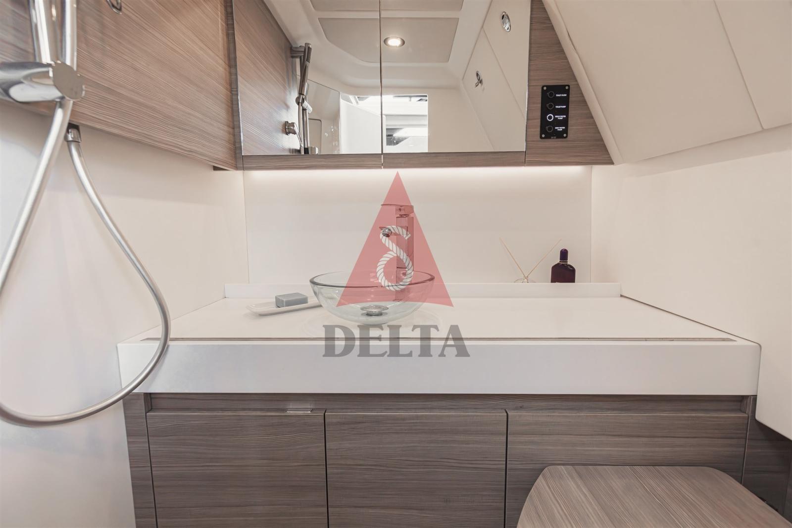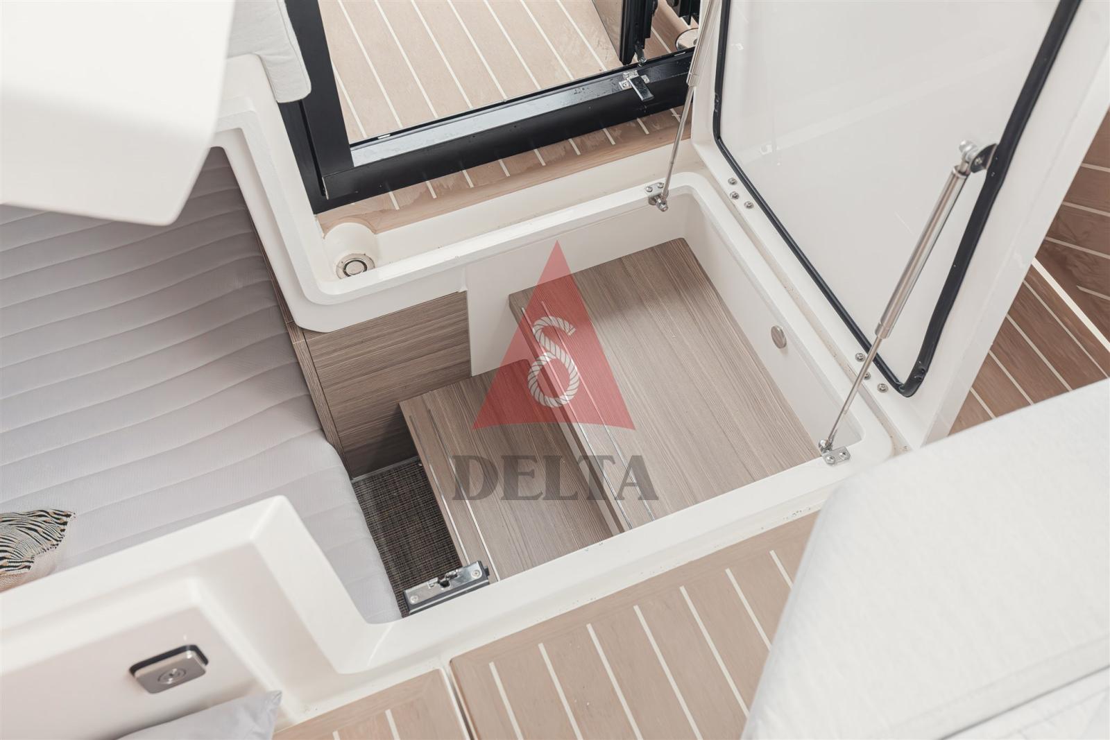Lit cabine à l’avant - Système d’eau douce comprenant une chaudière de 40 litres, eau chaude et douche sur le pont arrière - Salle de bain avec WC et douche électriques - Réservoir d’eaux noires avec vidange électrique et sortie d’aspiration sur le pont - Module cuisine avec réfrigérateur - Flexiteak dans la douche