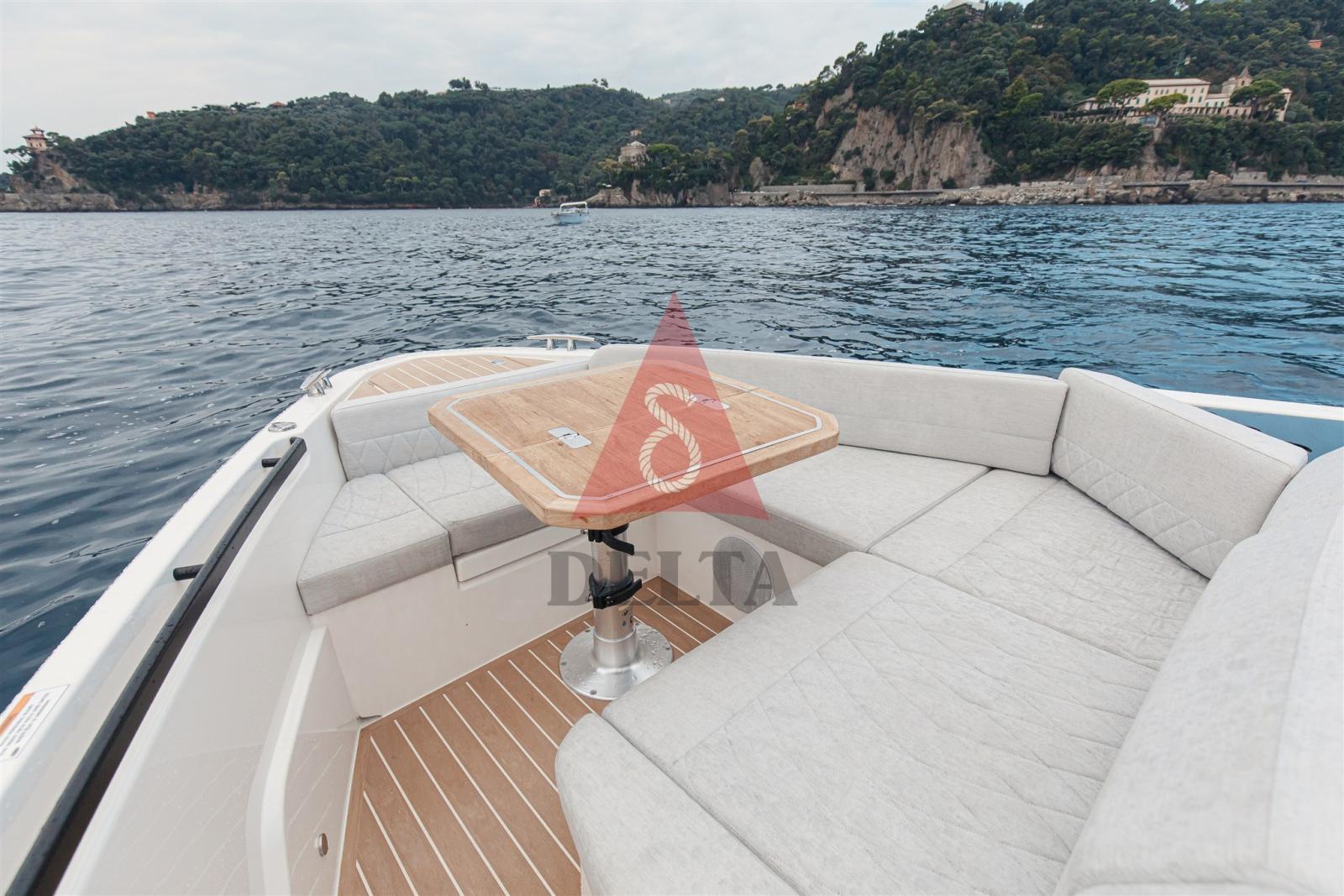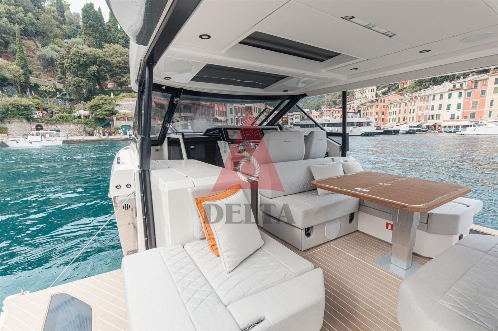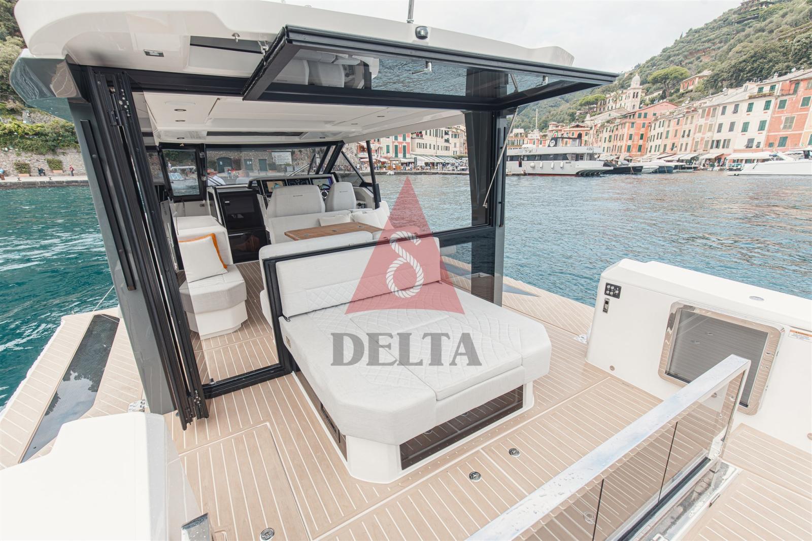 Coque infusée sous vide - gelcoat RAL 9010 (blanc) - Toit en toile coulissant électriquement - Glacière intégrée dans le pont arrière - Porte-gobelets - Essuie-glace - Terrasses ouvrables des deux côtés (près de 4 mètres de long)