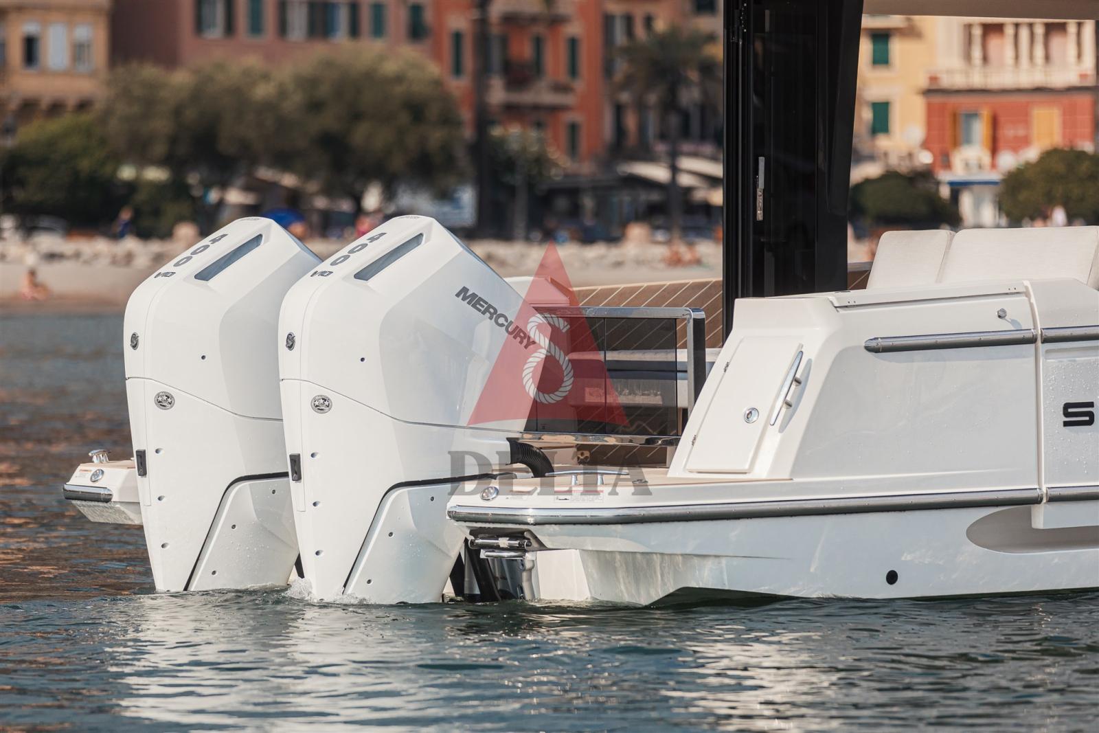 2 moteurs hors-bord Mercury Black V10 400 HP « R » avec joystick - 8 bollards d’amarrage - Propulseur d’étrave - Système d’interception automatique ZipWake - Mercury Active Trim - Mercury VesselView Mobile - Mercury SmartCraft Connect
