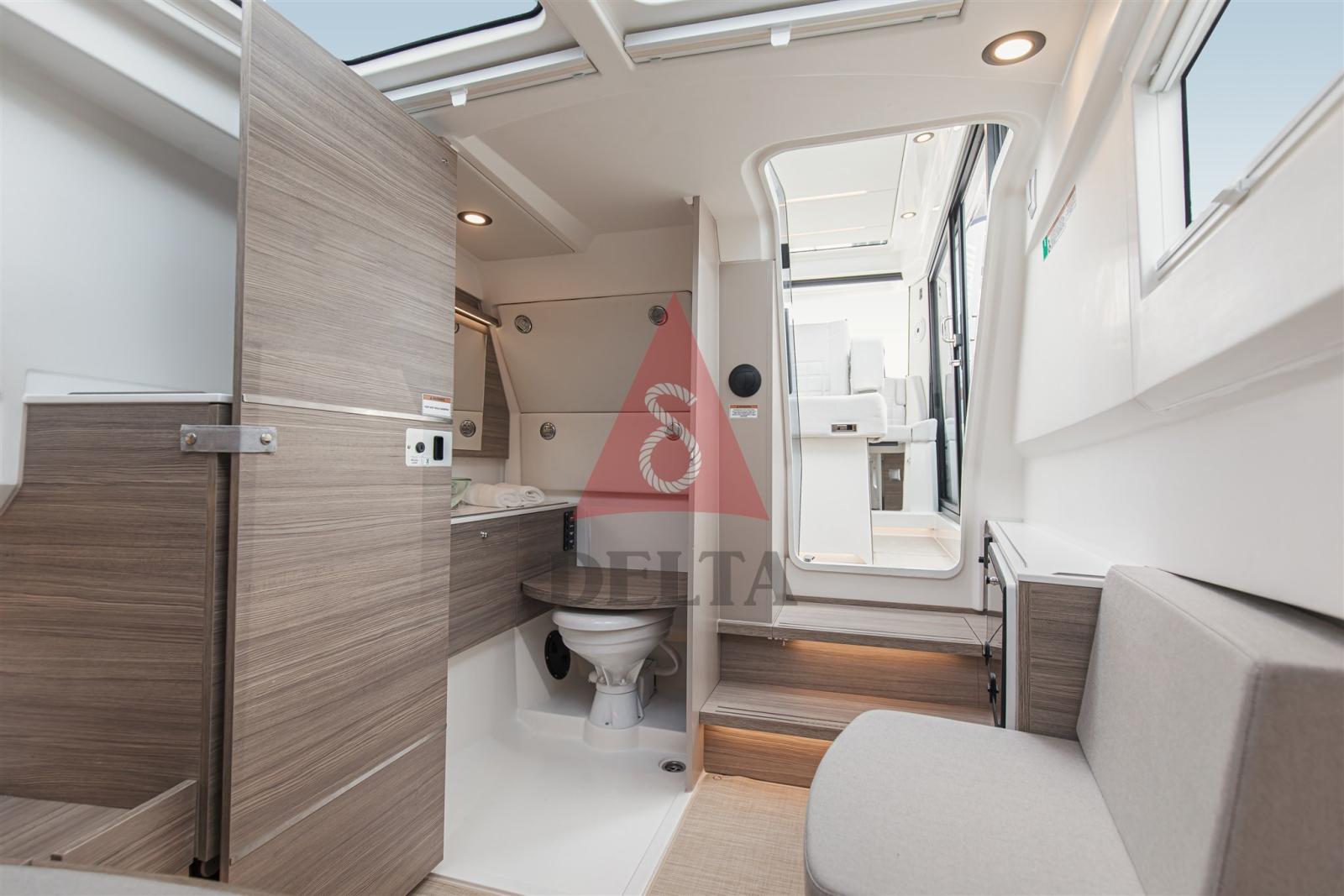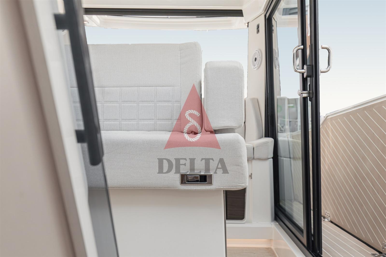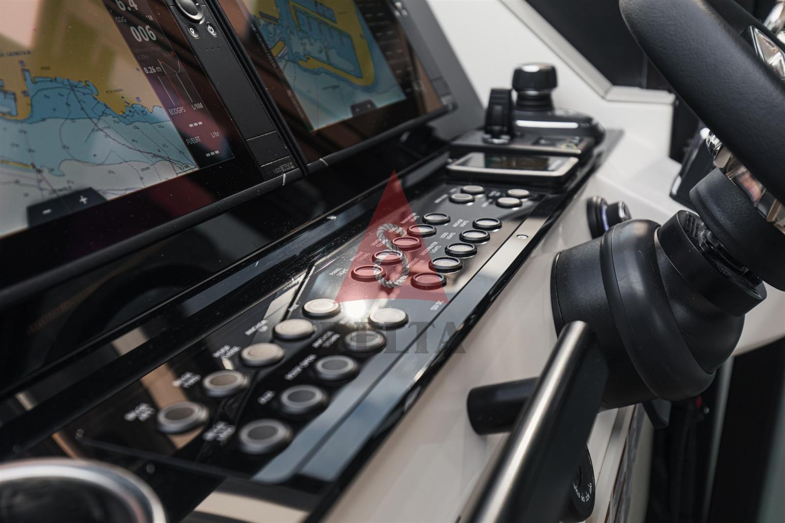 Terrasses latérales à ouverture électrique (charge maximale 150 kg) - Armoire de bar humide - Coussins d’étrave - Finitions antidérapantes sur les ponts et les écoutilles - Mains courantes intégrées sur le pont - Volets latéraux fixes pour un embarquement latéral facile - Échelle de bain télescopique - Trappes sur le pont avant pour un accès facile - 2 x Trappes encastrées - Poignées et taquets - Système de dégagement rapide des ailes - Conteneur extincteur avec trappe à feu - Table extensible avec pied télescopique - Rétroviseur dans la cabine avant - Autocollants sur la coque - Volant en cuir - Porte-gobelets dans la console et pour