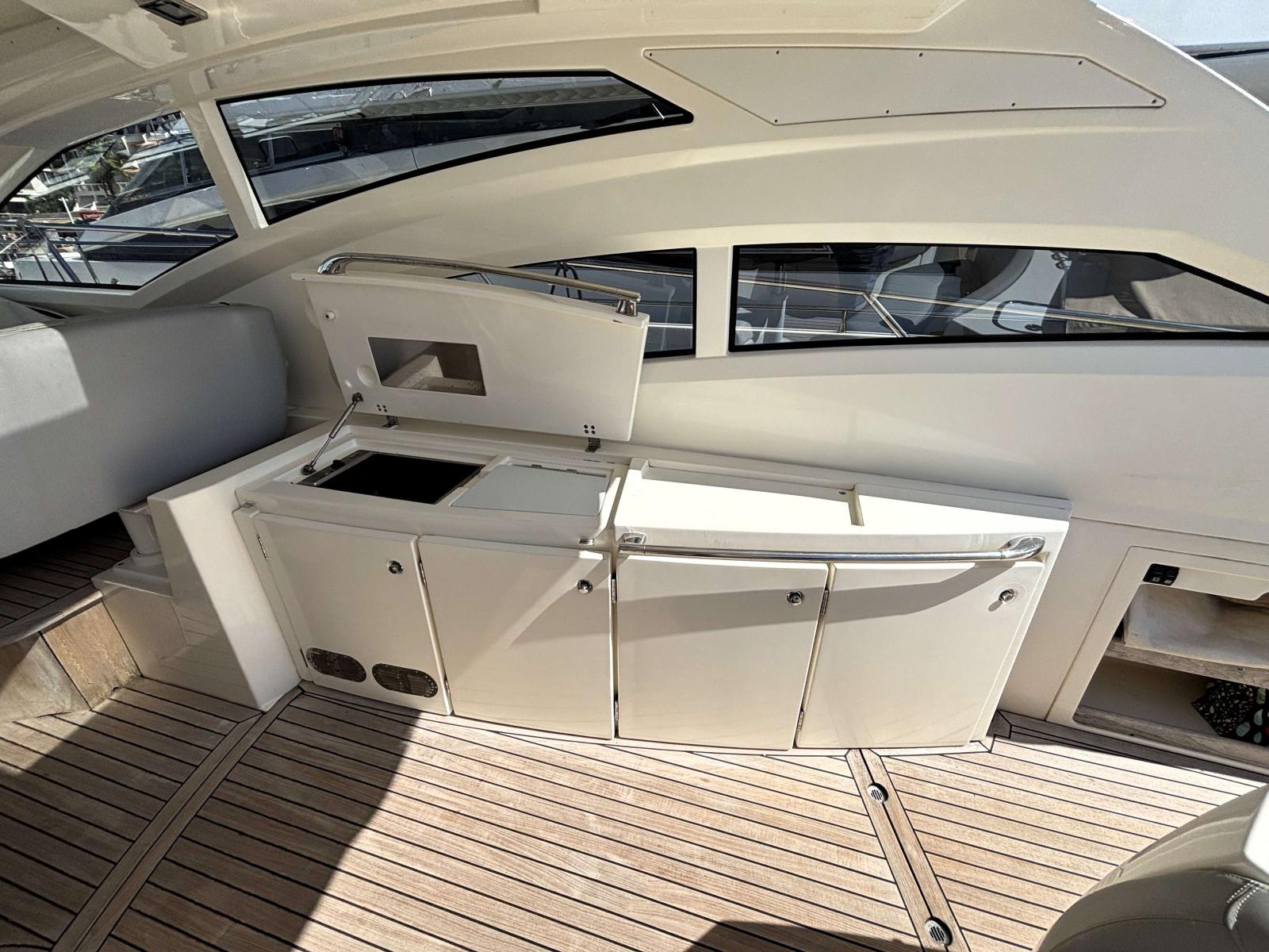 Cuisine extérieure sur tribord avec plancha, réfrigérateur et point d'eau.