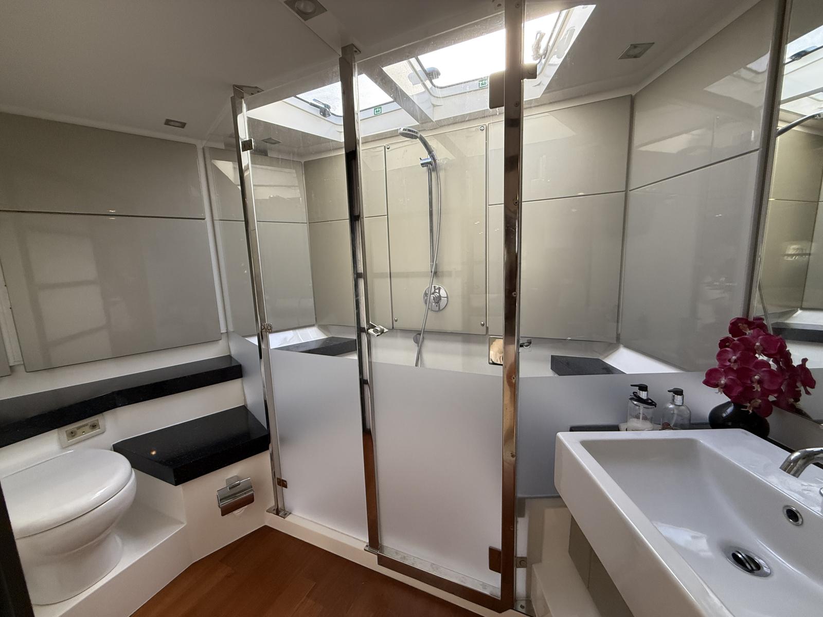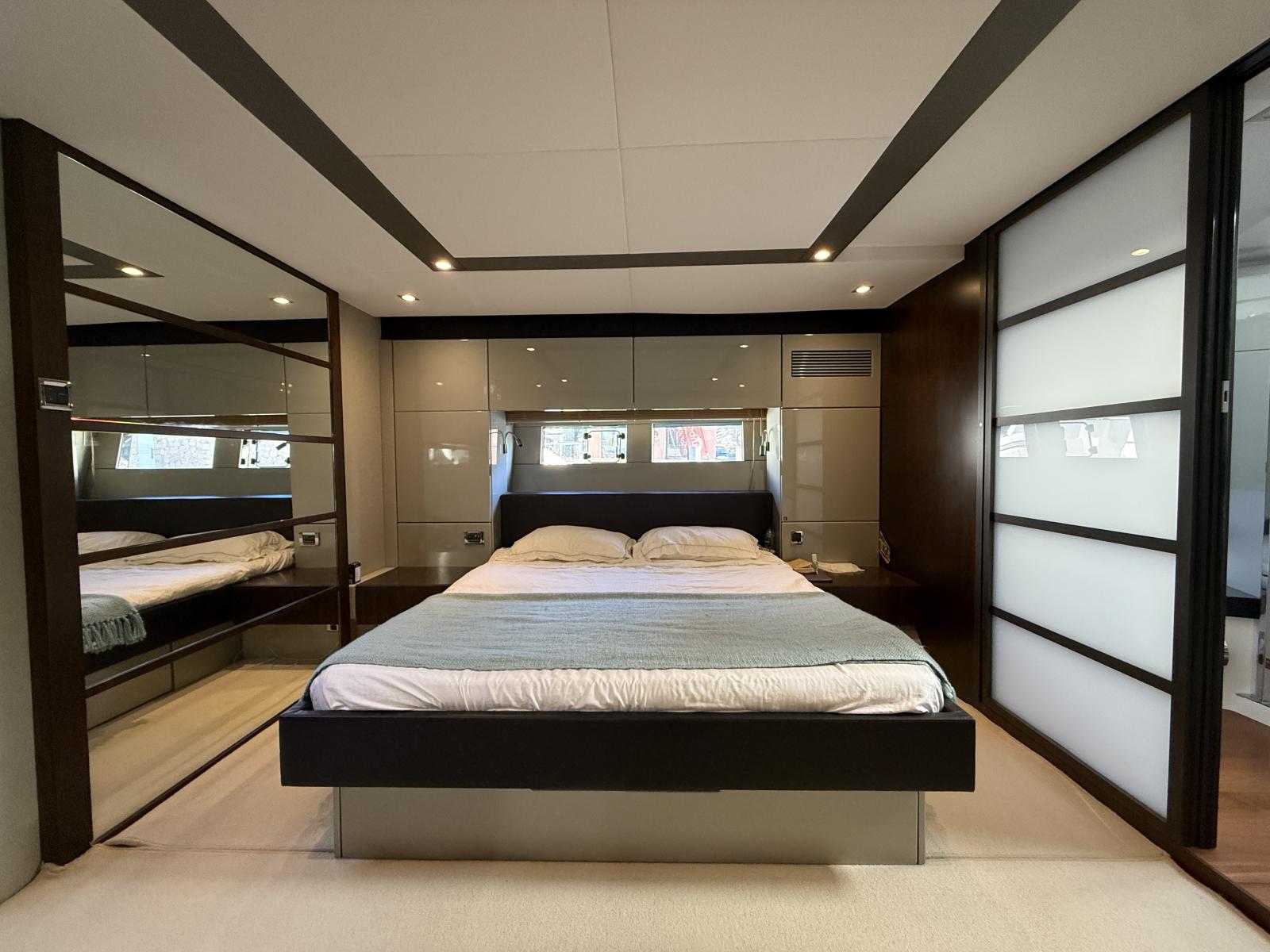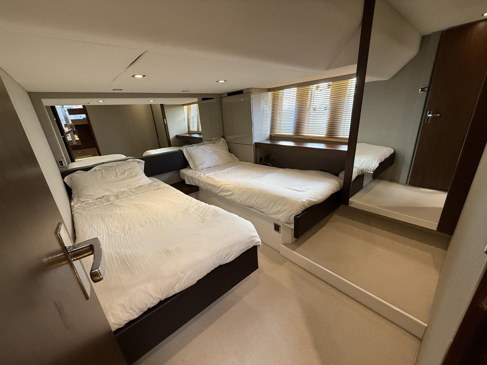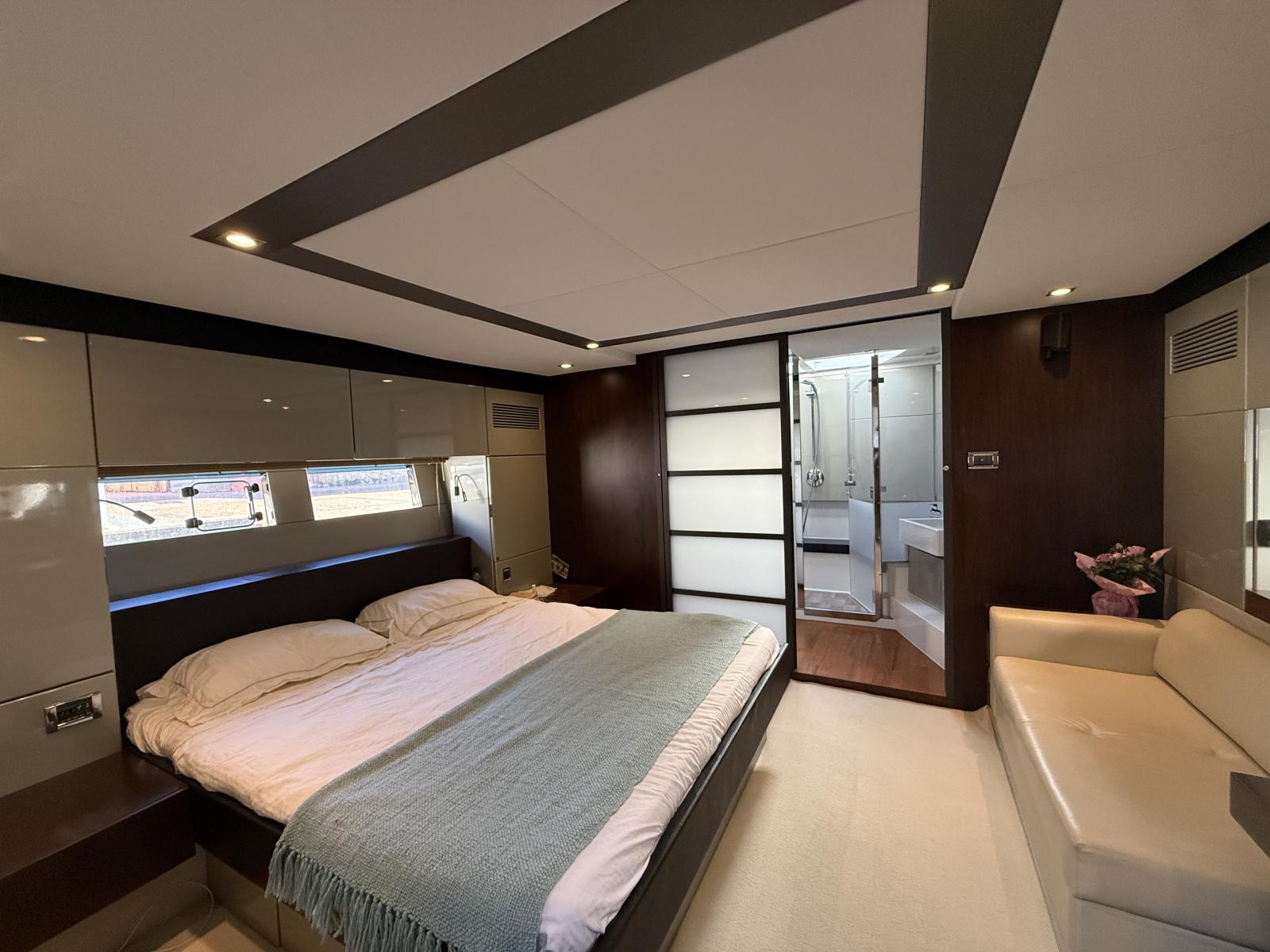 La partie nuit surprend par sa générosité : la master cabine pleine largeur, véritable suite parentale, offre des volumes, une luminosité et un confort dignes d’un yacht bien plus grand. Deux cabines supplémentaires, chacune aménageable en lit double ou lits simples, accueillent les invités dans un esprit de convivialité et d’élégance.